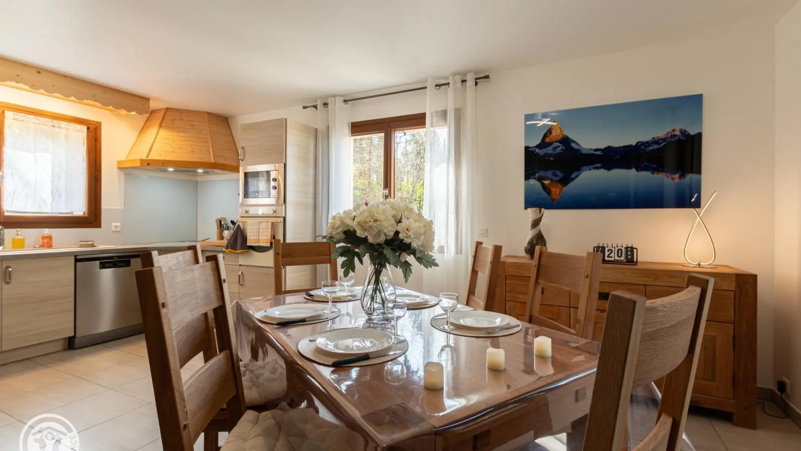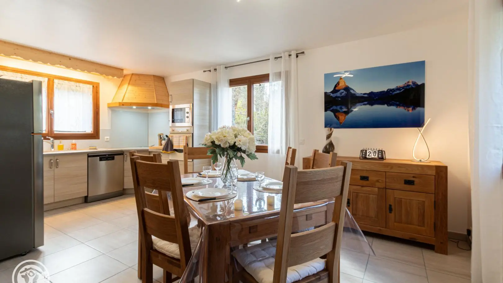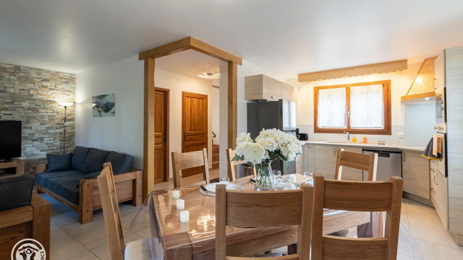 Au rez-de-chaussée, entrée avec rangements donnant sur la pièce à vivre composée d'une cuisine ouverte, d'une partie salle à manger et d'un salon avec TV connectée.