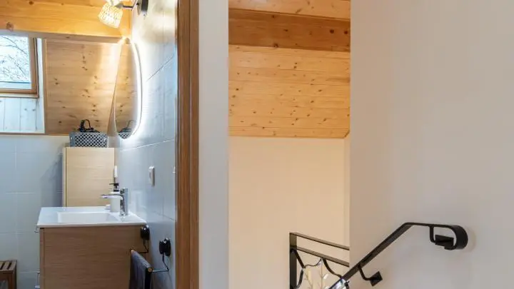 A l'étage, 2 chambres (lit 160x200 cm et 2 lits 90x190 cm + lit d'appoint 80c190 cm) et salle d'eau avec douche, WC, lave-linge.