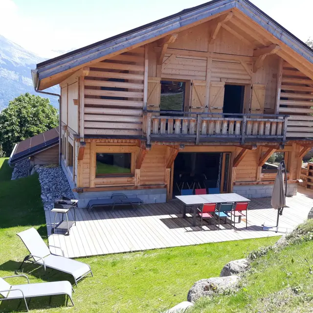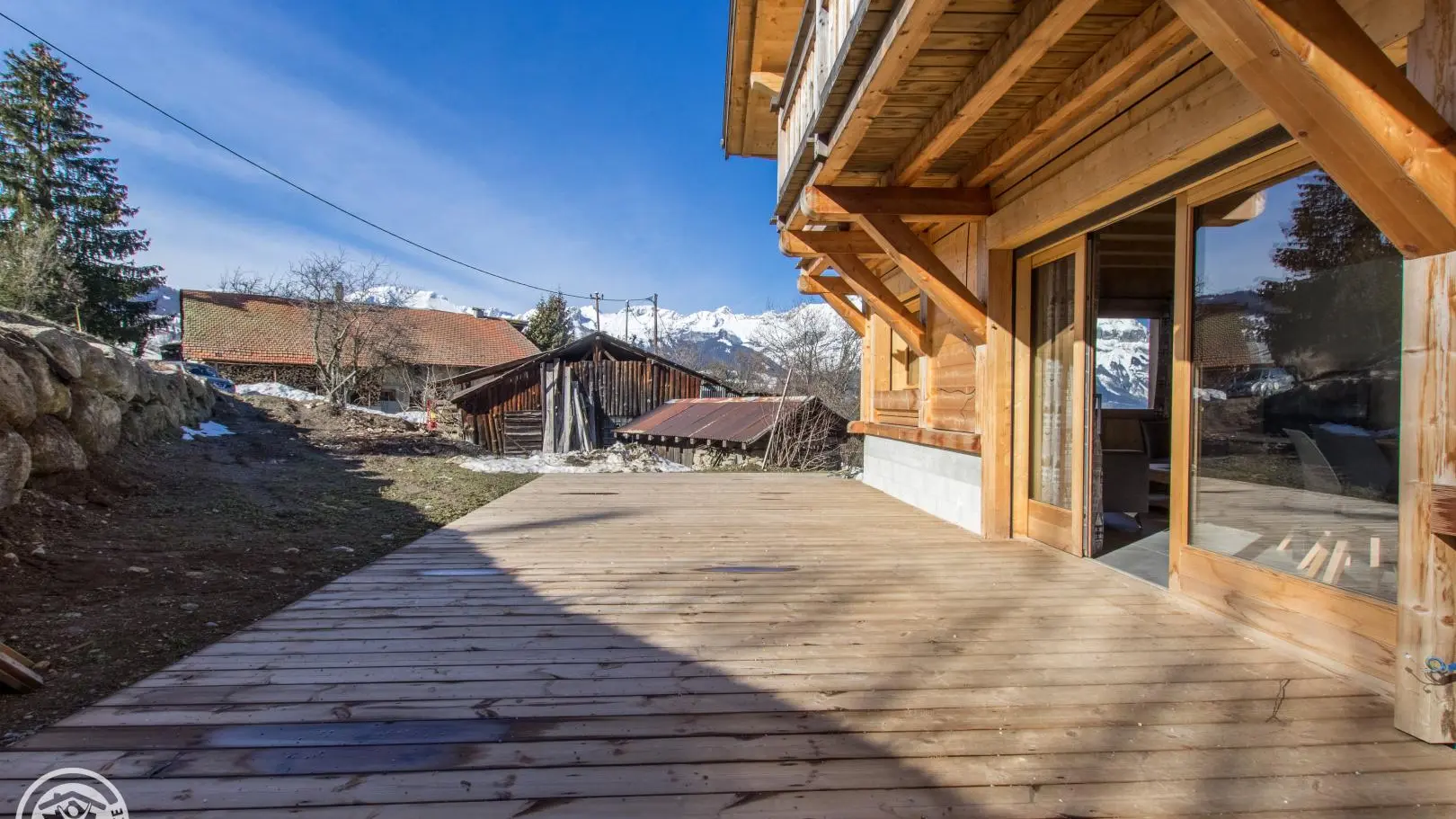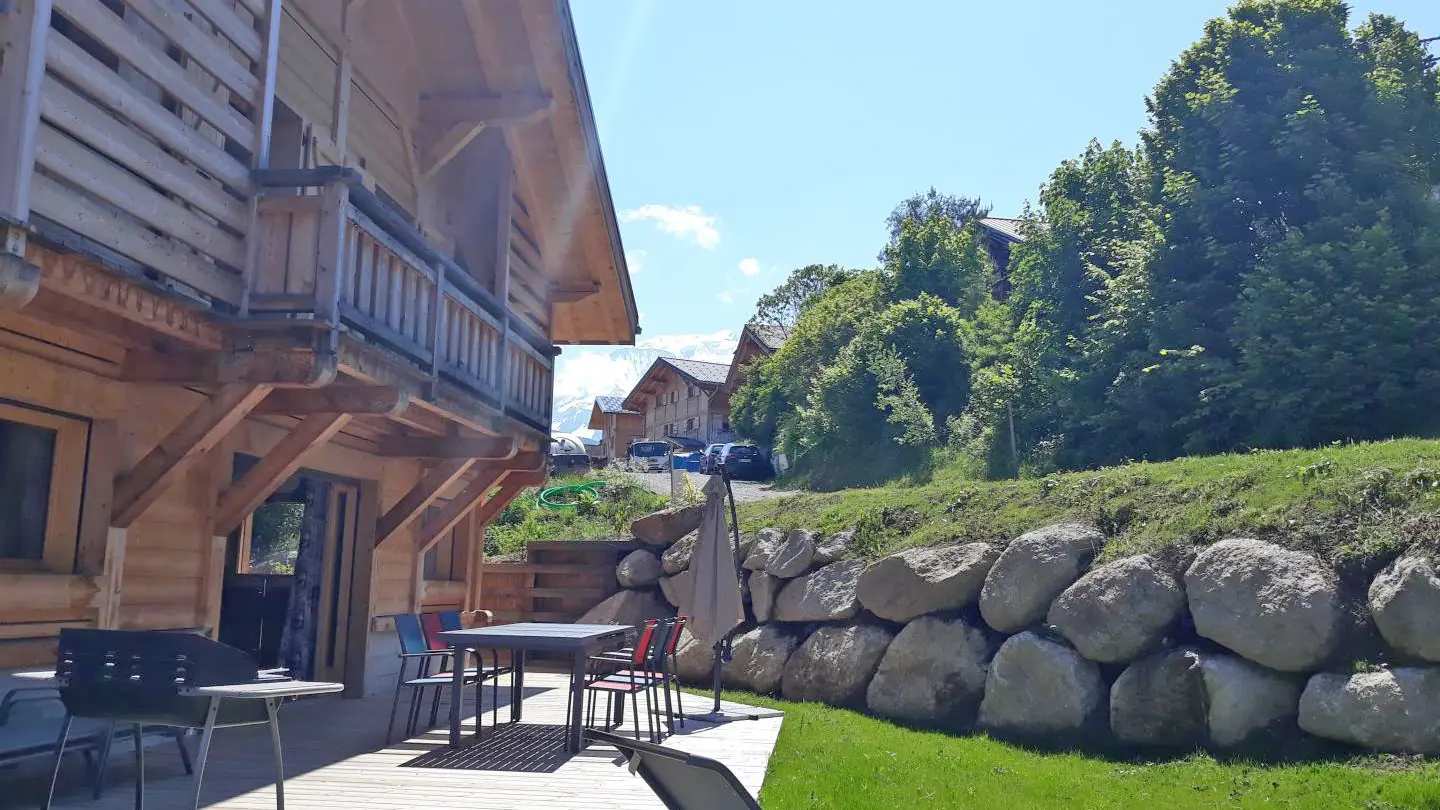 Terrasse Sud-Ouest avec mobilier de jardin, parasol, transats et barbecue. Domaine skiable de Megève/Saint-Gervais à 2km (télécabine de la Princesse), station de Combloux à 5,5km (parking du Cuchet ou télécabine du Jaillet).