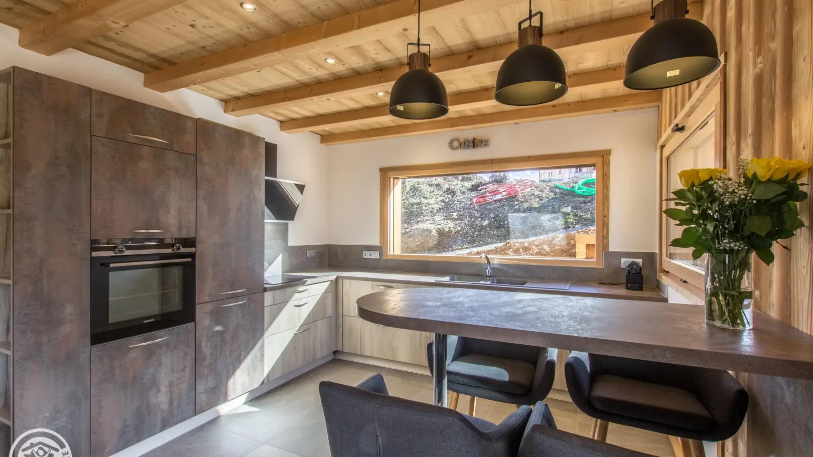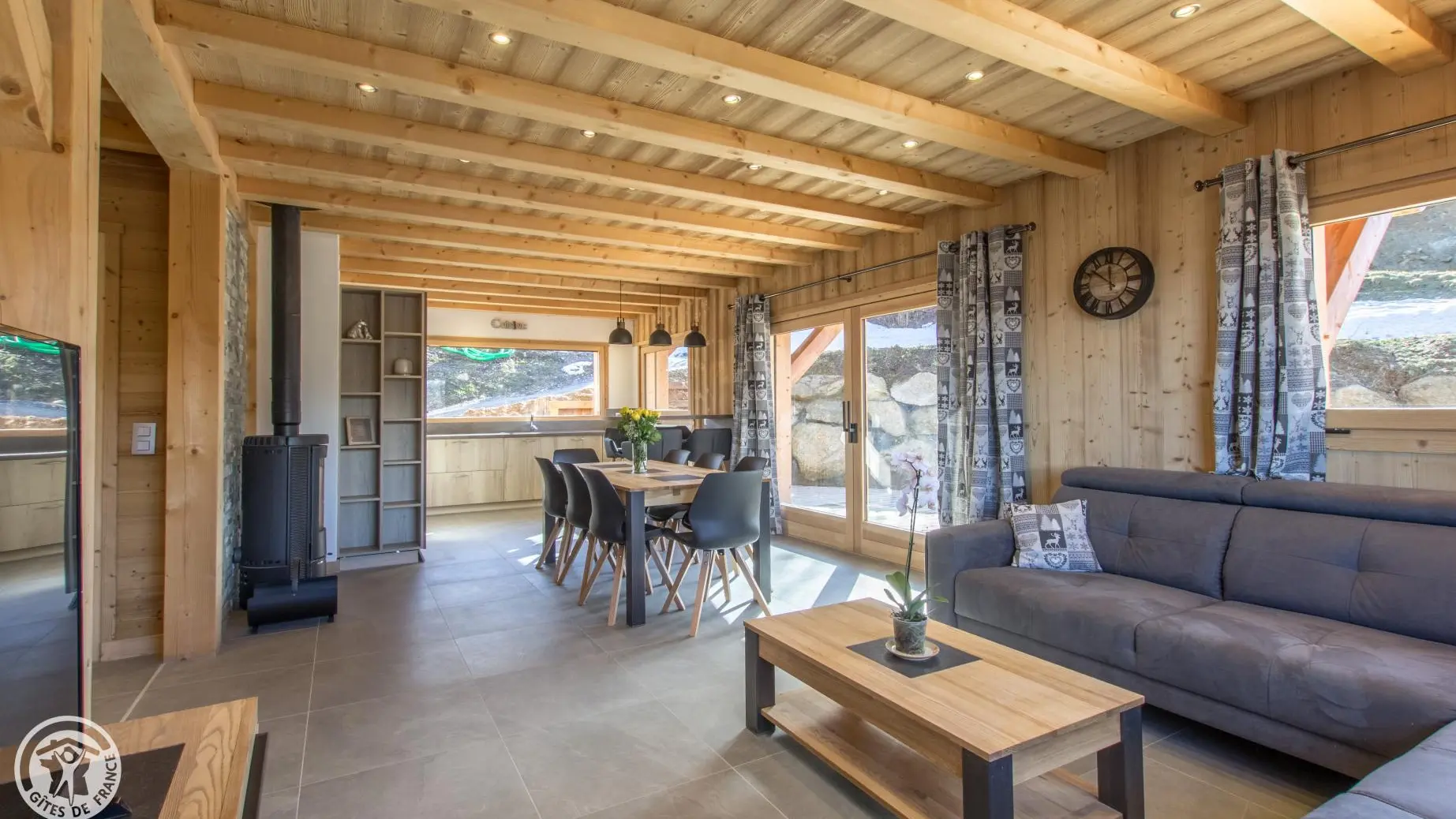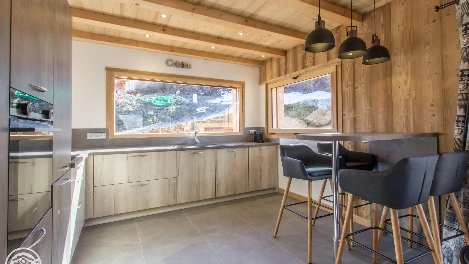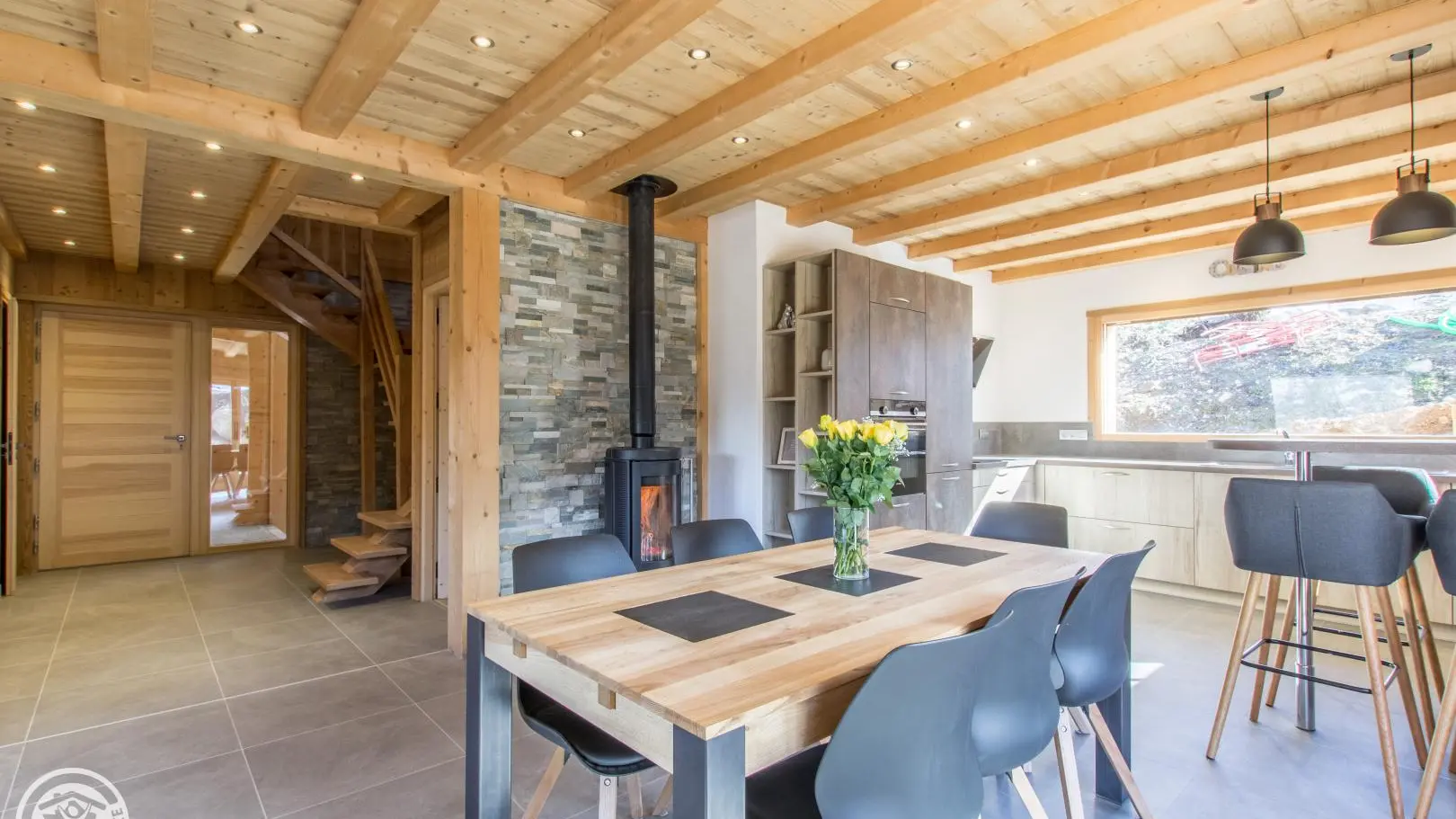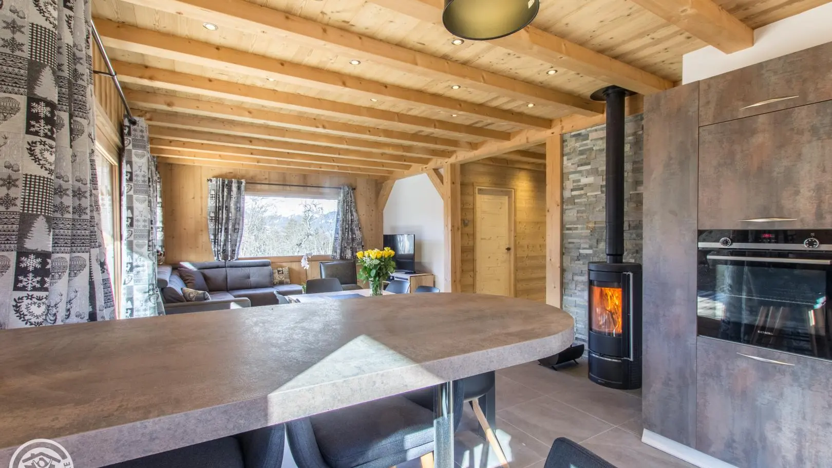 Au rez-de-chaussée (accès par quelques marches, ou de plain-pied depuis la terrasse) : Cuisine intégrée ouverte sur séjour (poêle à bois, Tv, canapé), chambre 1 (1 lit 160x200cm, dressing, salle d'eau avec douche à l'italienne, wc), buanderie, wc indépendant.