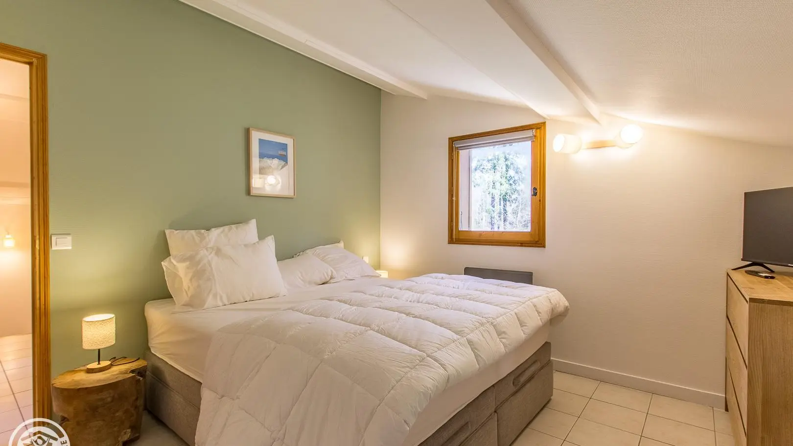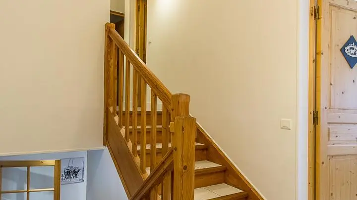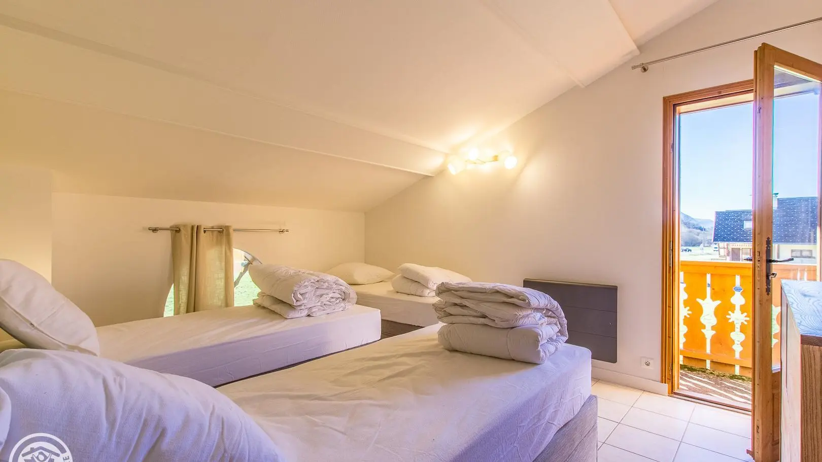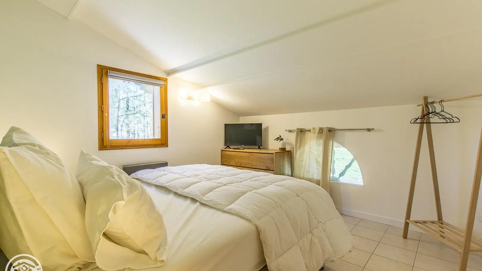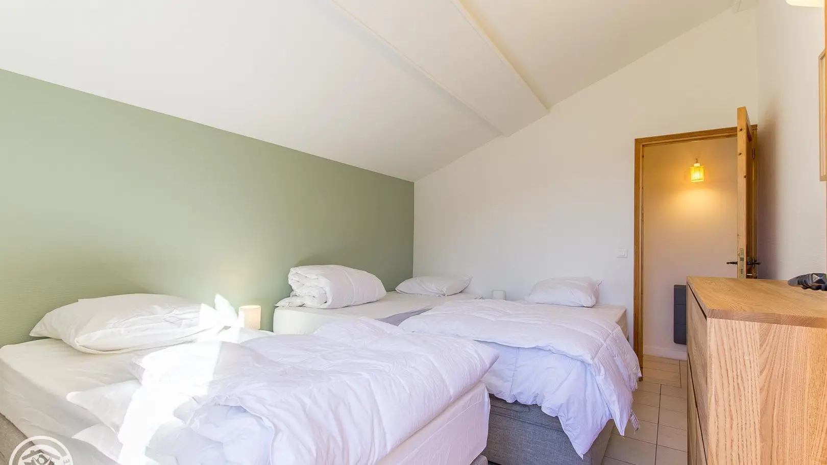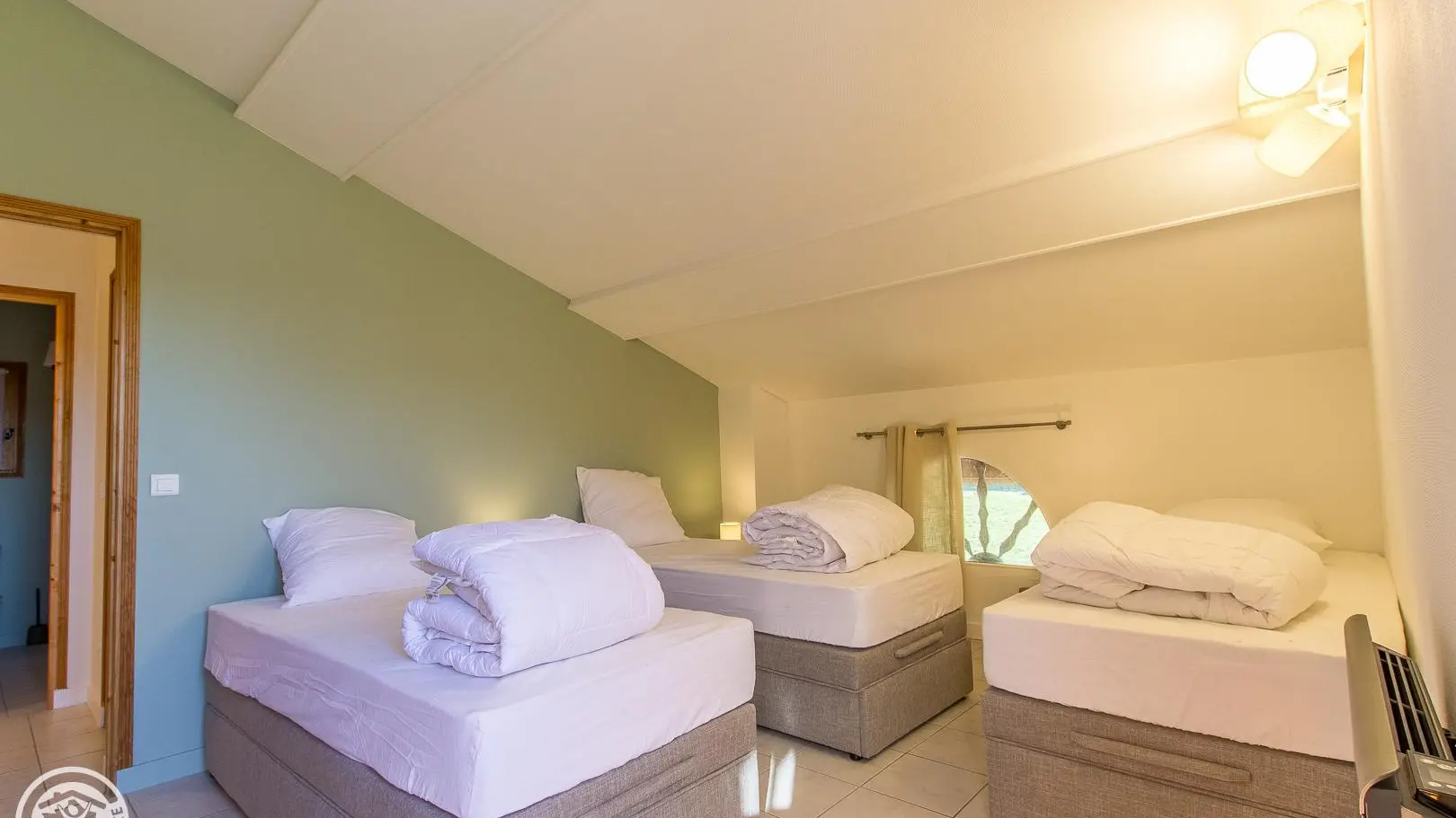 Au 1/2 niveau supérieur : salle de bains (baignoire d'angle), chambre 1 (1 lit grande dimension 180x200cm, Tv). Au 1er étage : chambres 2 et 3 avec pour chacune : 3 lits 90x200cm, chambre 4 (1 lit grande dimension 180x200cm, Tv), salle d'eau (douche), wc indépendant.