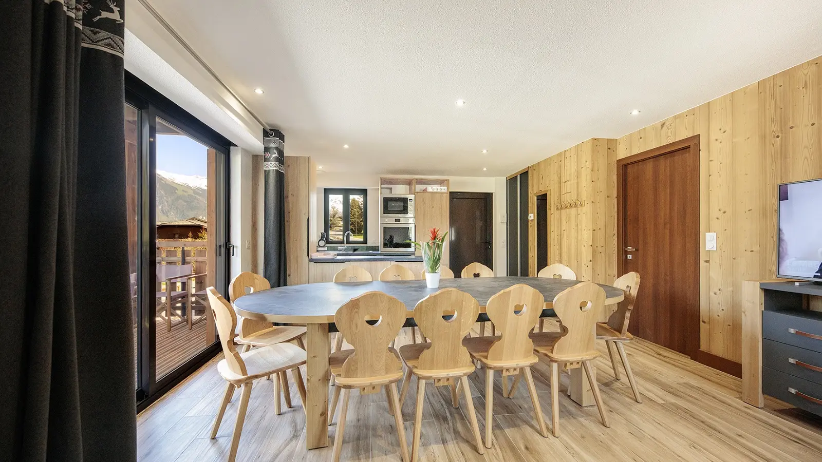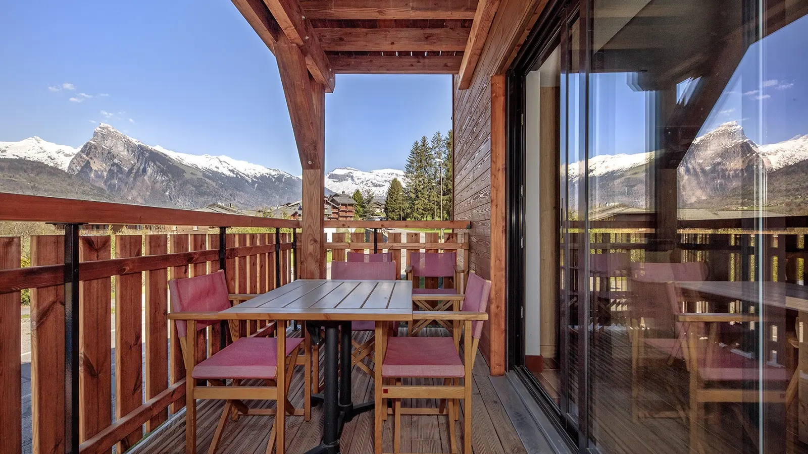 - grand balcon avec table et fauteuils. Vue magnifique sur les Dents Blanches, le Criou, le Buet (3096 m)