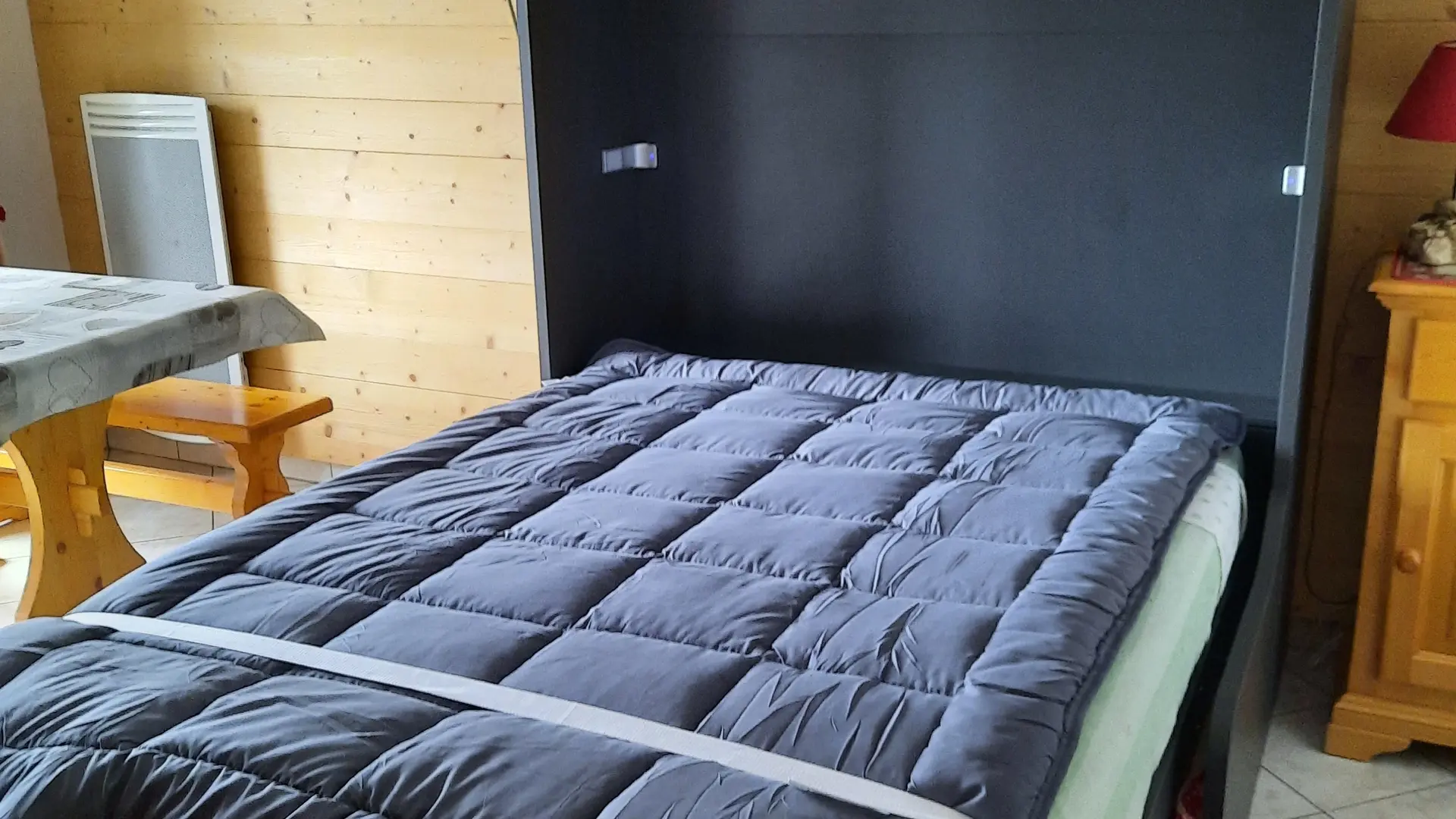 Lit escamotable 140 x 200 pour 2 personnes faisant également office de canapé.