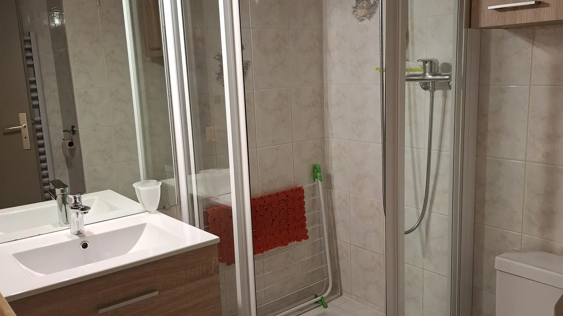 Salle de bains avec douche, sèche serviettes électrique et WC intérieur. Sèche-cheveux.