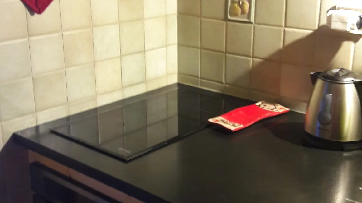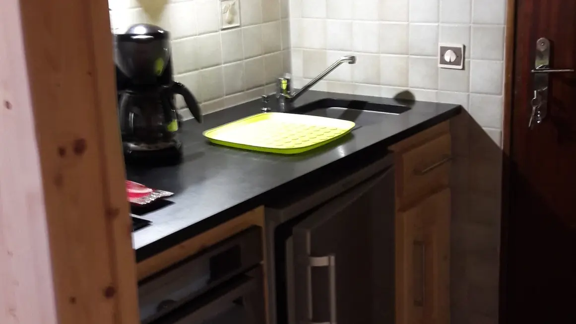 Coin cuisine avec plaque 2 feux vitrocéramique, four combiné micro ondes, frigo, bouilloire, grille pain, cafetière.