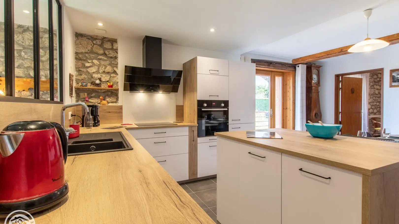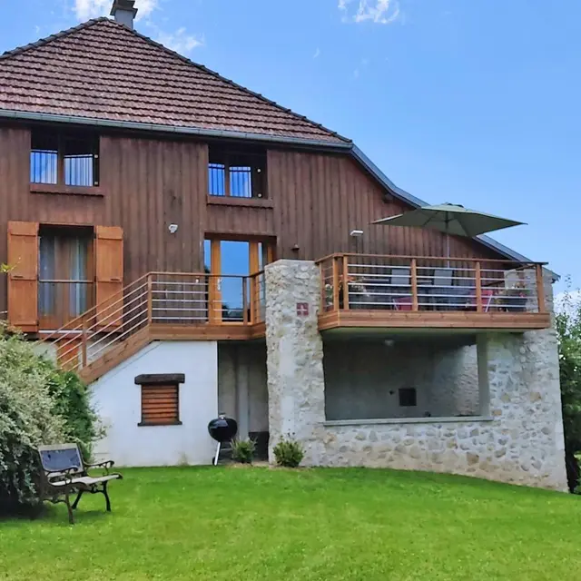Au 1er étage d'une ancienne ferme traditionnelle rénovée comprenant 2 gites indépendants et le logement des propriétaires. Gîte de 117 m² pouvant accueillir jusqu'à 9 personnes. Cuisine spacieuse avec table modulable, ouverte sur séjour (TV, canapé d'angle, accès par 3 marches). 3 chambres disposant chacune d'une salle d'eau et de WC séparés. Chambre 1 (2/3 personnes) : niveau de l'entrée avec 1 lit 160x200 et 1 lit 90x190 (4 marches). A l'étage, chambre 2 (2 personnes) : avec 1 lit 160x200 cm, chambre 3 : chambre familiale (2/4 personnes) avec 4 lits 90x190cm - dont 2 jumelables - et espace détente (canapé, table basse et fauteuils). Jardin avec verger et coin pique-nique, jeux de boules. Grande terrasse indépendante. Poêle à bois. Wifi.