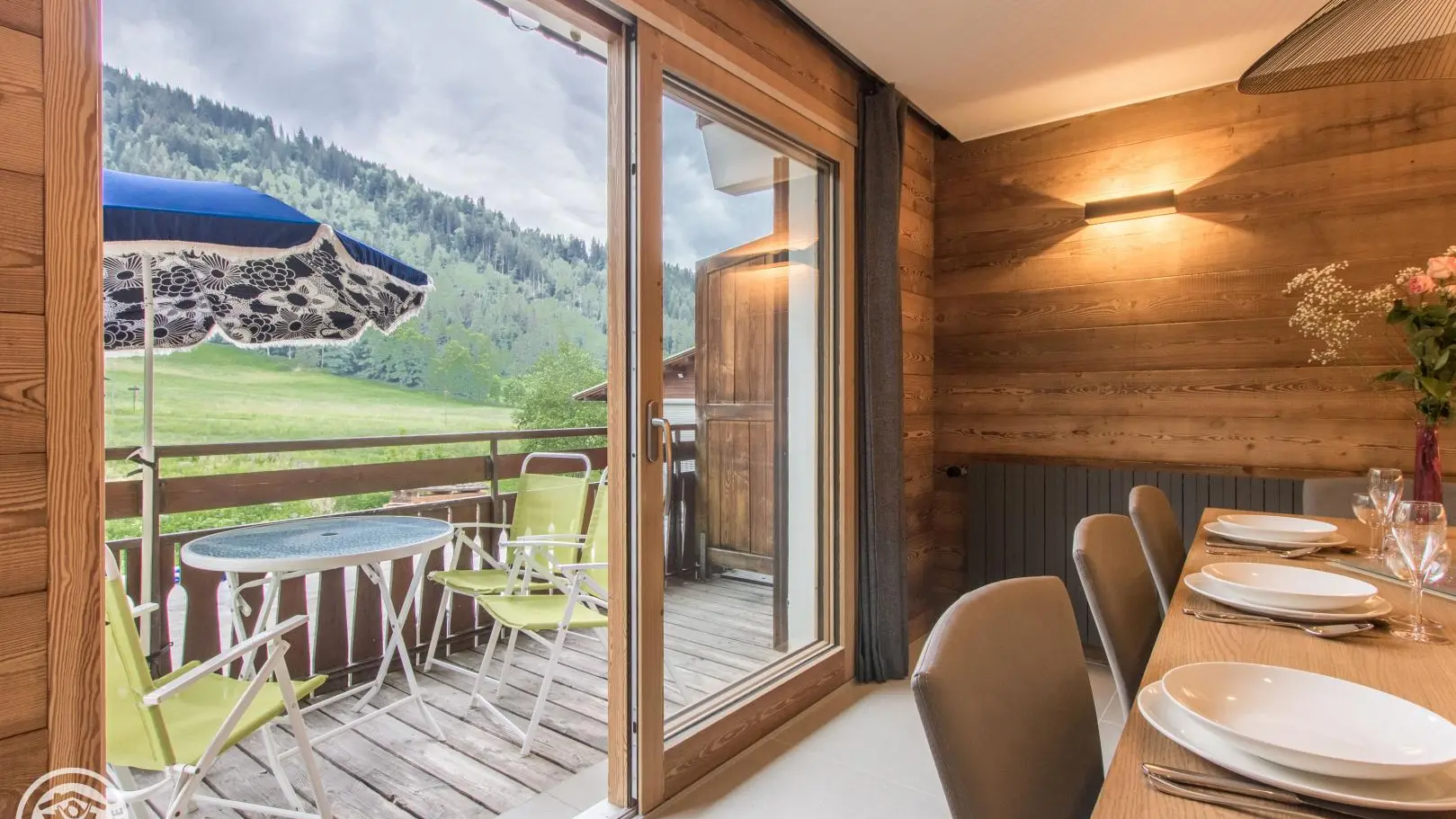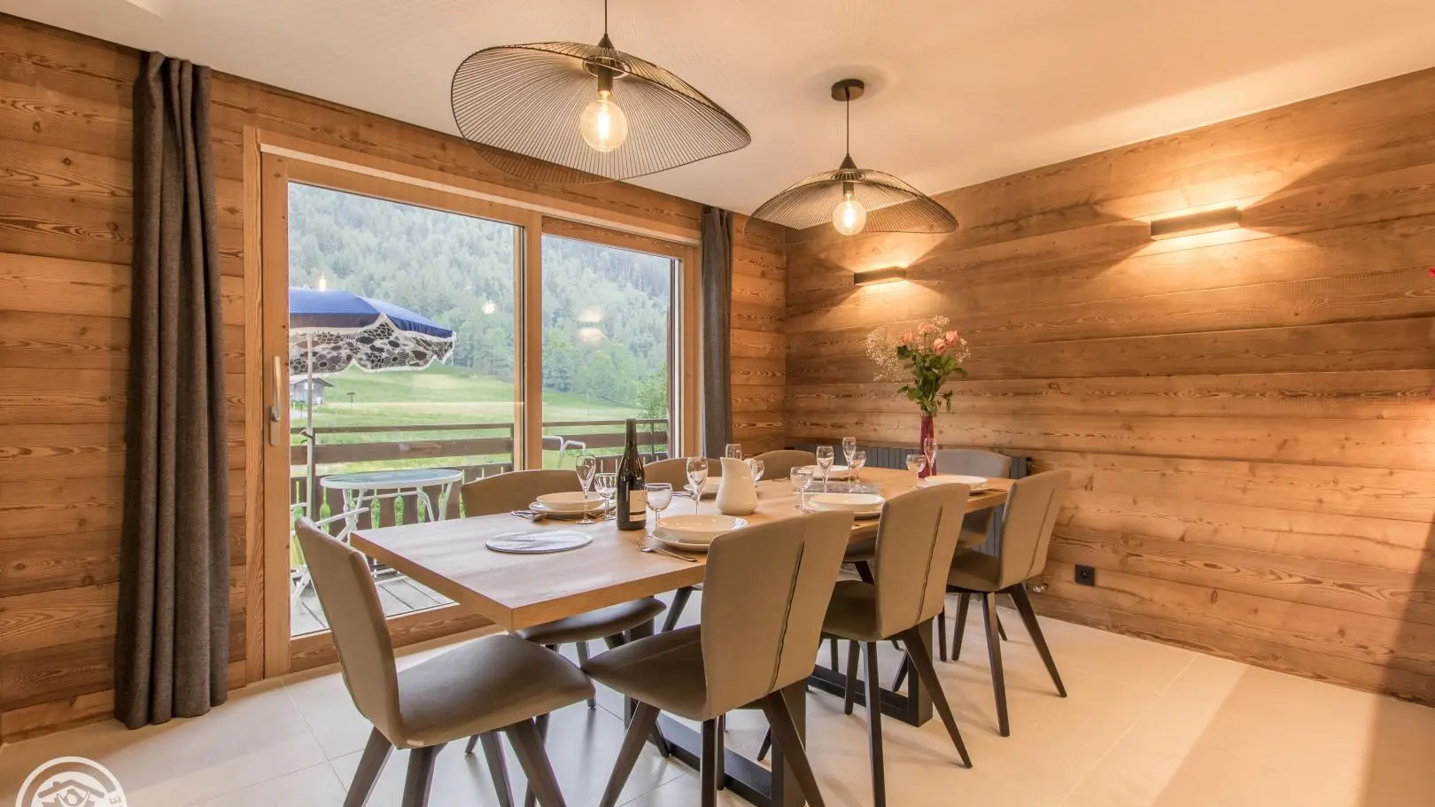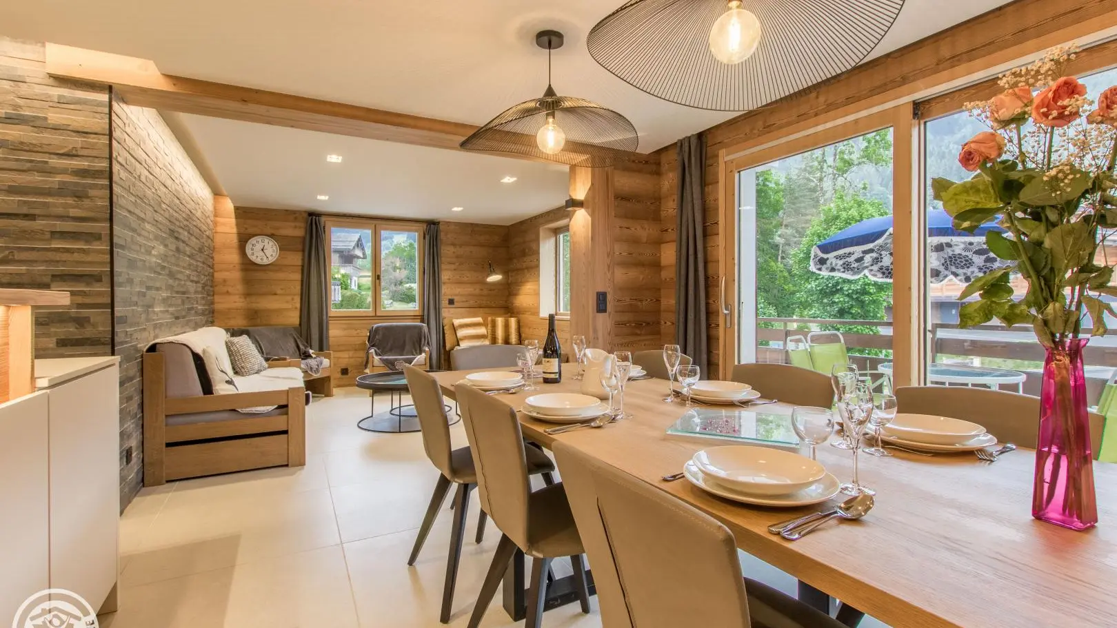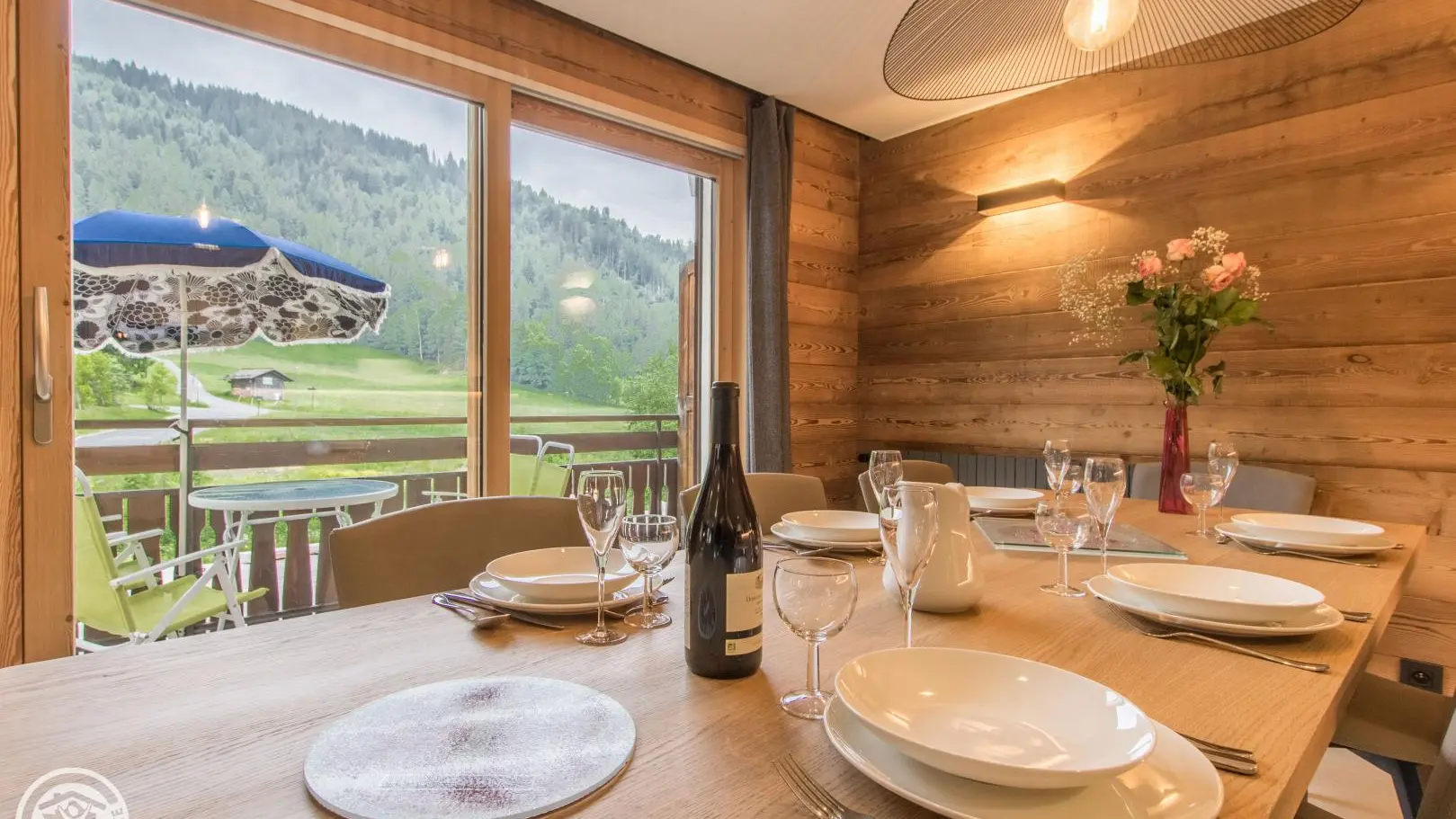 Appartement de 82m² offrant de belles prestations (aménagé par un architecte d'intérieur) avec son ambiance mêlant bois et contemporain. Le gîte est au rez-de-chaussée (plain-pied) d'un chalet comprenant également l'habitation des propriétaires et une autre location. Capacité jusqu'à 6 personnes (sur demande pour la 6ème personne).
