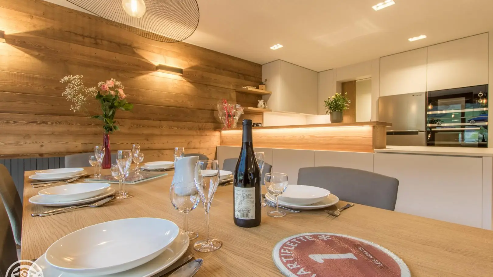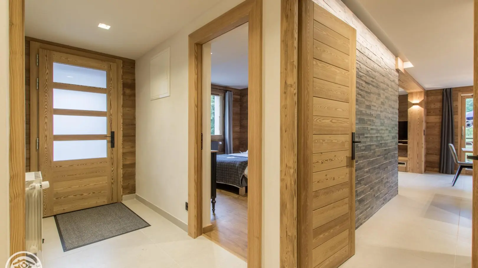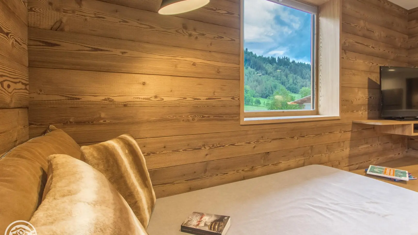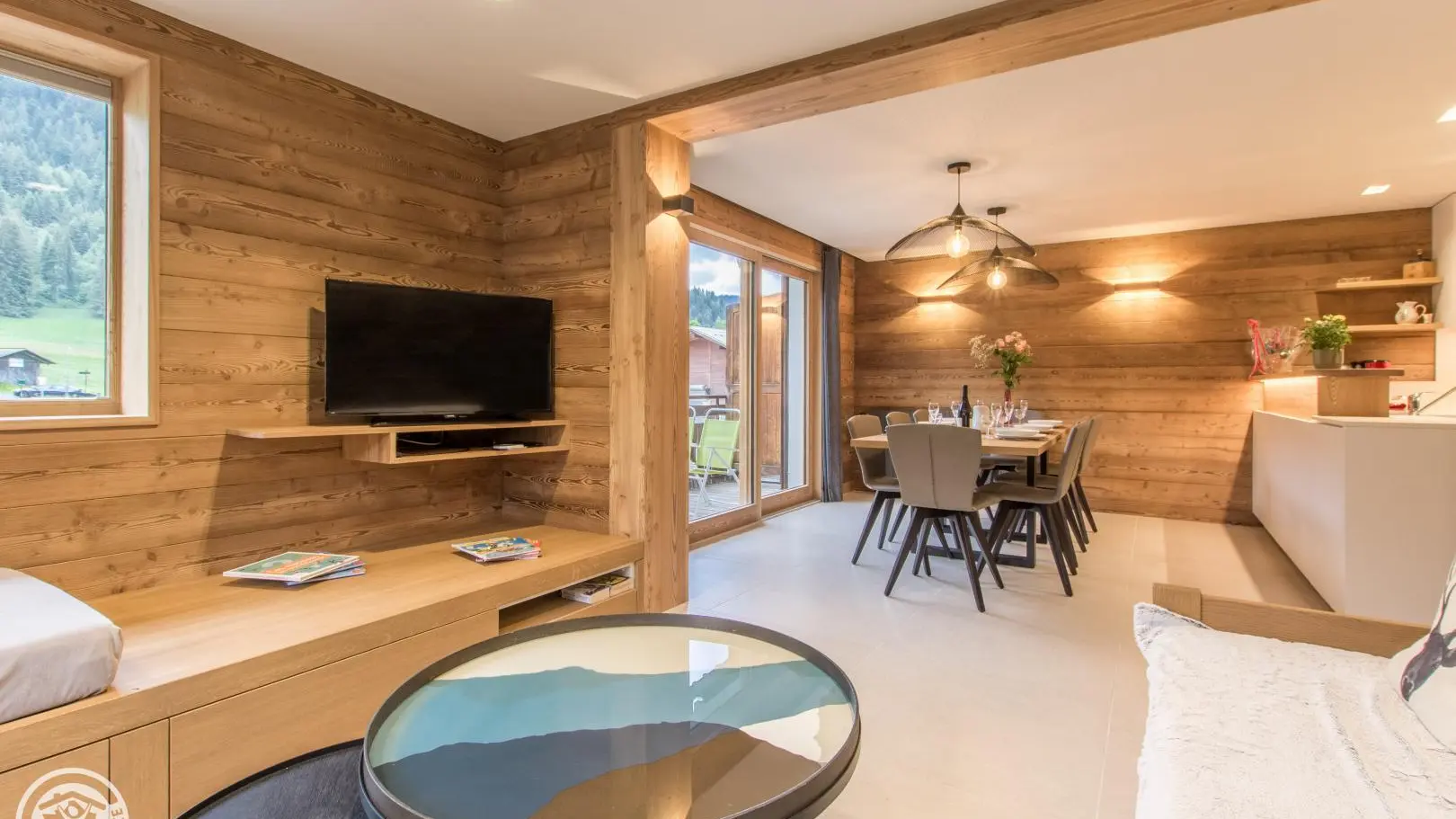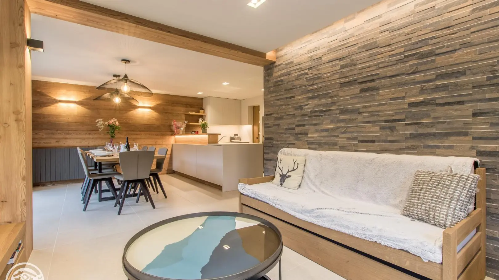Appartement de 82m² offrant de belles prestations (aménagé par un architecte d'intérieur) avec son ambiance mêlant bois et contemporain. Le gîte est au rez-de-chaussée (plain-pied) d'un chalet comprenant également l'habitation des propriétaires et une autre location. Capacité jusqu'à 6 personnes (sur demande pour la 6ème personne).