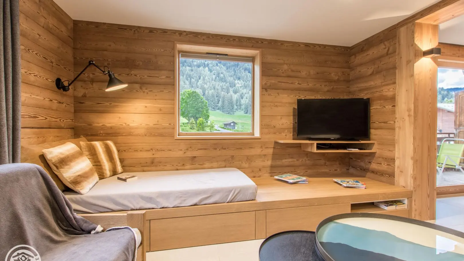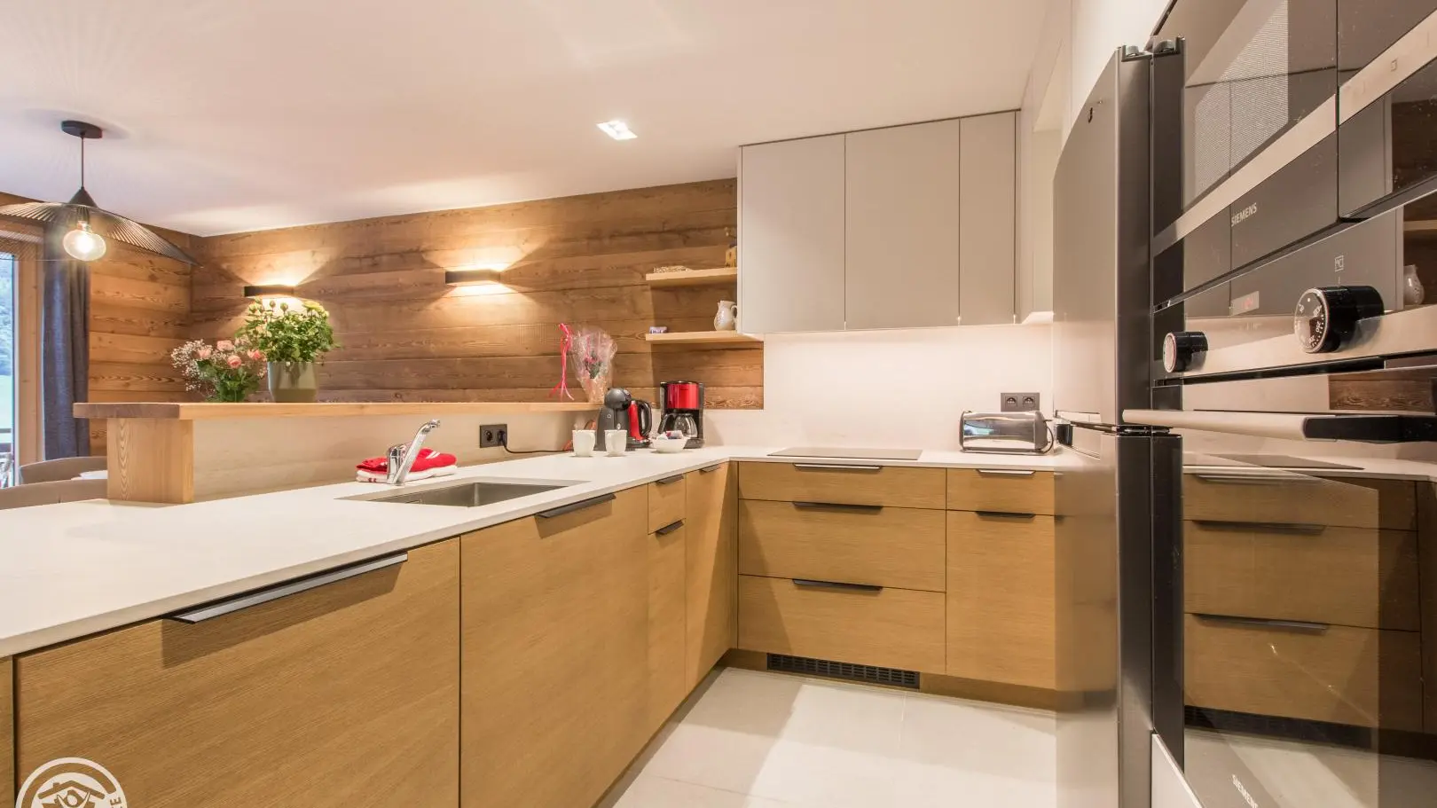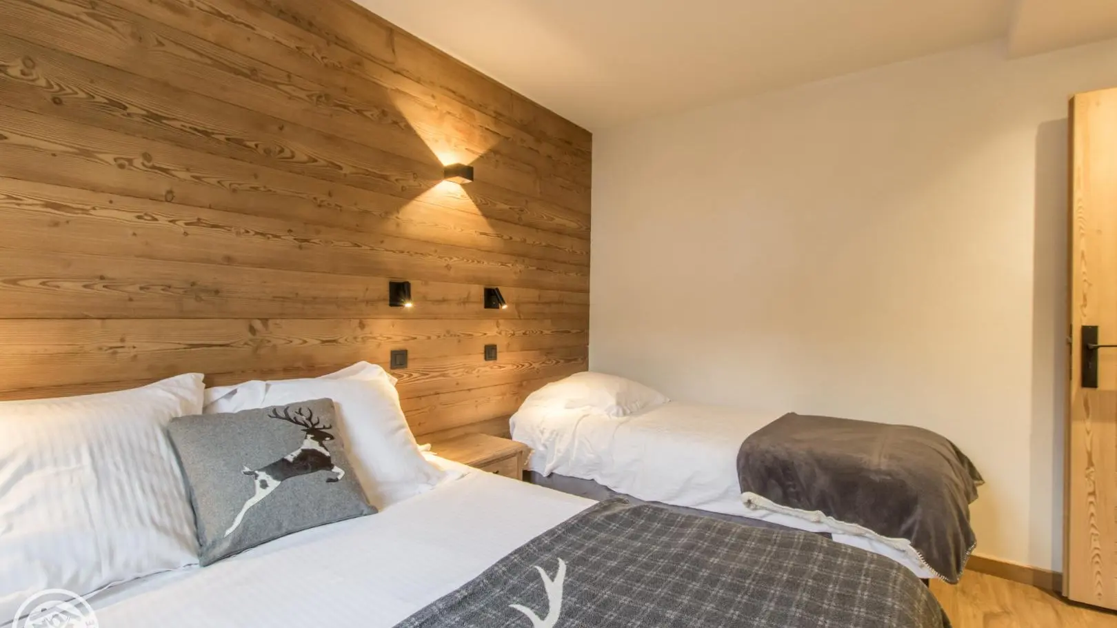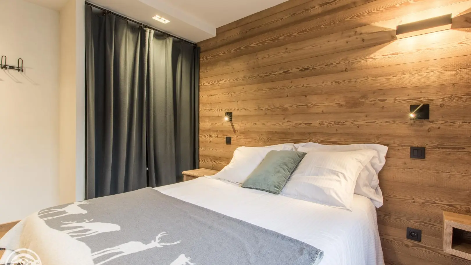 Appartement de 82m² offrant de belles prestations (aménagé par un architecte d'intérieur) avec son ambiance mêlant bois et contemporain. Le gîte est au rez-de-chaussée (plain-pied) d'un chalet comprenant également l'habitation des propriétaires et une autre location. Capacité jusqu'à 6 personnes (sur demande pour la 6ème personne).