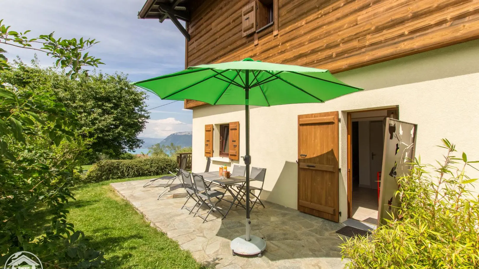Gîte de 47m² aménagé au rez-de-jardin (plain-pied) du chalet du propriétaire. Vue sur le Lac d'Annecy et les montagnes. Terrasse et jardin. Cuisine équipée, séjour avec canapé convertible clic-clac (couchage 2 personnes), télévision. Chambre avec 1 lit 160x200cm. Salle d'eau : douche, lavabo, sèche-serviettes. WC indépendant. Lave-linge séchant commun dans le garage du propriétaire (accessible directement depuis le gîte).