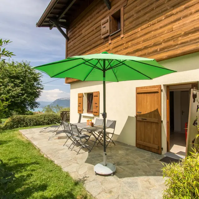 Terrasse avec mobilier de jardin, vue sur le lac d'Annecy, jardin. Terrain commun avec le propriétaire, barbecue, chaises longues, terrain de pétanque, ping-pong. 1 seule place de parking dans la propriété. Le linge pour les lits et le linge de toilettes (serviettes) sont fournis.