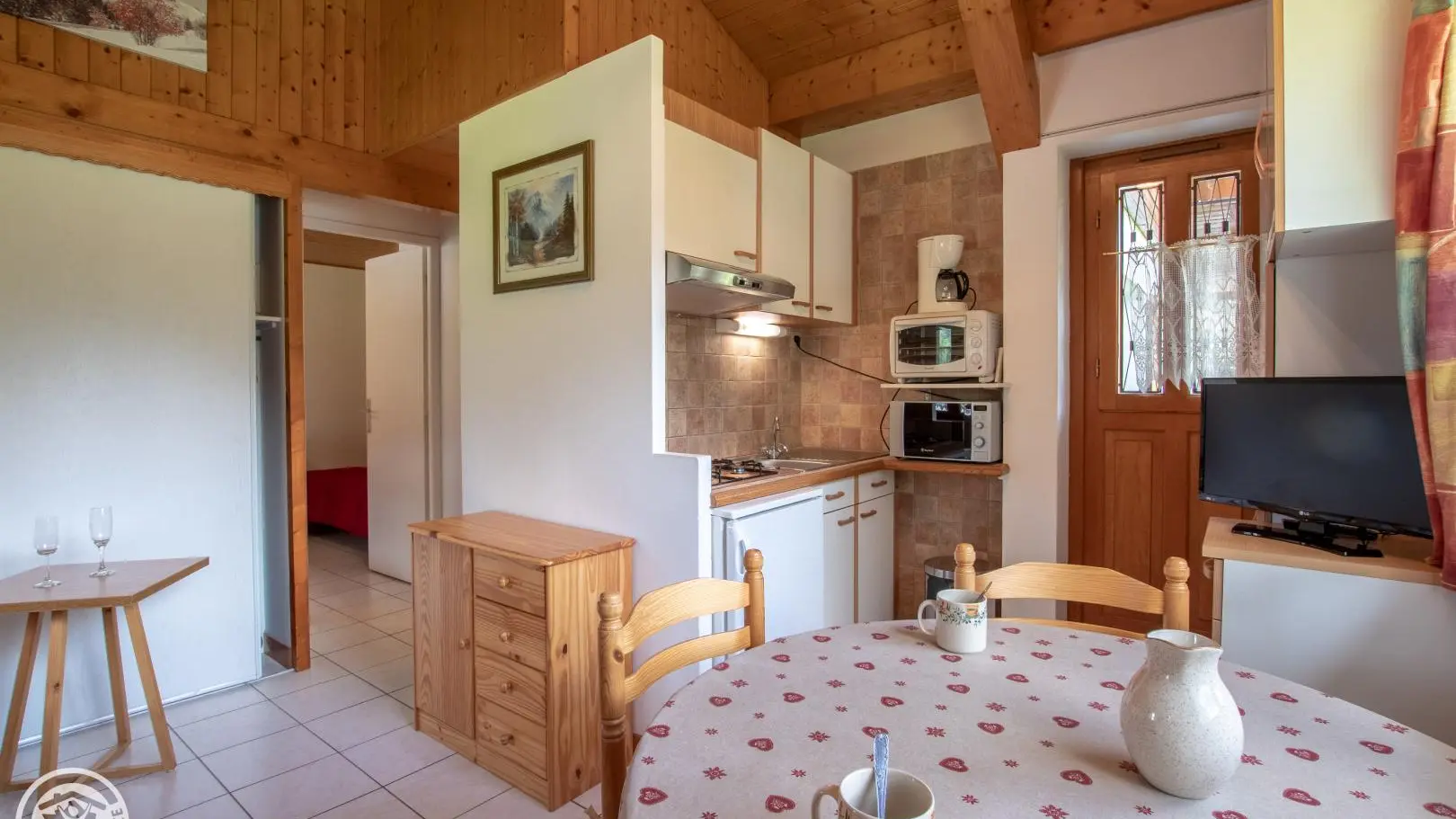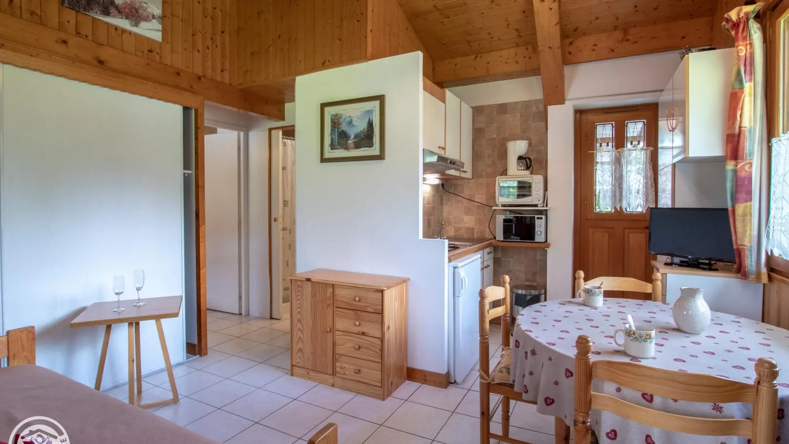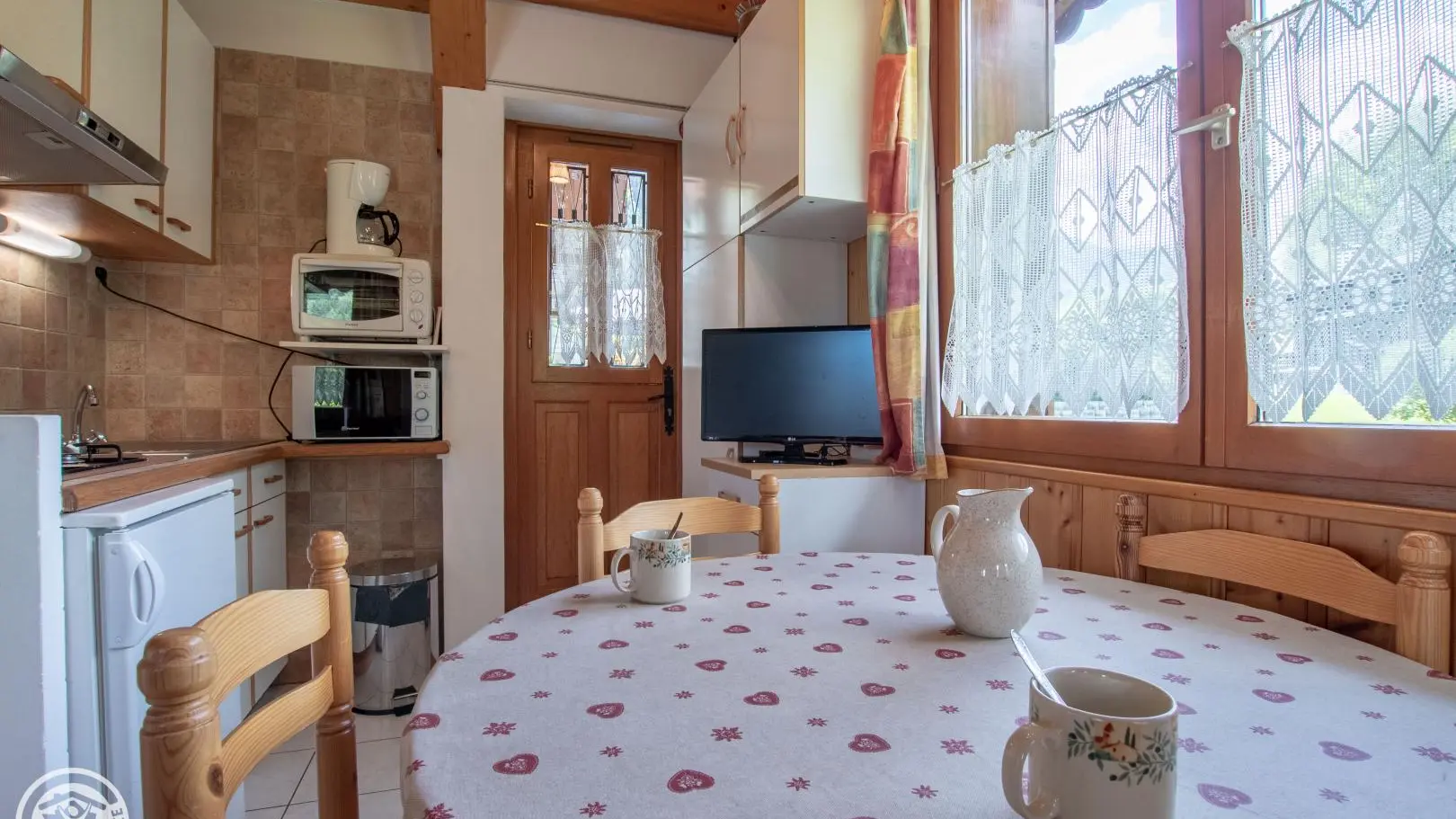 2nd gîte de 24 m2 (donnant côté jardin) au 1er étage (entrée indépendant) d'un chalet comprenant 2 gîtes et le logement des propriétaires. Au pied du Massif du Mont-Blanc, à proximité du centre de la station. Coin cuisine ouvert sur séjour, chambre (1 ...