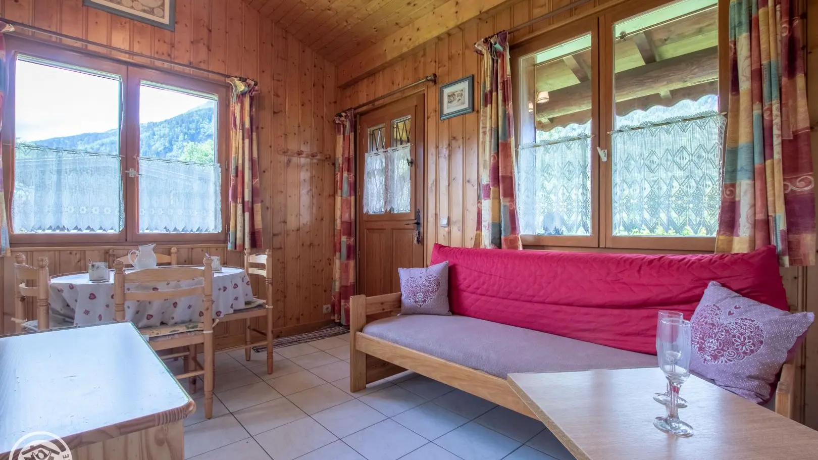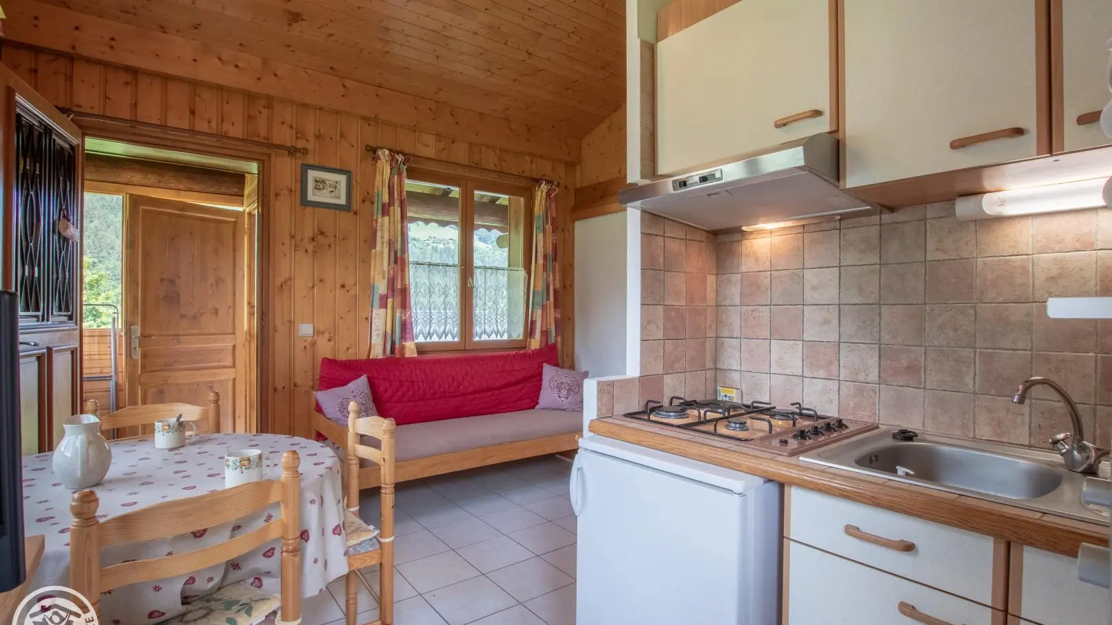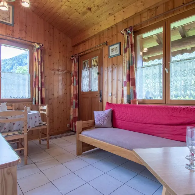 2nd gîte de 24 m2 (donnant côté jardin) au 1er étage (entrée indépendant) d'un chalet comprenant 2 gîtes et le logement des propriétaires. Au pied du Massif du Mont-Blanc, à proximité du centre de la station. Coin cuisine ouvert sur séjour, chambre (1 ...