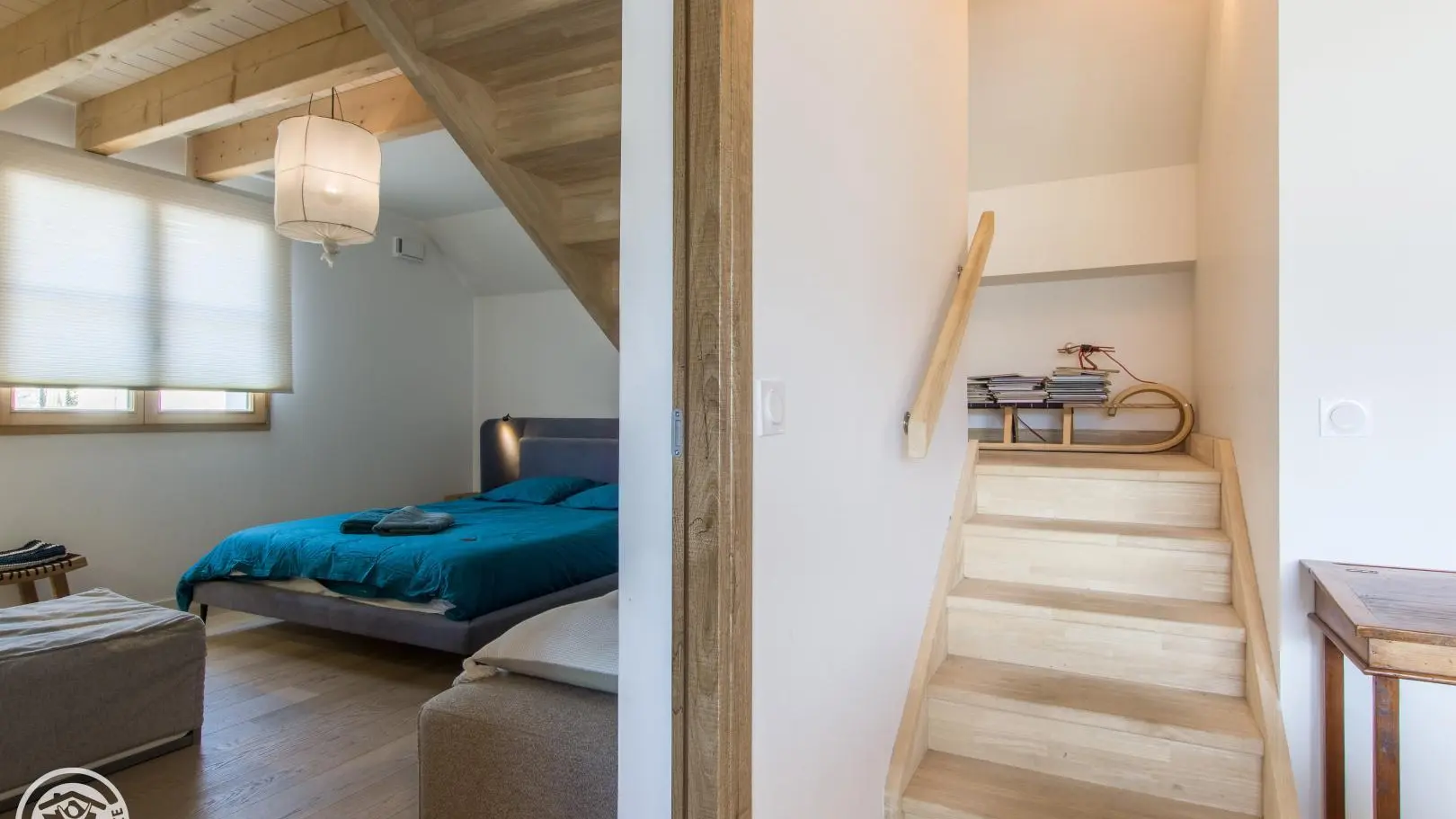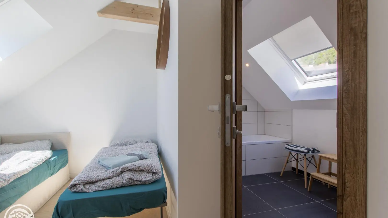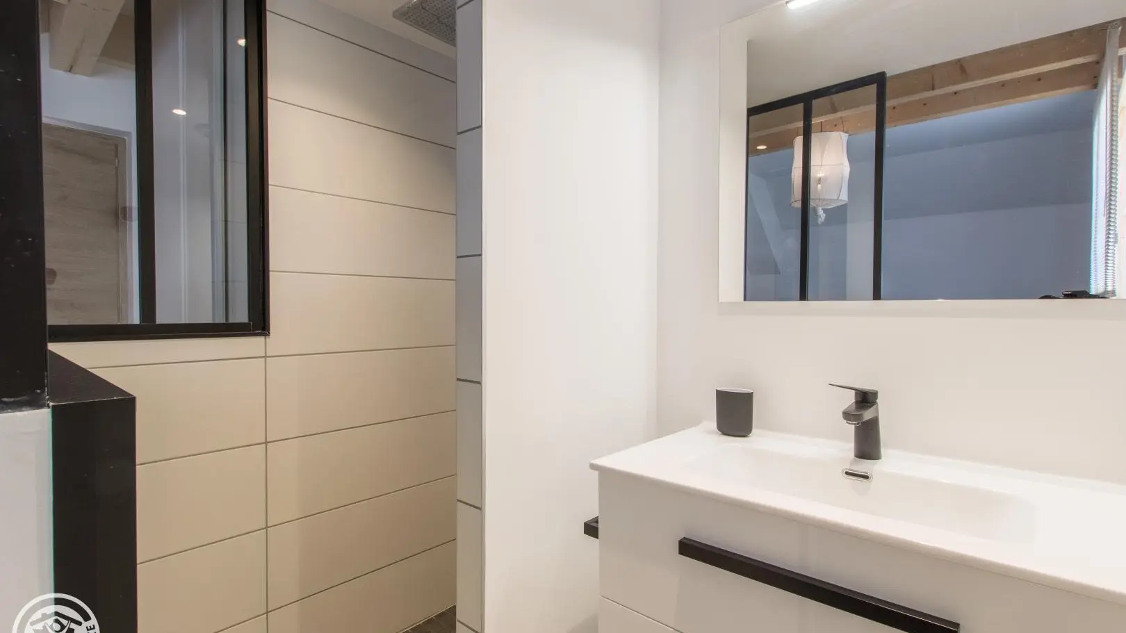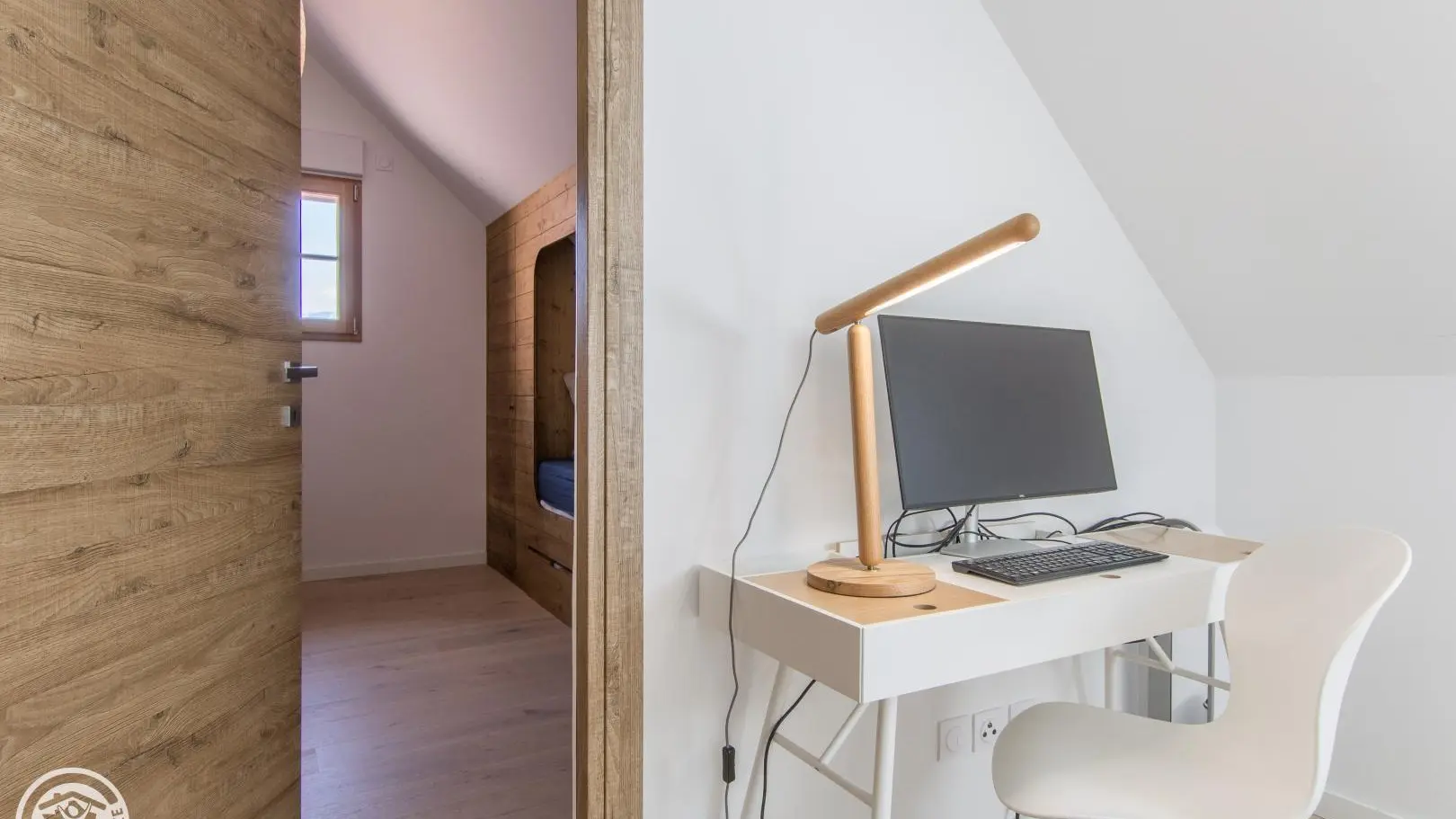 A l'étage : mezzanine avec 2 lits gigognes 80x190cm, bureau. Chambre 2 (1 lit 160x200cm et 1 lit 90c190cm en alcôve + 1 lit 90x190cm dans tiroir), salle de bains (vasque, baignoire, wc).