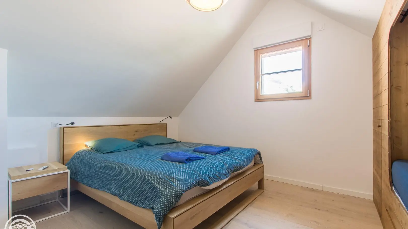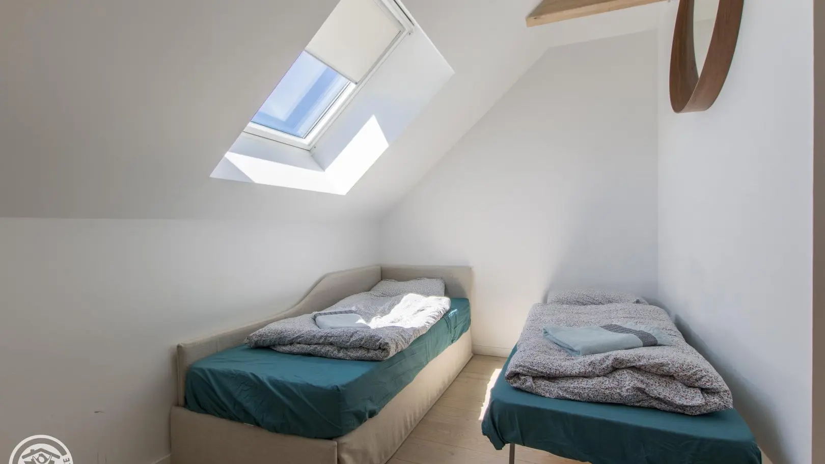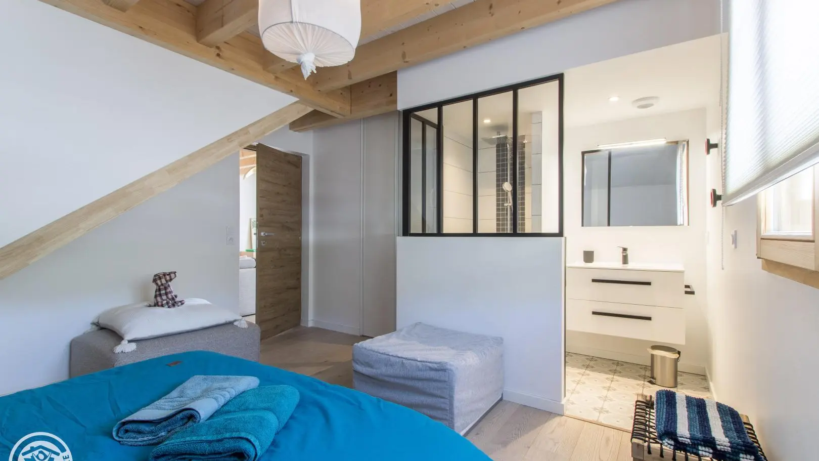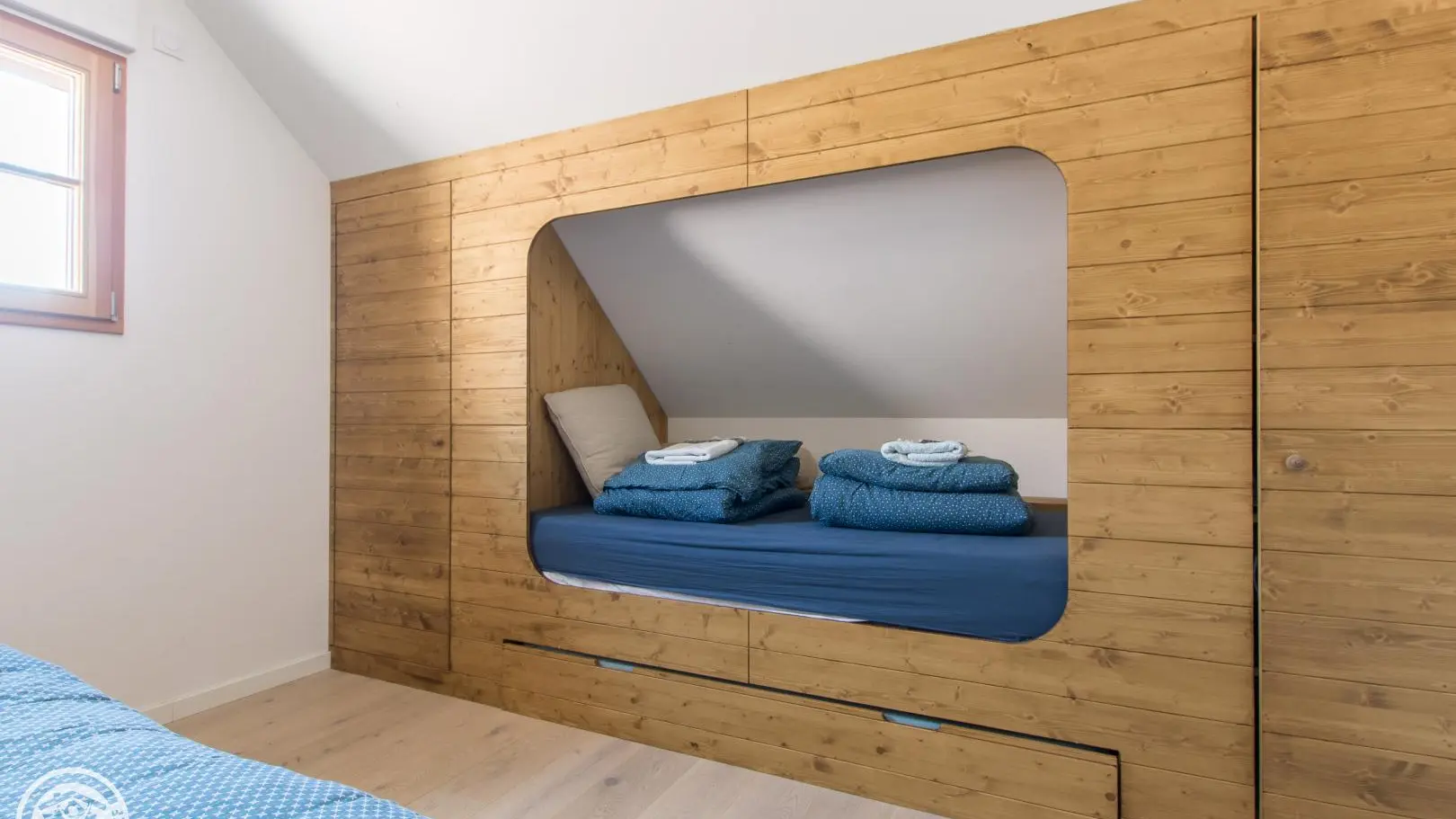 A l'étage : mezzanine avec 2 lits gigognes 80x190cm, bureau. Chambre 2 (1 lit 160x200cm et 1 lit 90c190cm en alcôve + 1 lit 90x190cm dans tiroir), salle de bains (vasque, baignoire, wc).