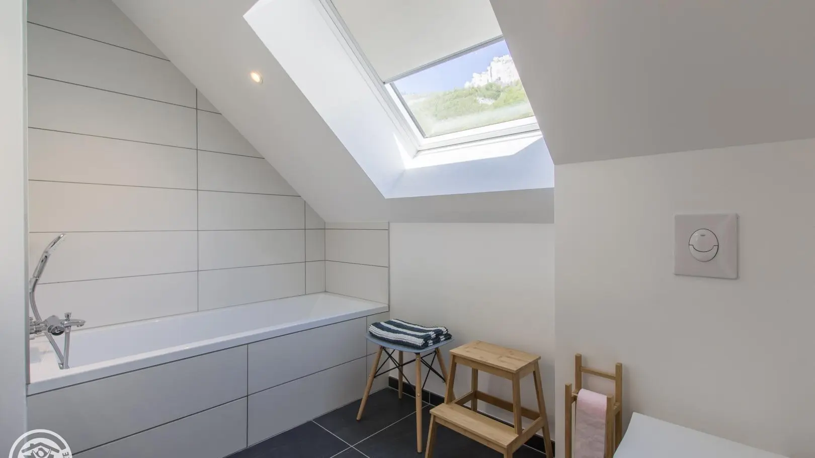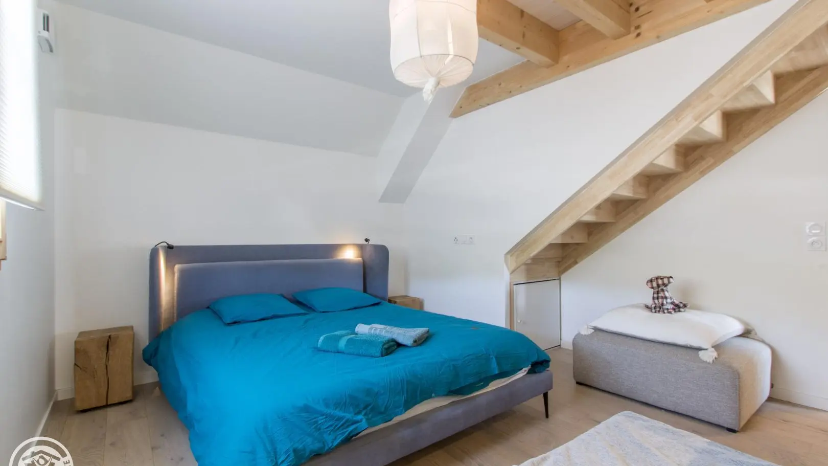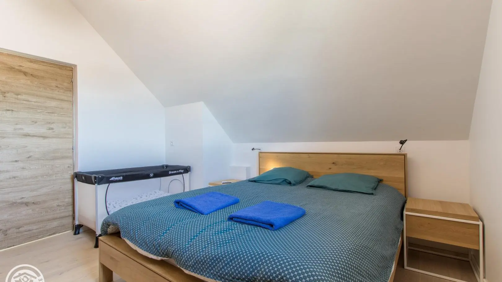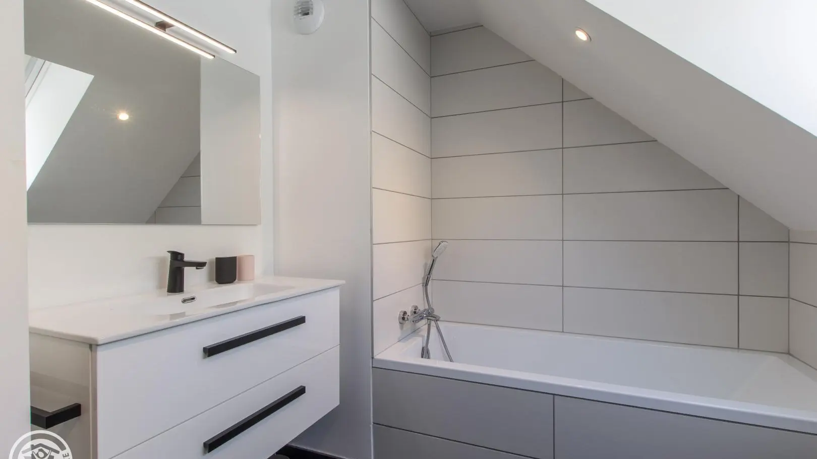 A l'étage : mezzanine avec 2 lits gigognes 80x190cm, bureau. Chambre 2 (1 lit 160x200cm et 1 lit 90c190cm en alcôve + 1 lit 90x190cm dans tiroir), salle de bains (vasque, baignoire, wc).