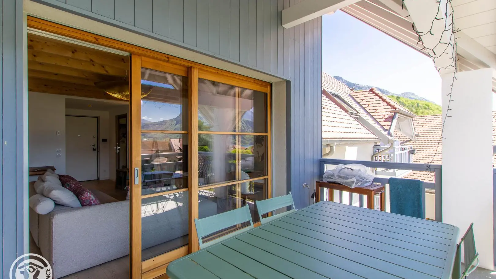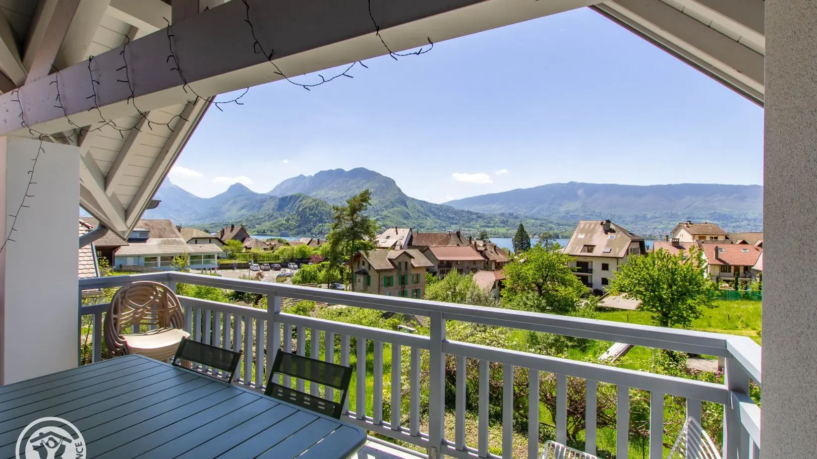 Balcon - terrasse couvert offrant une magnifique vue sur le coeur du village, le Lac et les montagnes. Mobilier de jardin et plancha.