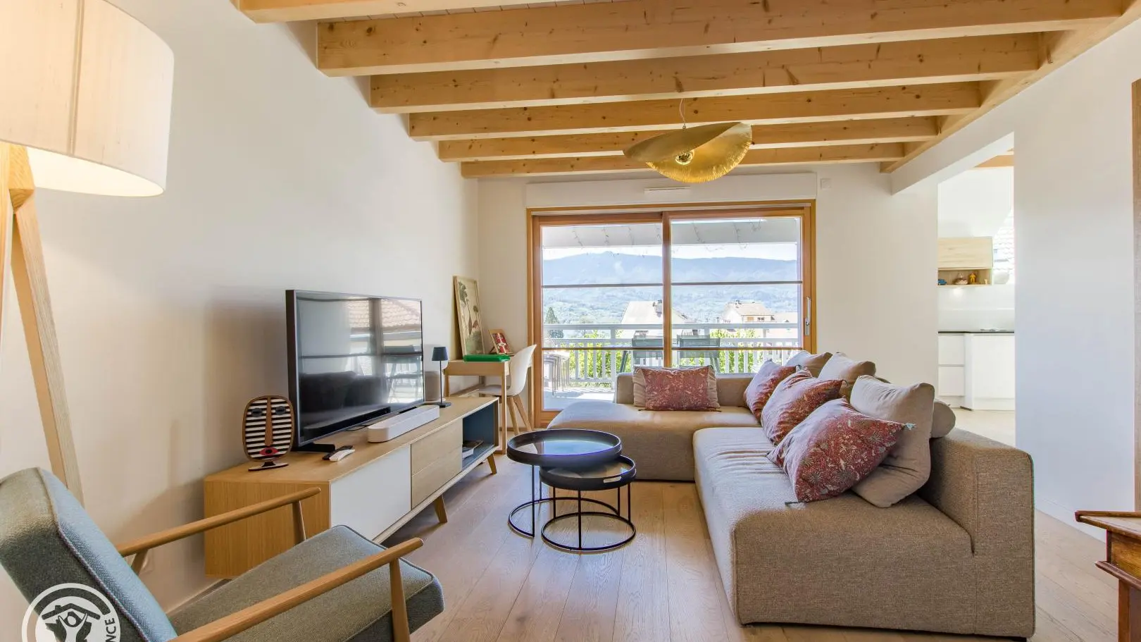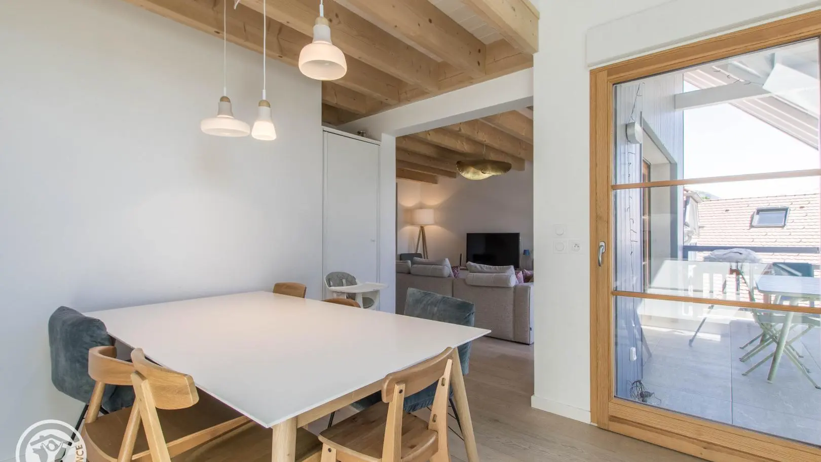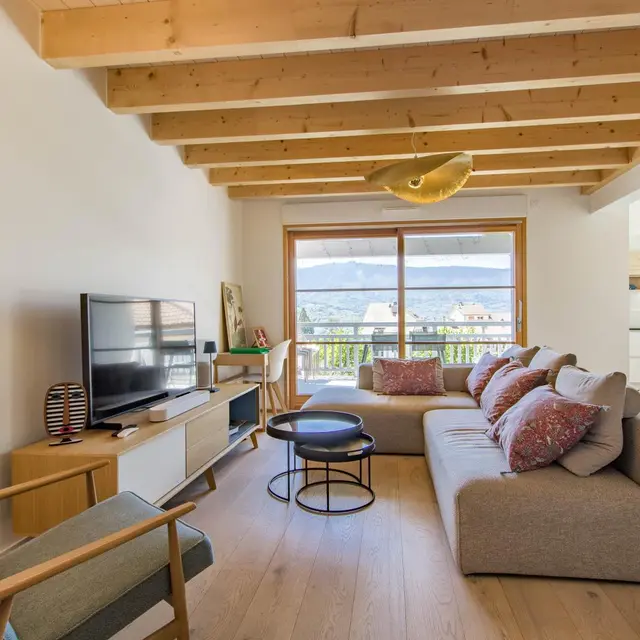 Appartement lumineux en duplex de 76m² (+12m² mansardés) aménagé dans une petite résidence (copropriété), tout proche du centre du village et des rives du lac d'Annecy. Capacité jusqu'à 8 personnes (sans supplément).