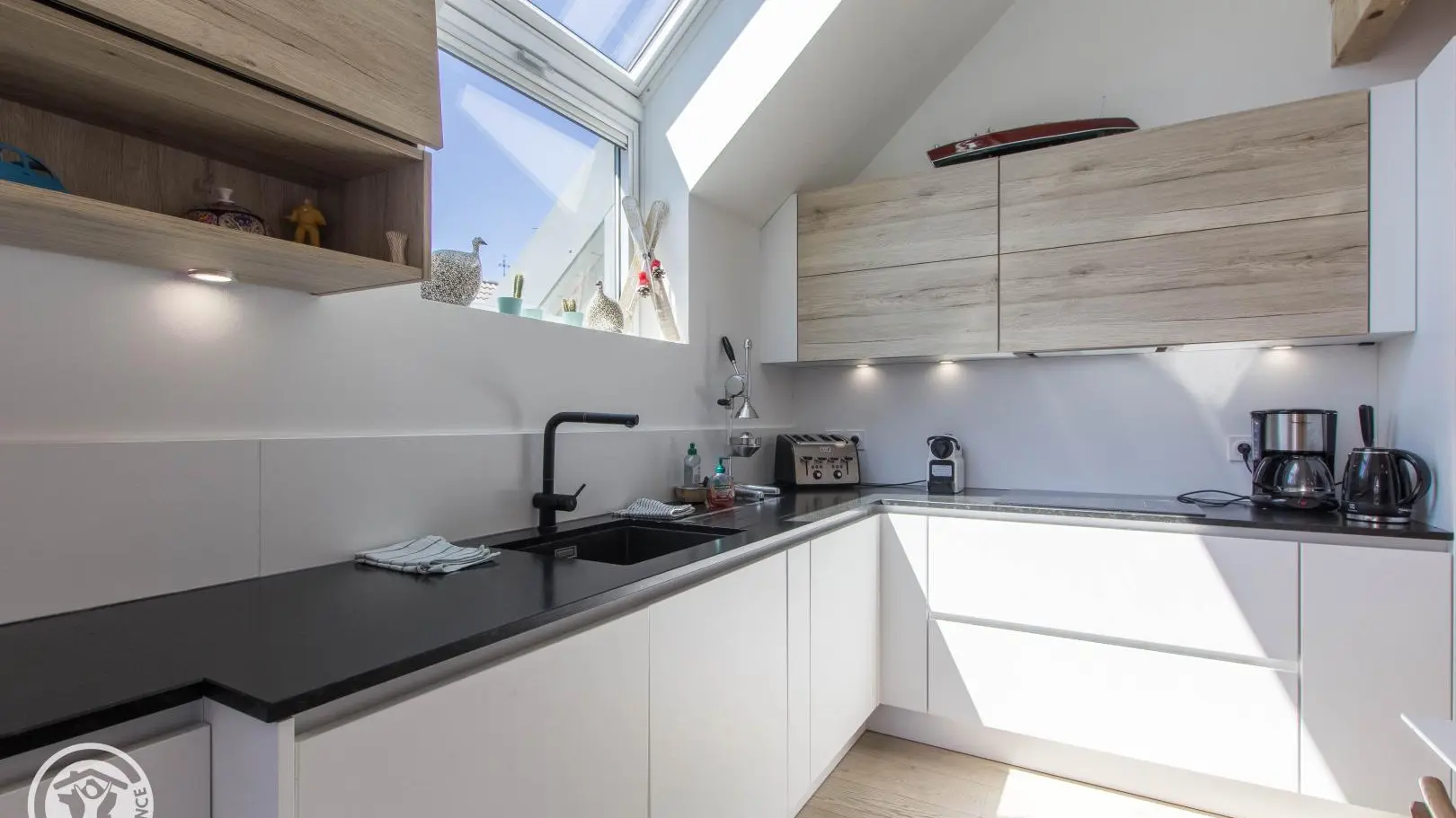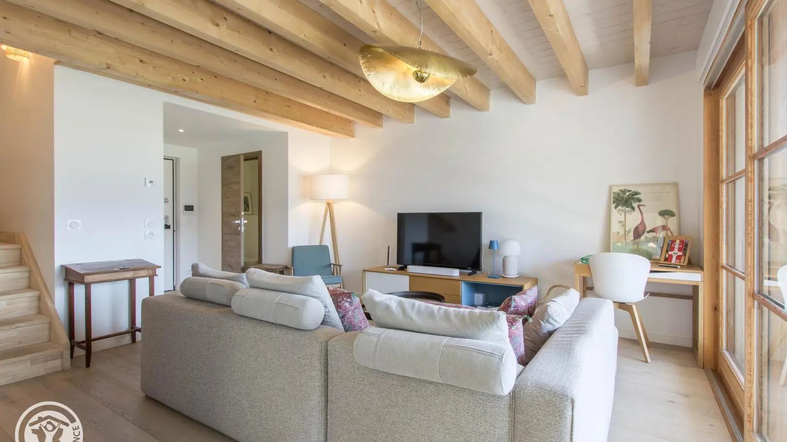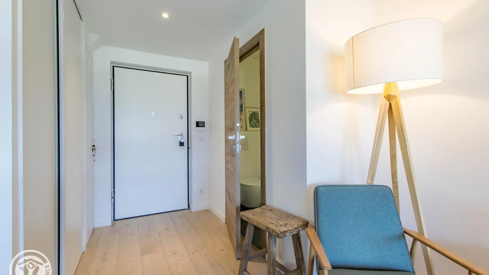 Hall d'entrée, cuisine intégrée avec table repas, séjour avec canapé d'angle, télévision, équipement bluetooth, console de jeux (Switch). Grande baie vitrée donnant accès au balcon-terrasse (vue lac). Chambre 1 (1 lit 160x200cm, salle d'eau ouverte avec vasque et douche). 1 wc indépendant.