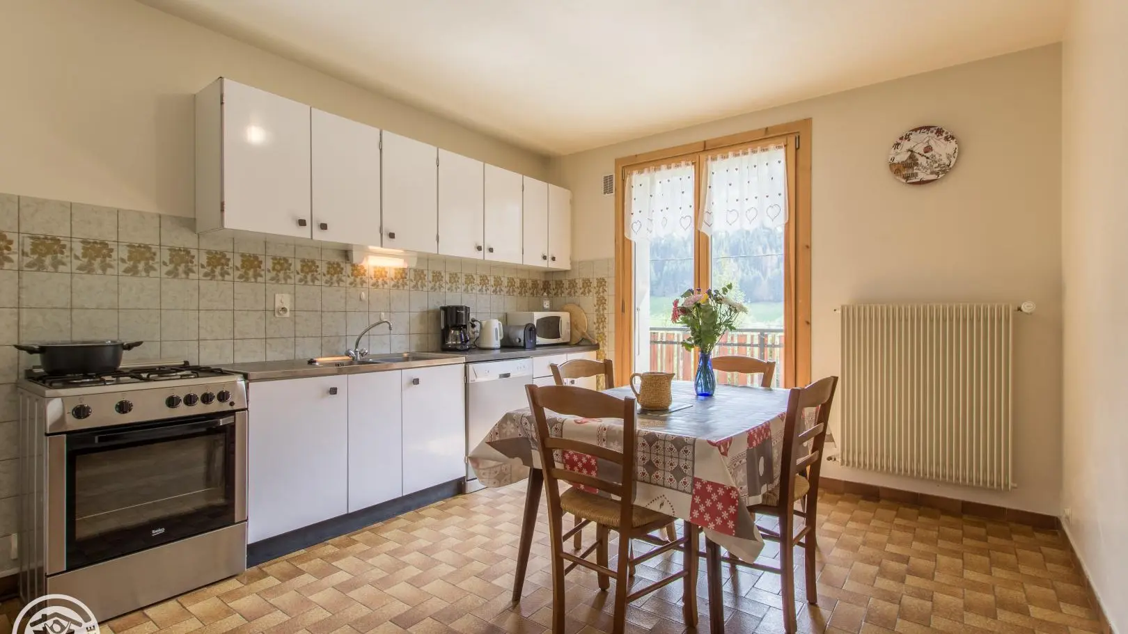 Gîte de 78m², traversant et lumineux, aménagé au 1er étage d'un grand chalet comprenant 3 autres appartements. Belle vue sur les montagnes environnantes. Entrée commune. Hall d'entrée avec placard, cuisine équipée, séjour - salle à manger (table repas, canapé convertible, télévision, lit escamotable 140cm), accès au balcon et à la terrasse (sur le côté de la maison).