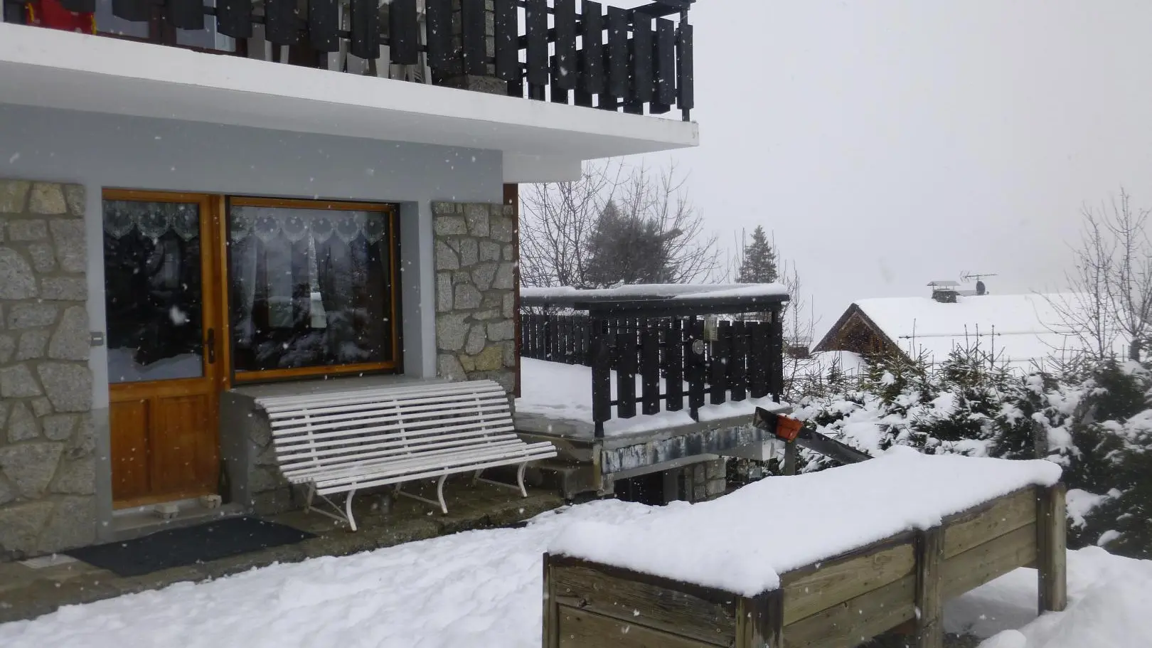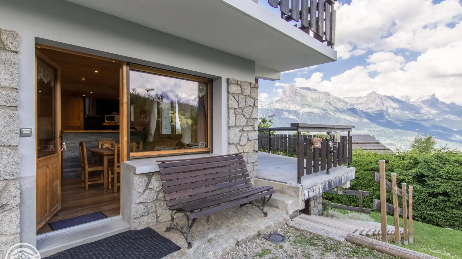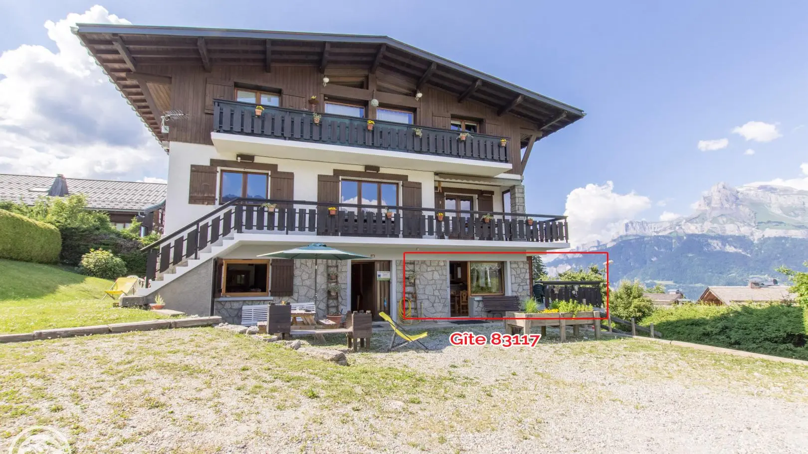 Face au Mont-Blanc et à la chaîne des Fiz : vaste terrasse privative située sur le côté de la maison avec mobilier de jardin, parasol et barbecue (2 marches d'accès). Centre village de Combloux à 800m en voiture ou 300m à pieds : commerces, restaurants, Office de Tourisme.