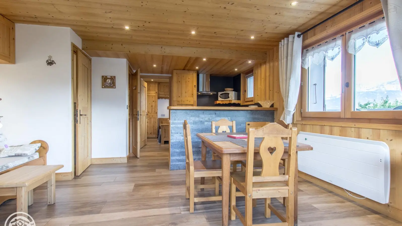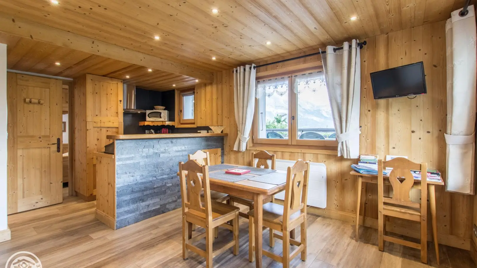 Entrée indépendante au rez-de-chaussée du chalet : cuisine intégrée ouverte sur séjour (Tv, banquette-lit gigogne offrant un couchage d'appoint 160x200cm ou 2x80cm), chambre (1 lit 140x190cm), salle d'eau (douche), wc indépendant.