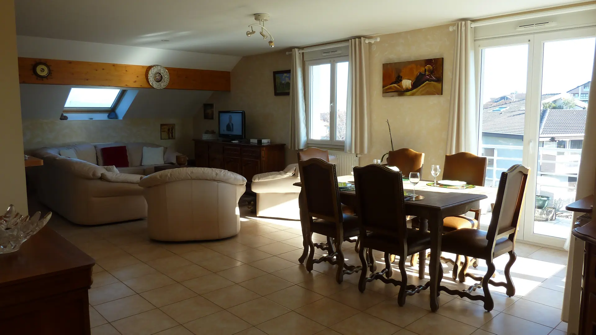 Nous vous proposons un charmant appartement de 100m², lumineux et traversant. Capacité d'accueil de 5 pers. Aménagement confortable. Vues montagne et lac dans résidence de standing, calme avec parking.