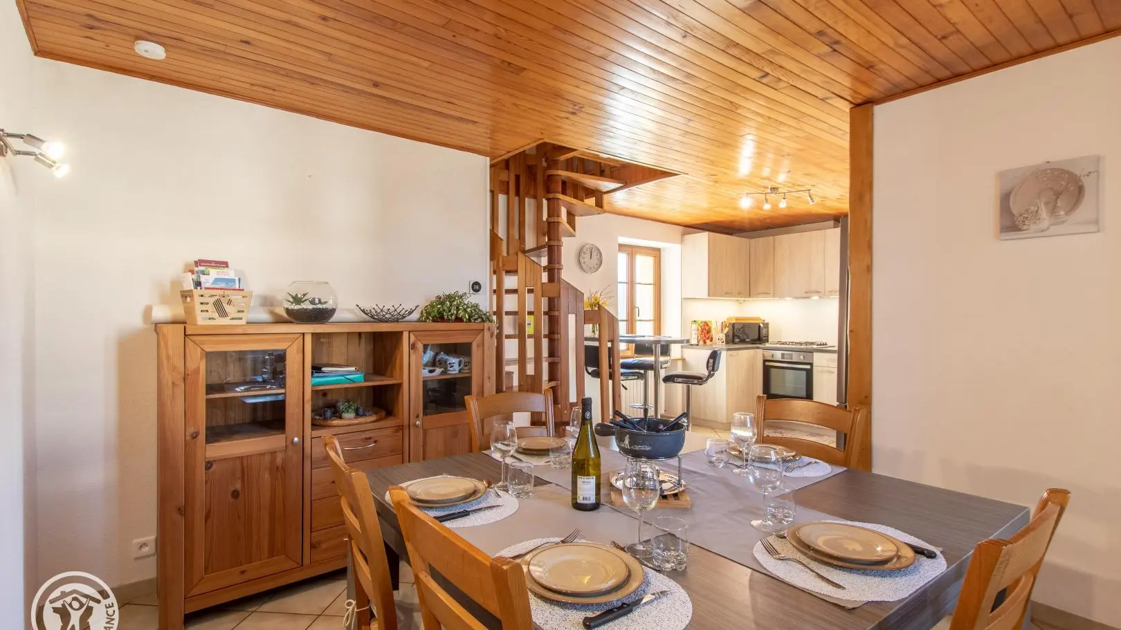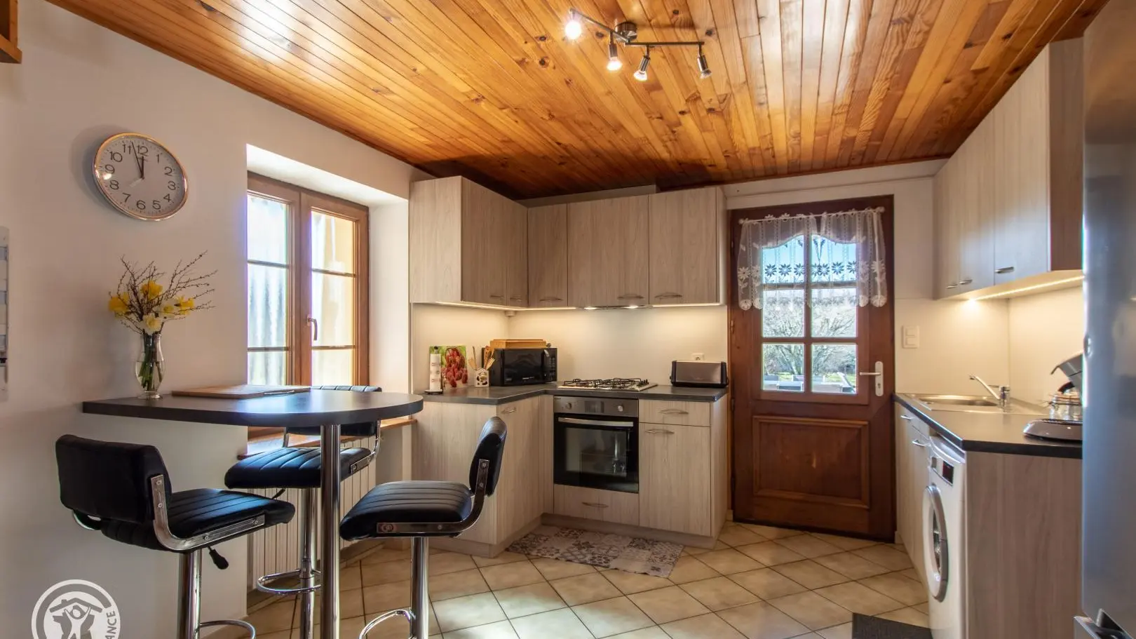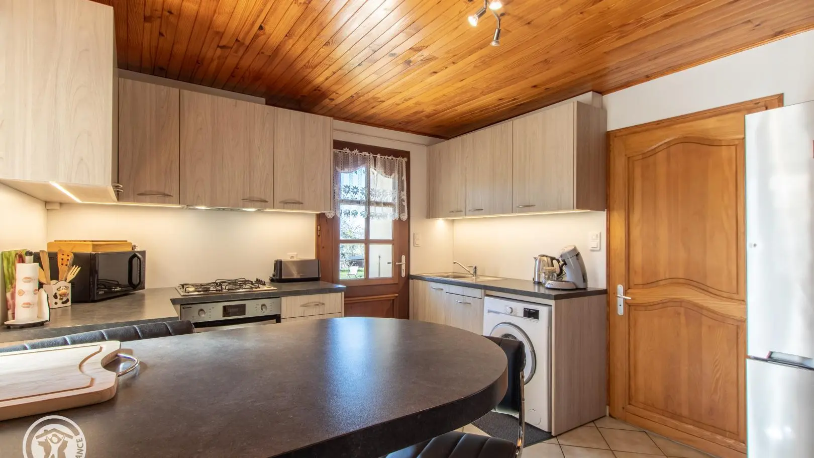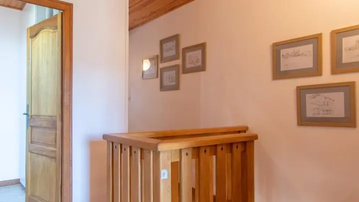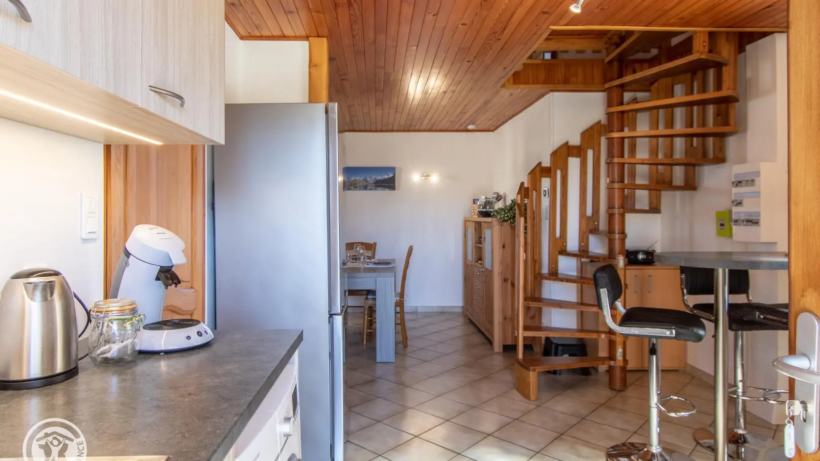 Gîte mitoyen aménagé sur deux niveaux dans une maison accolée à celle des propriétaires. Au rez-de-chaussée, entrée par la cuisine ouverte sur salle à manger : cuisine équipée (avec lave-linge), table fixe haute avec tabourets de bar, table de repas. Salle d'eau avec WC.
