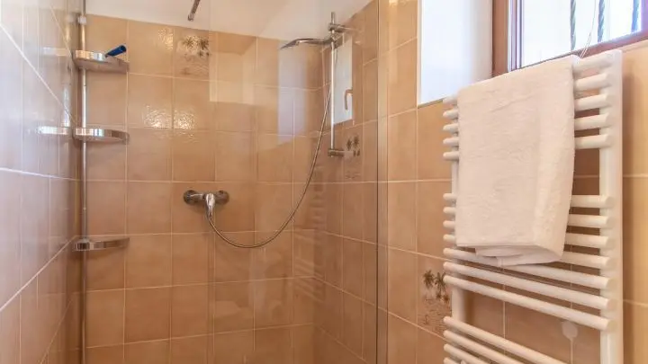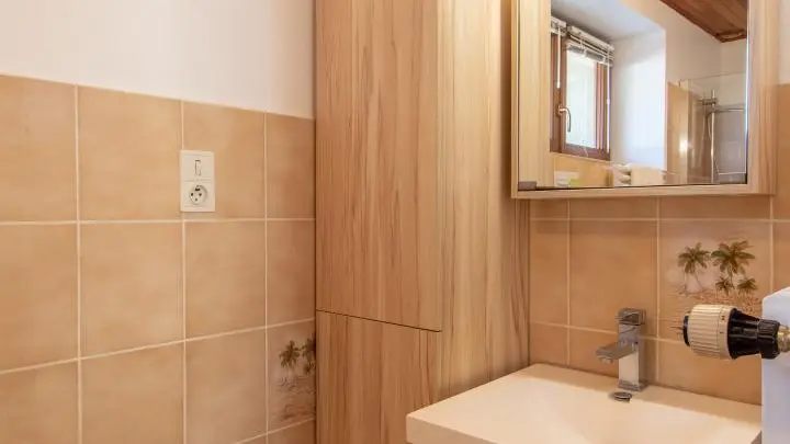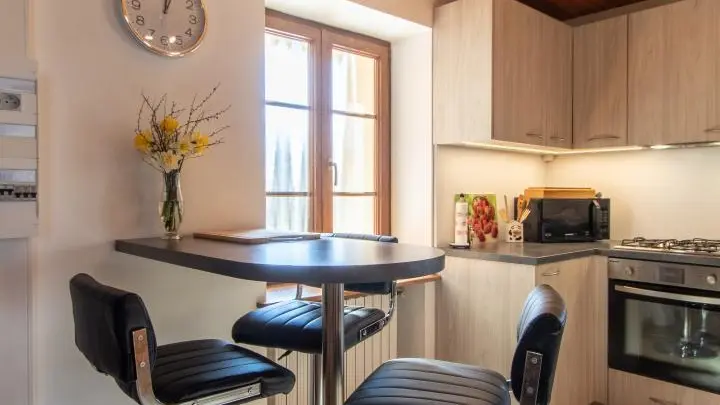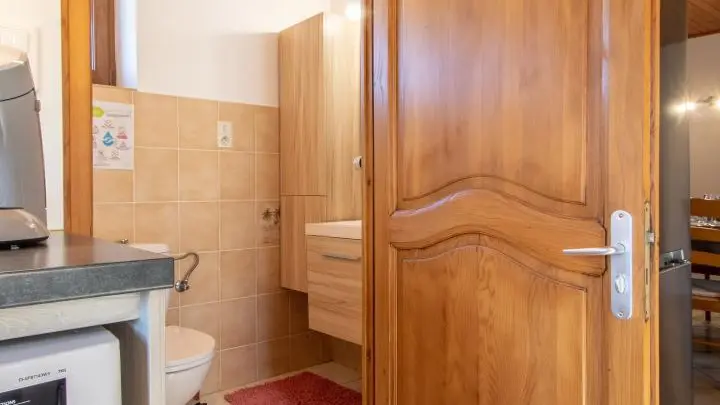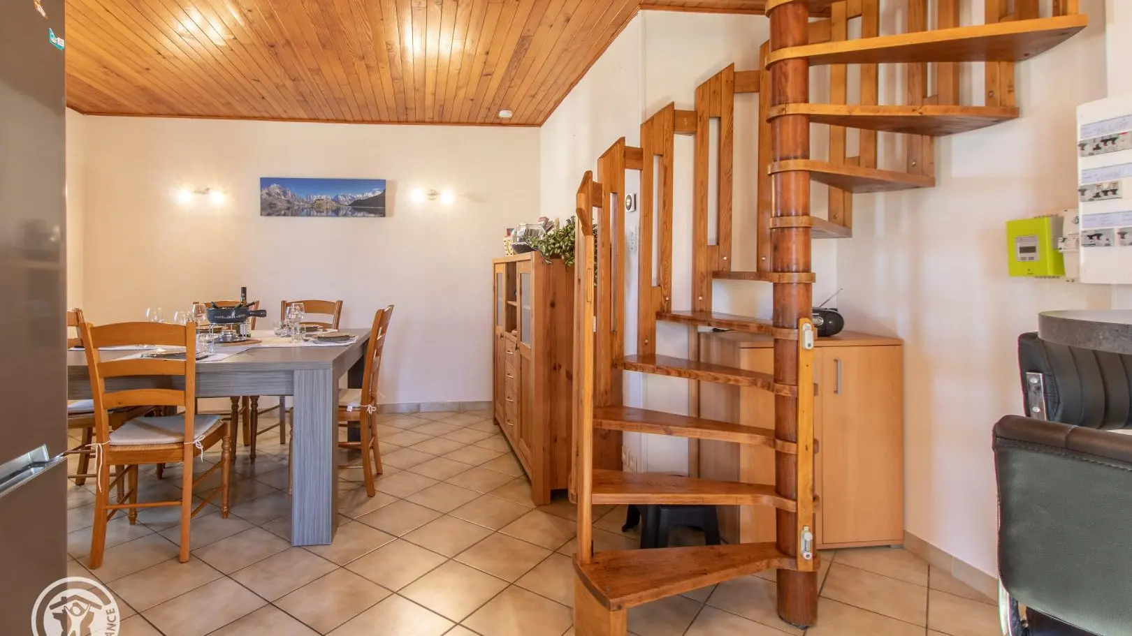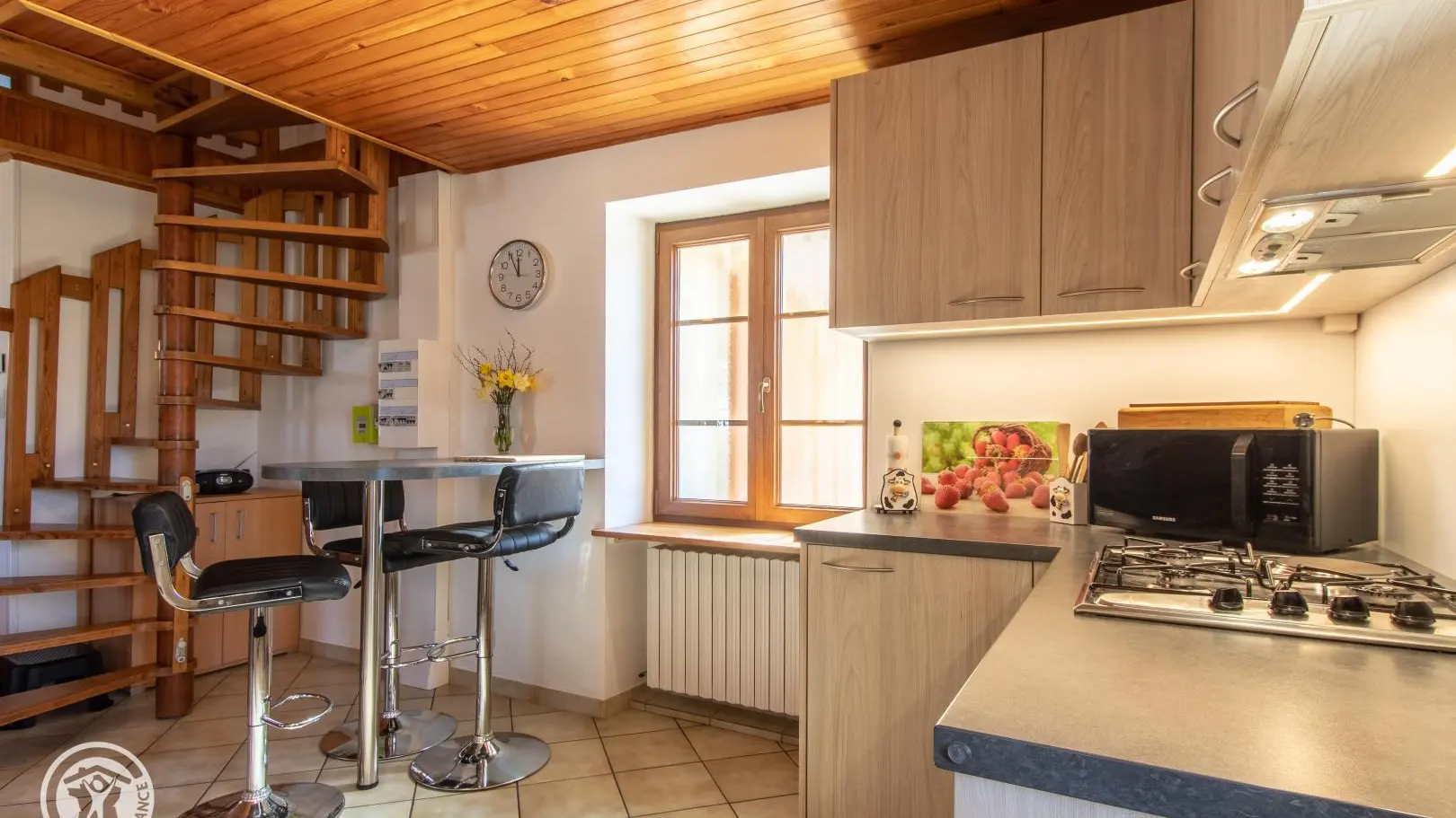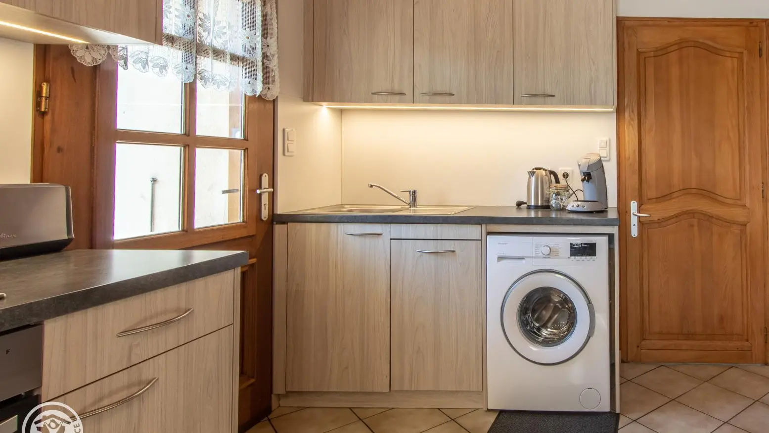 Gîte mitoyen aménagé sur deux niveaux dans une maison accolée à celle des propriétaires. Au rez-de-chaussée, entrée par la cuisine ouverte sur salle à manger : cuisine équipée (avec lave-linge), table fixe haute avec tabourets de bar, table de repas. Salle d'eau avec WC.