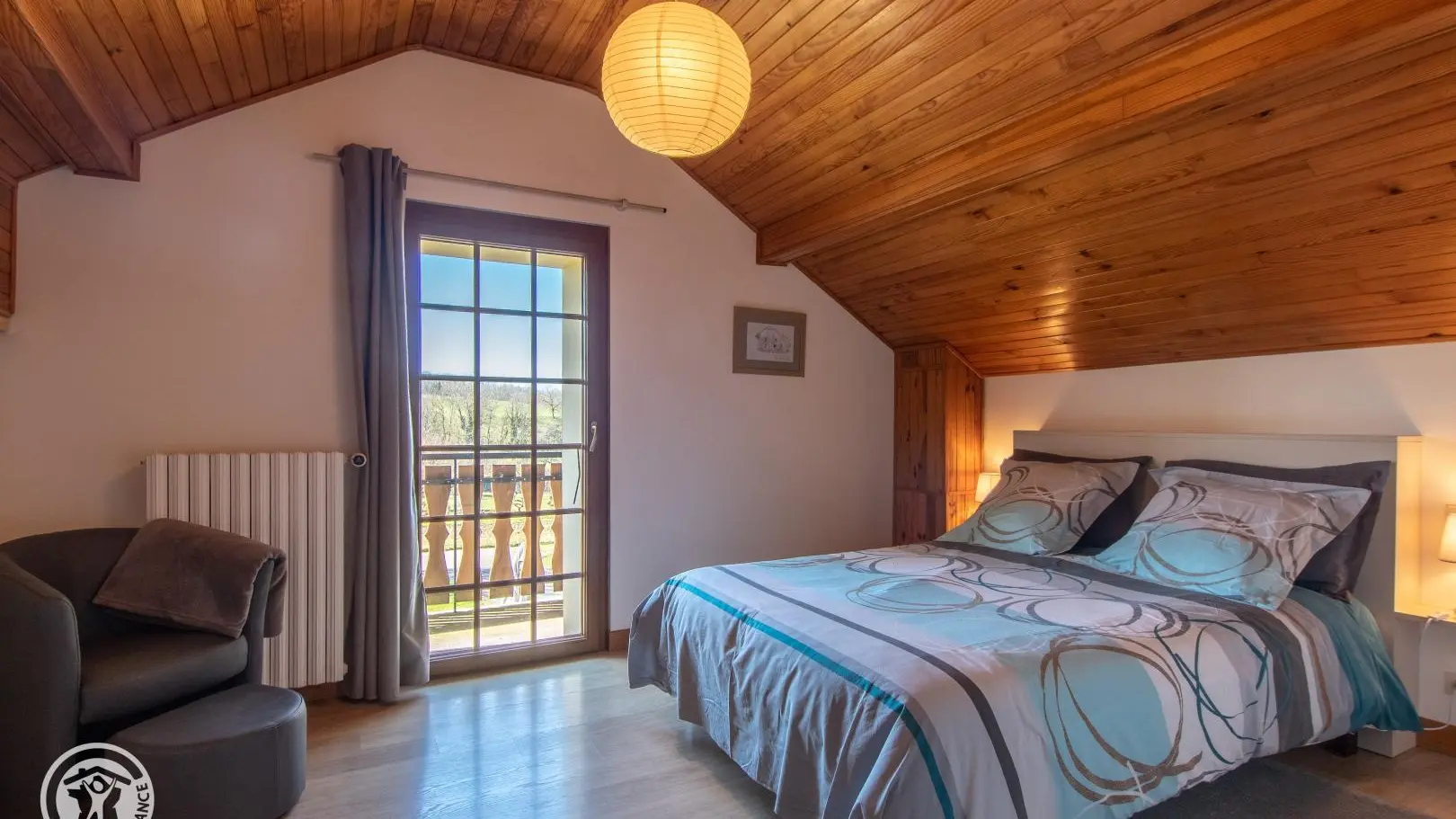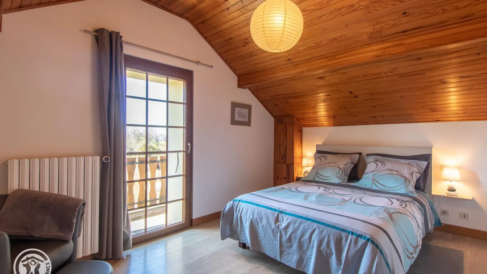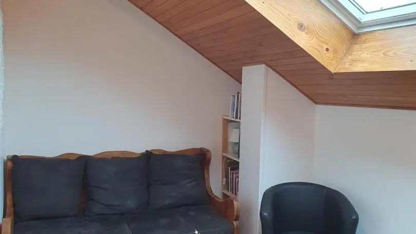 Accès à l'étage par un escalier à colimaçons : pièce séjour avec canapé convertible, fauteuils, TV sur meuble. Chambre 1 (lit 140x190, fauteuil, accès petit balcon privatif) et chambre 2 (3 lits 90x190 cm). Terrasse privative devant le gîte avec mobilier de jardin, barbecue gaz.