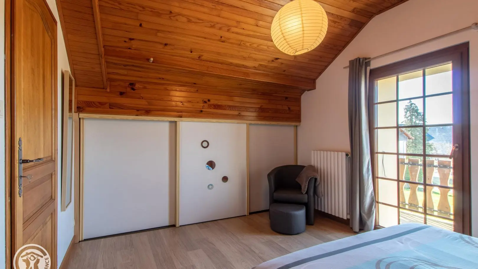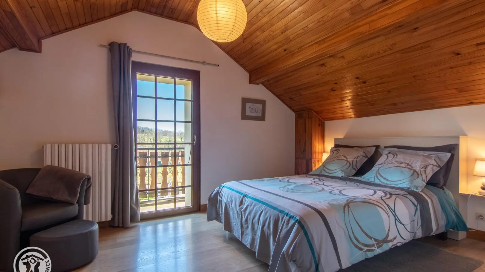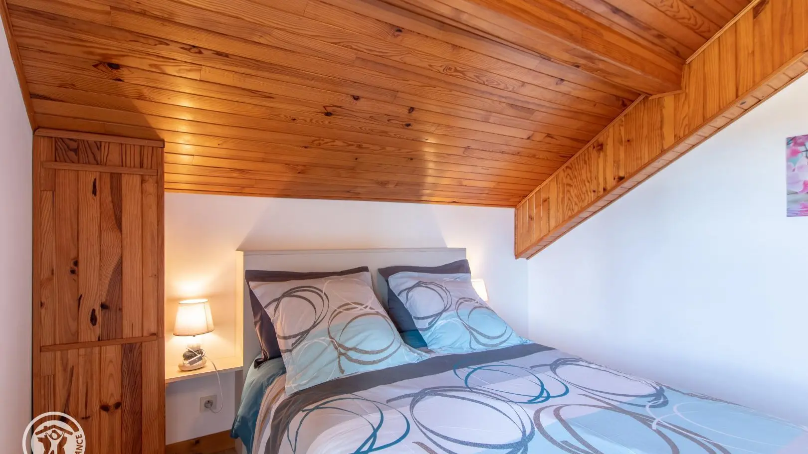 Accès à l'étage par un escalier à colimaçons : pièce séjour avec canapé convertible, fauteuils, TV sur meuble. Chambre 1 (lit 140x190, fauteuil, accès petit balcon privatif) et chambre 2 (3 lits 90x190 cm). Terrasse privative devant le gîte avec mobilier de jardin, barbecue gaz.