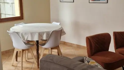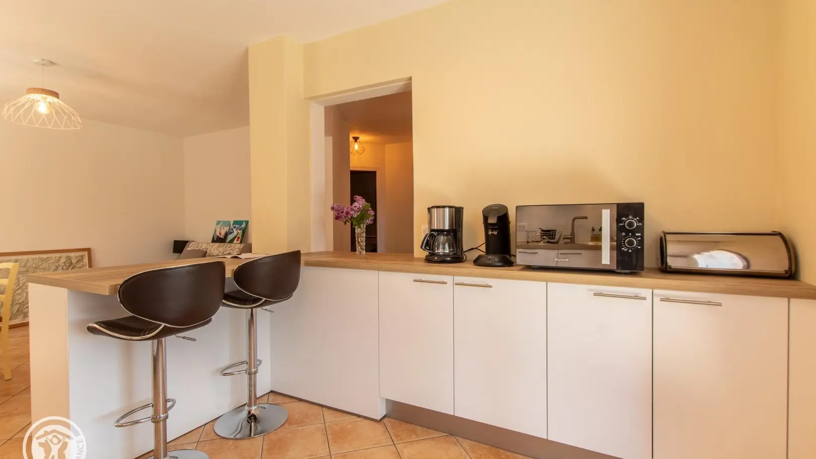 Gîte de 52m² situé de plain-pied au rez-de-chaussée d'une maison comportant le logement des propriétaires. Entrée par un couloir avec rangements. Cuisine équipée ouverte sur séjour avec 2 tabourets de bar, avec accès terrasse par porte-fenêtre. Salon avec table de repas 4 personnes, TV sur meuble, fauteuil et canapé convertible rapido 140x190 cm.