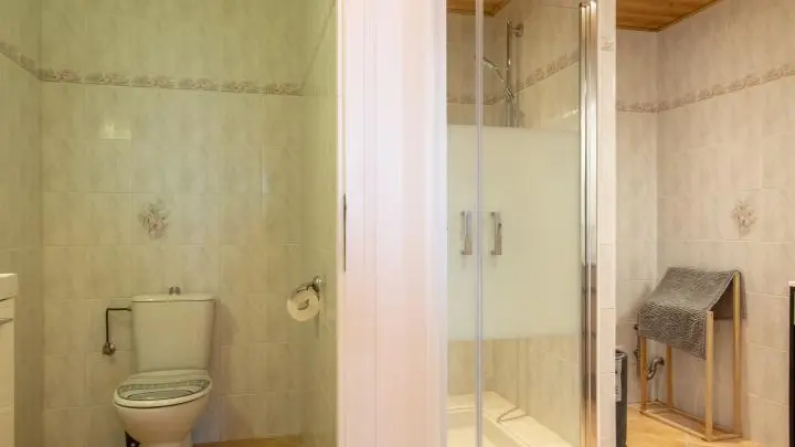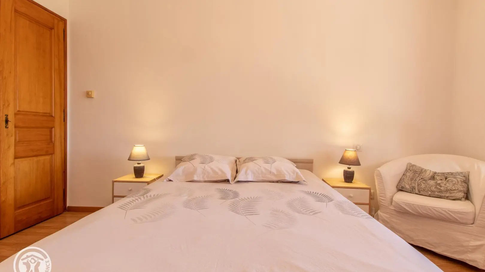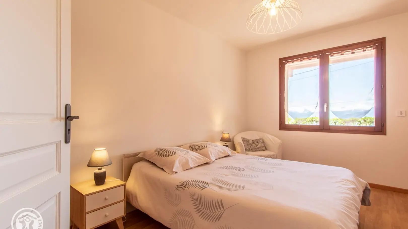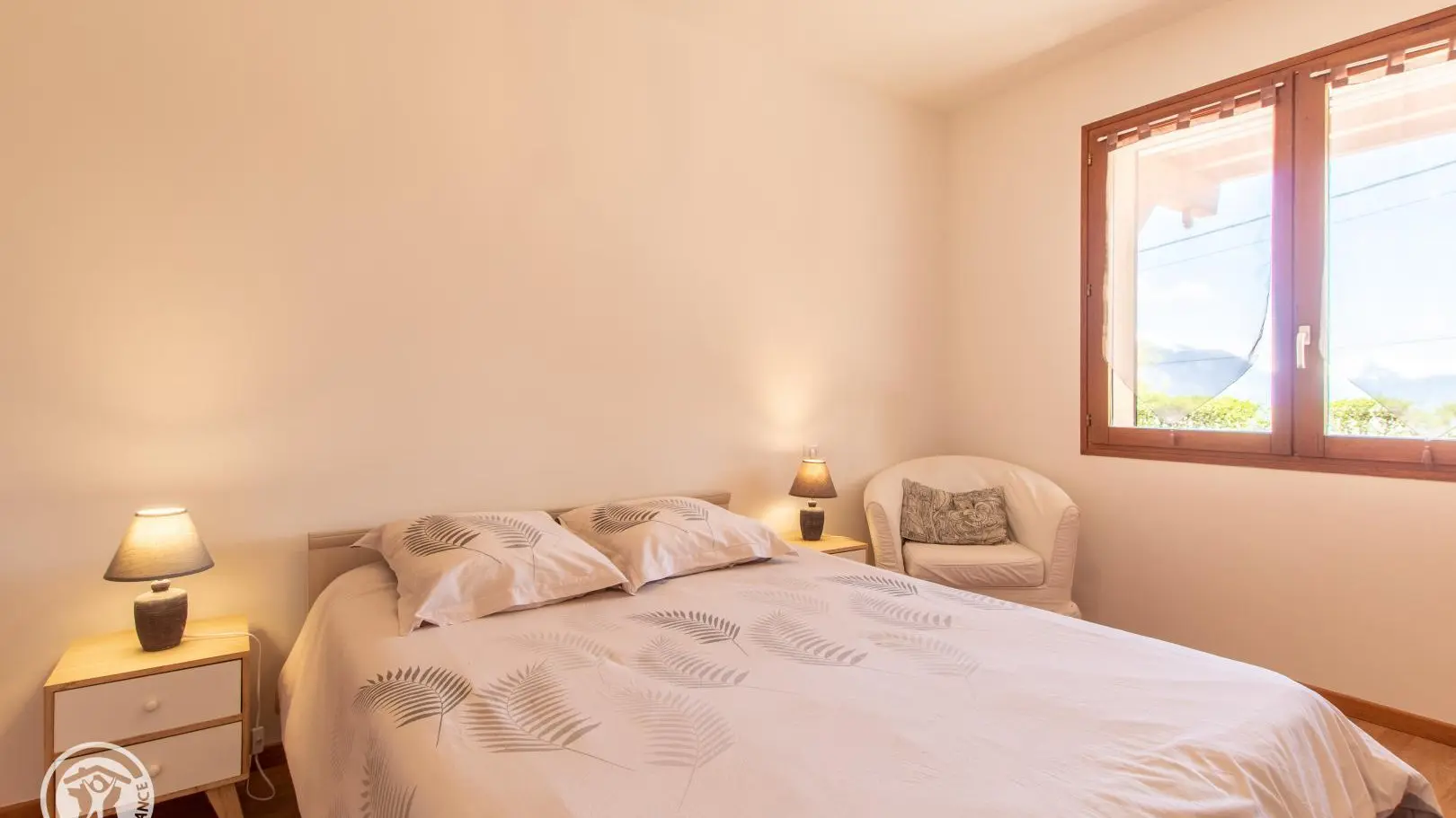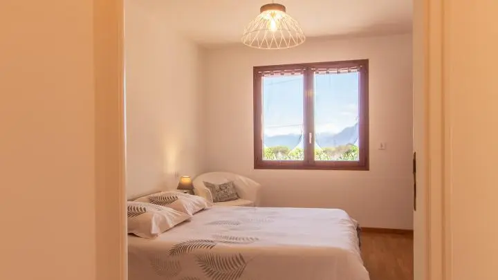 Chambre avec vue montagne (lit 140x190 cm), salle d'eau (lave-linge) et WC indépendant.