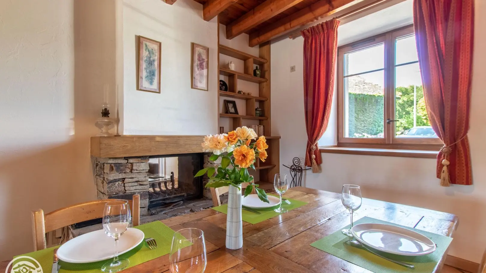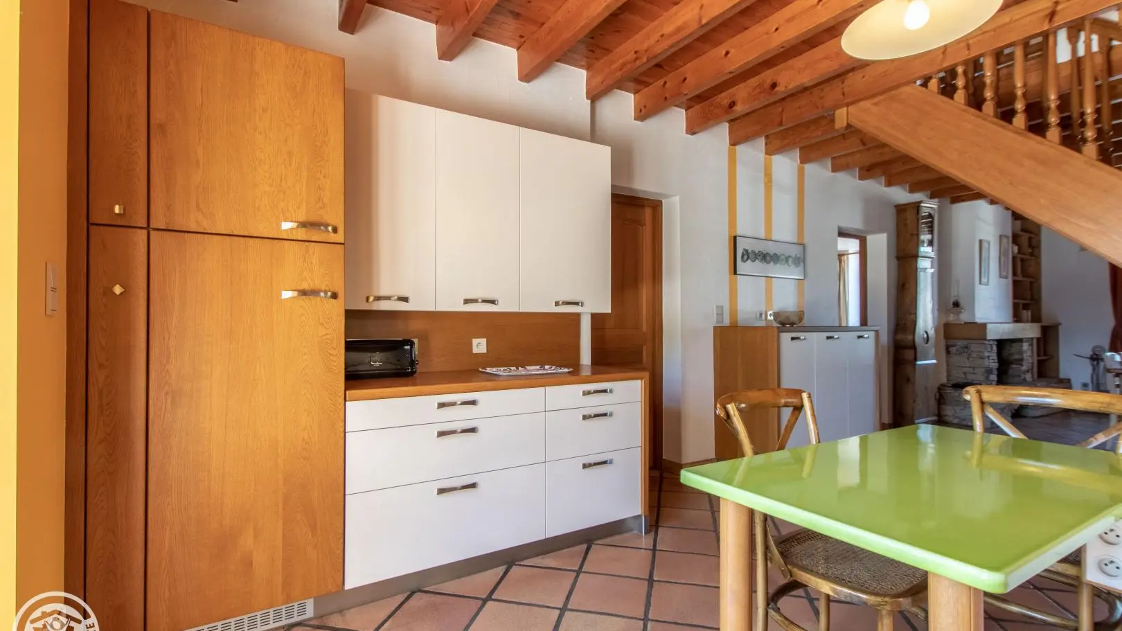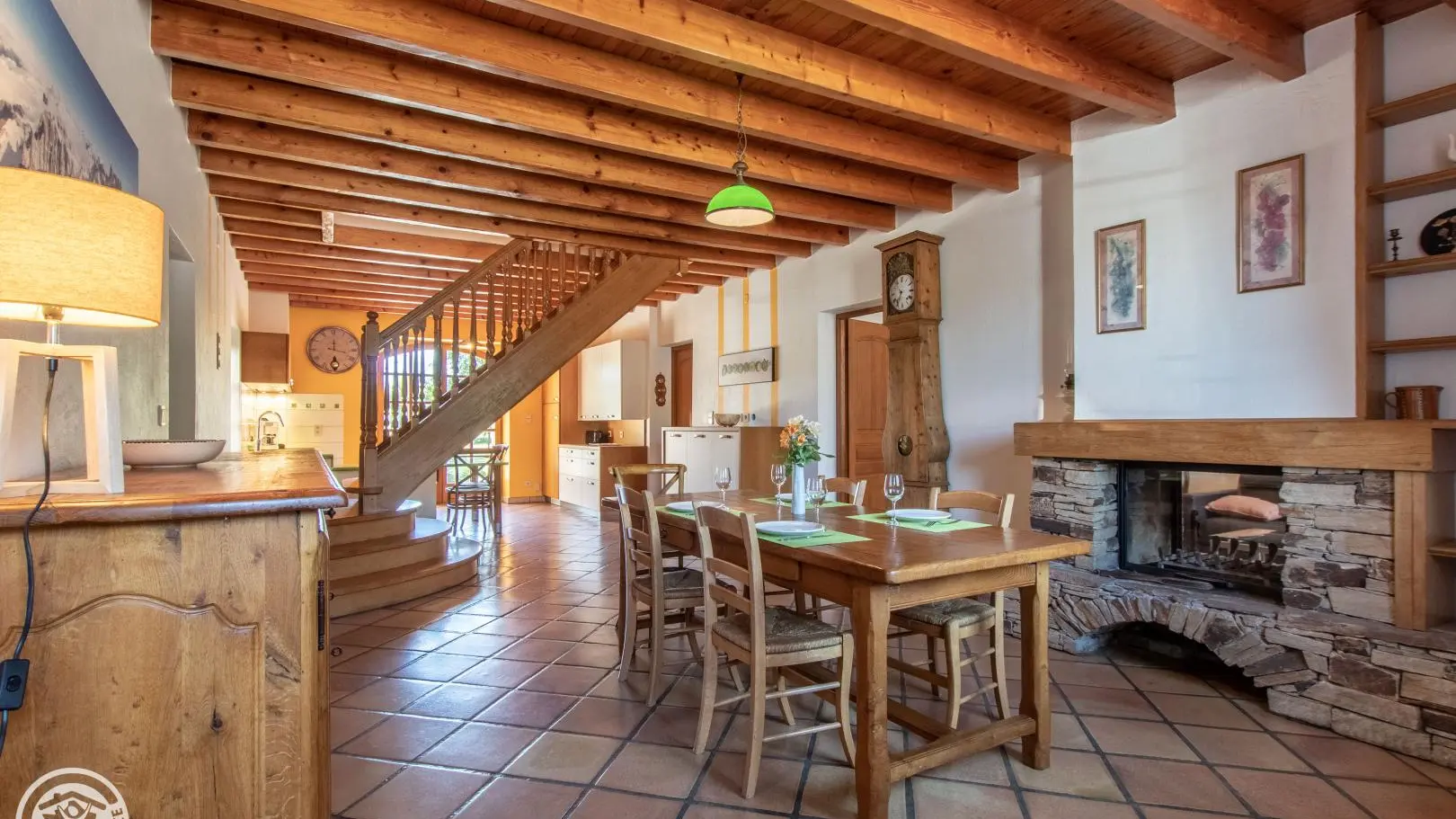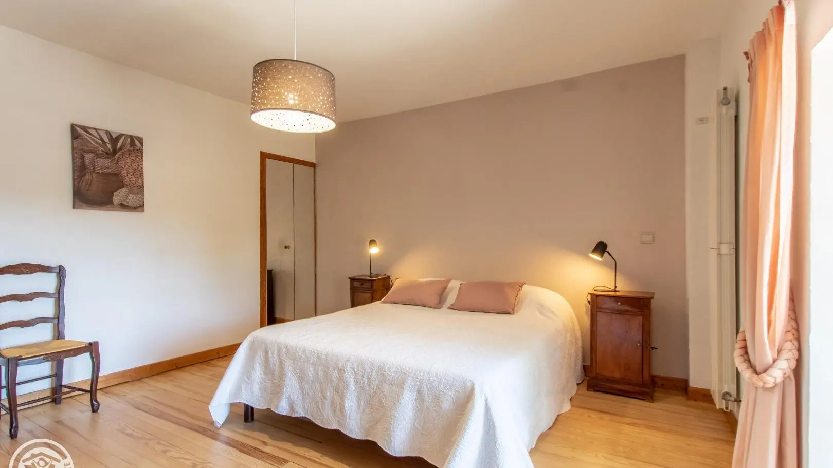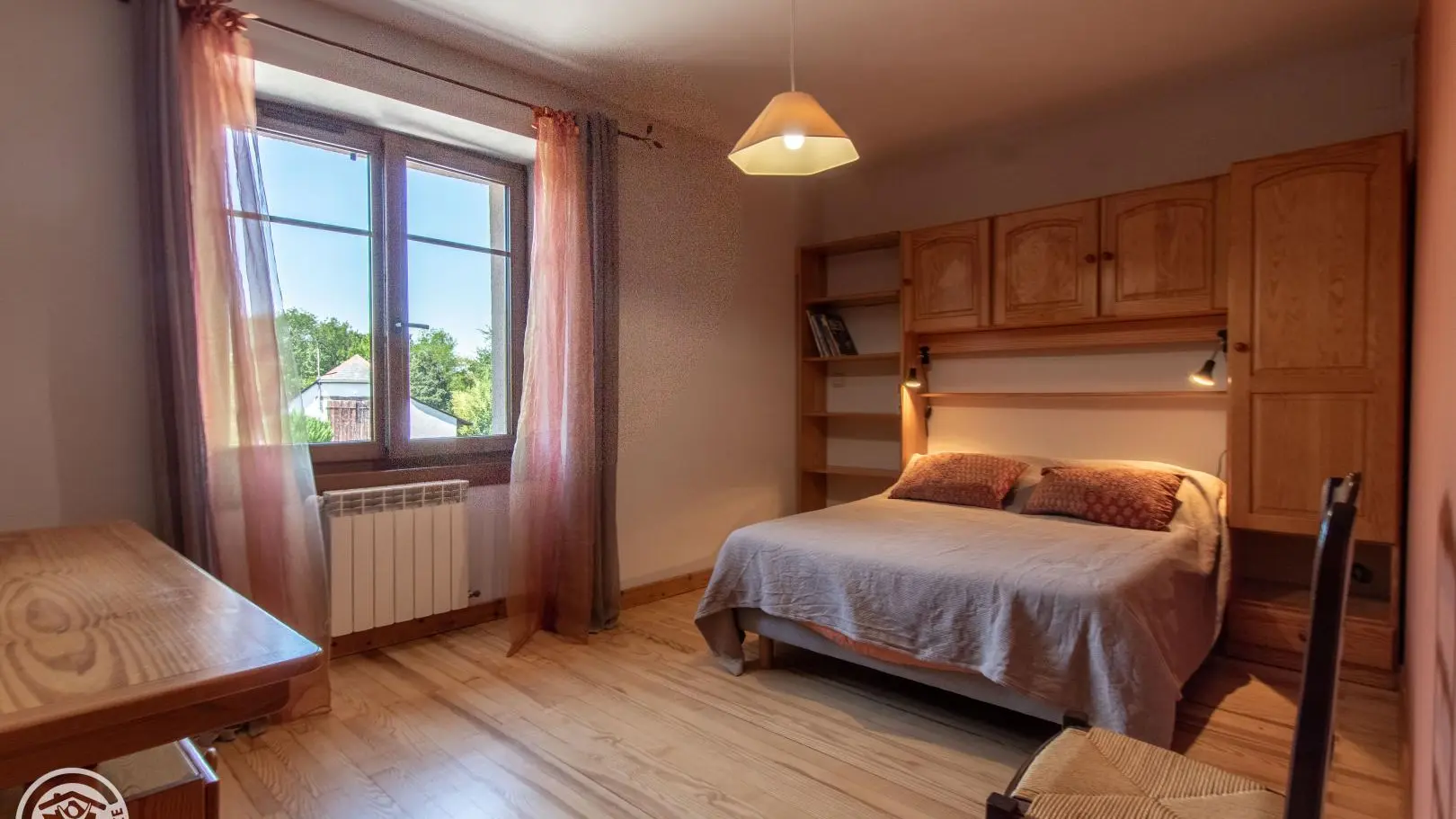 Dans une ancienne bâtisse du XIX, gîte de 130 m² mitoyen avec une autre location et le logement des propriétaires. Entrée indépendante. Au rez-de-chaussée/jardin, cuisine équipée ouverte sur le séjour avec espace repas et salon dans une pièce séparée (TV 80 cm, canapé). Cheminée centrale ouverte sur séjour et salon. Pièce traversante donnant accès à la terrasse. Espace buanderie et WC accessible depuis la cuisine (lavabo, lave-linge et accès extérieur).