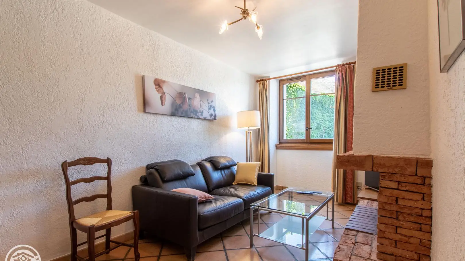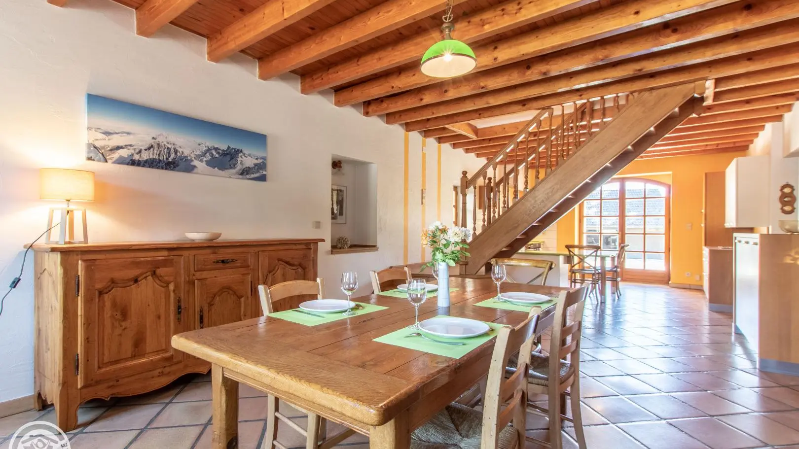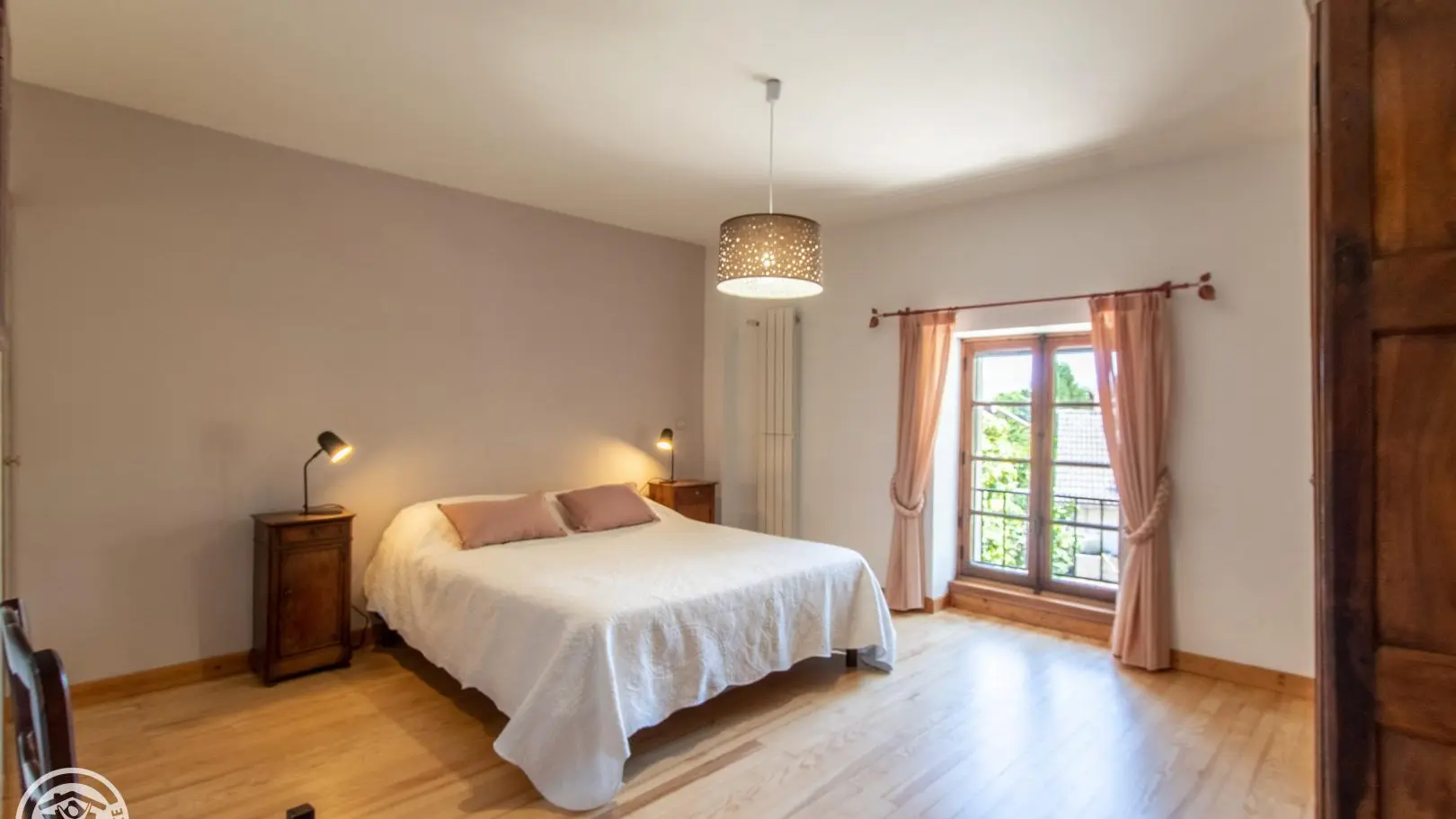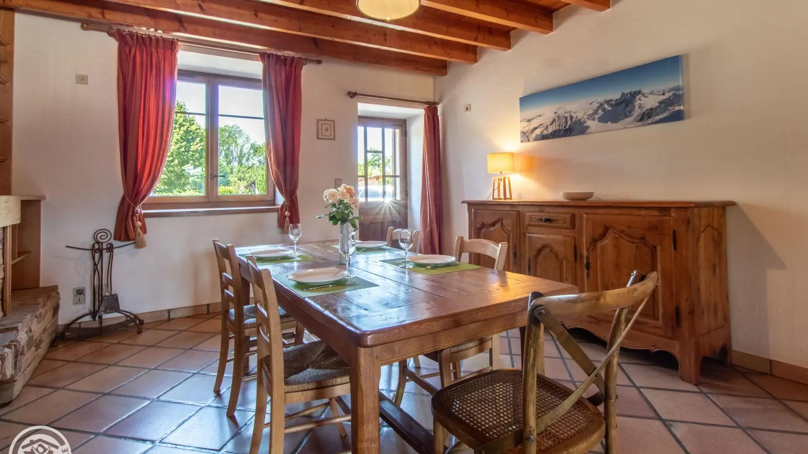 Dans une ancienne bâtisse du XIX, gîte de 130 m² mitoyen avec une autre location et le logement des propriétaires. Entrée indépendante. Au rez-de-chaussée/jardin, cuisine équipée ouverte sur le séjour avec espace repas et salon dans une pièce séparée (TV 80 cm, canapé). Cheminée centrale ouverte sur séjour et salon. Pièce traversante donnant accès à la terrasse. Espace buanderie et WC accessible depuis la cuisine (lavabo, lave-linge et accès extérieur).