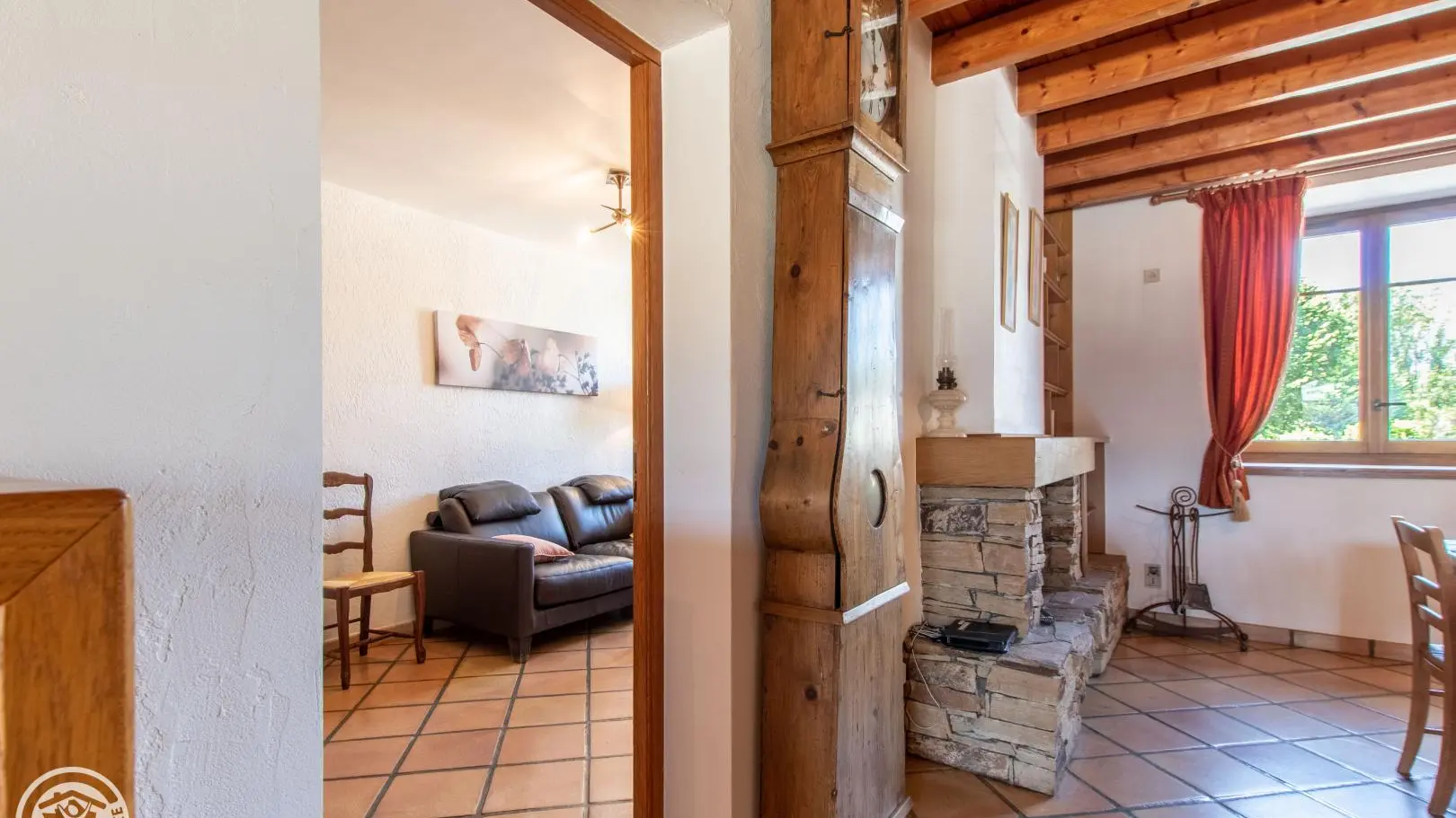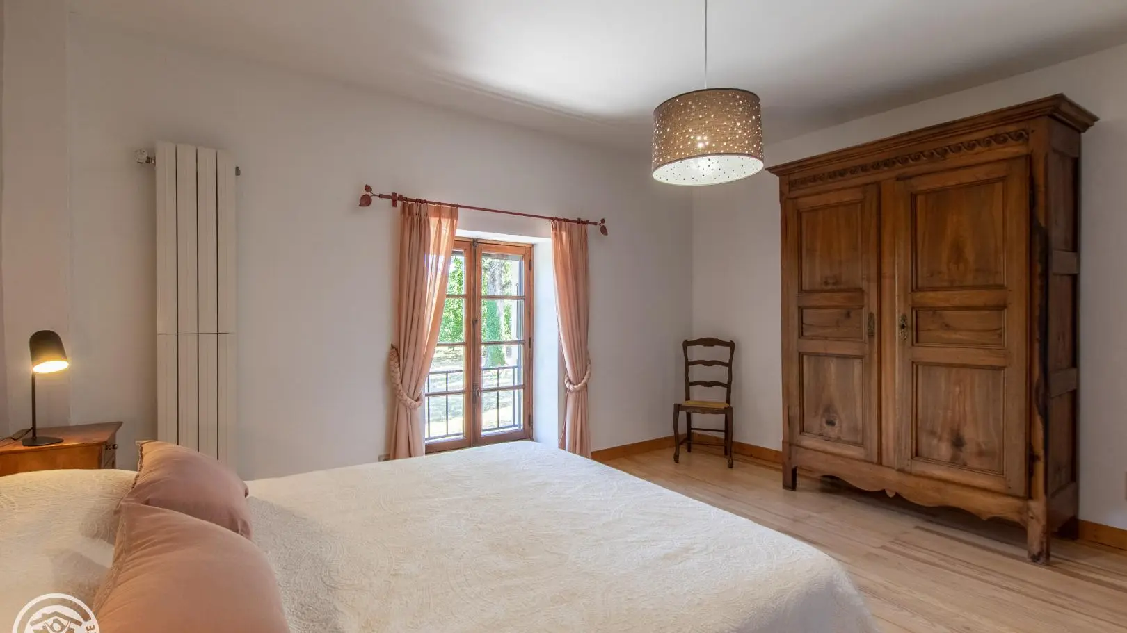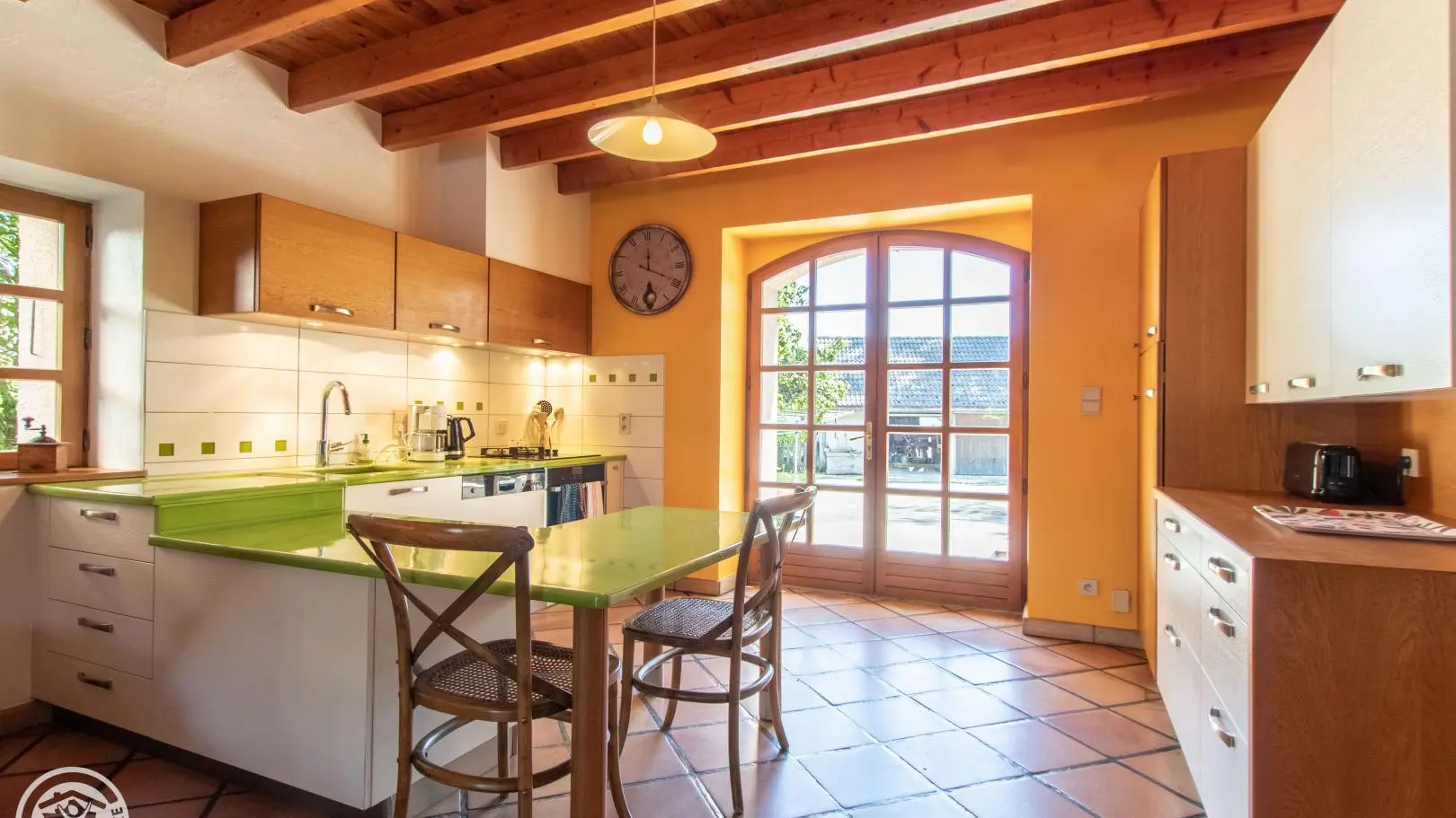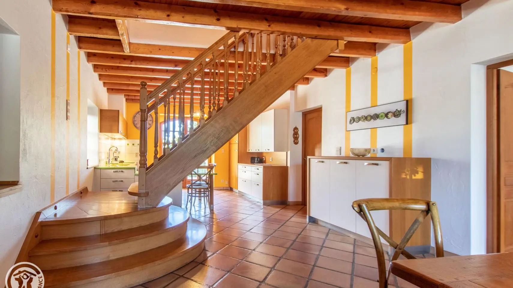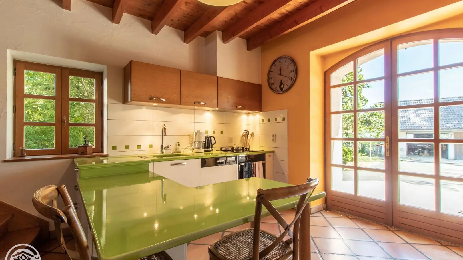 Dans une ancienne bâtisse du XIX, gîte de 130 m² mitoyen avec une autre location et le logement des propriétaires. Entrée indépendante. Au rez-de-chaussée/jardin, cuisine équipée ouverte sur le séjour avec espace repas et salon dans une pièce séparée (TV 80 cm, canapé). Cheminée centrale ouverte sur séjour et salon. Pièce traversante donnant accès à la terrasse. Espace buanderie et WC accessible depuis la cuisine (lavabo, lave-linge et accès extérieur).