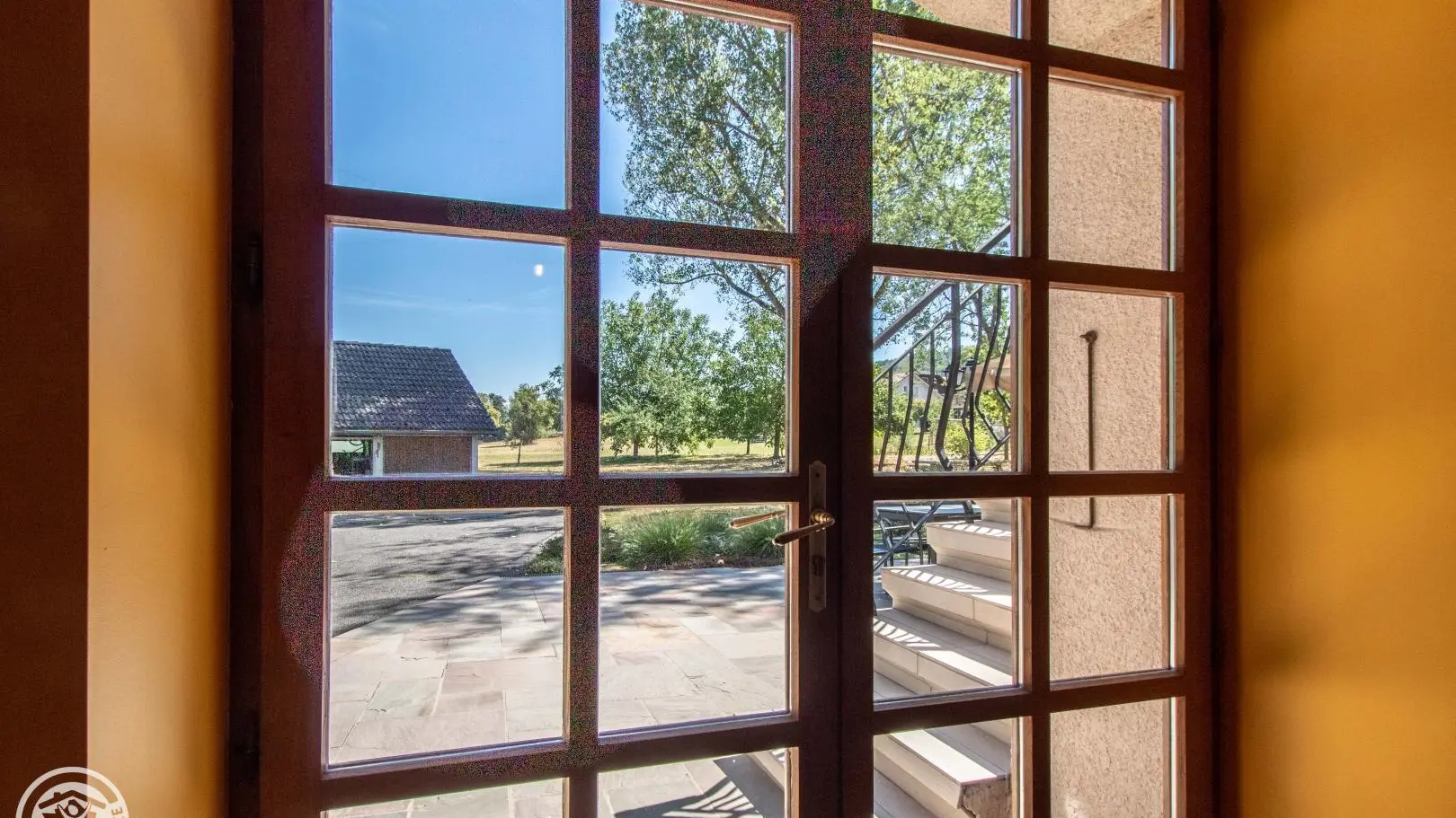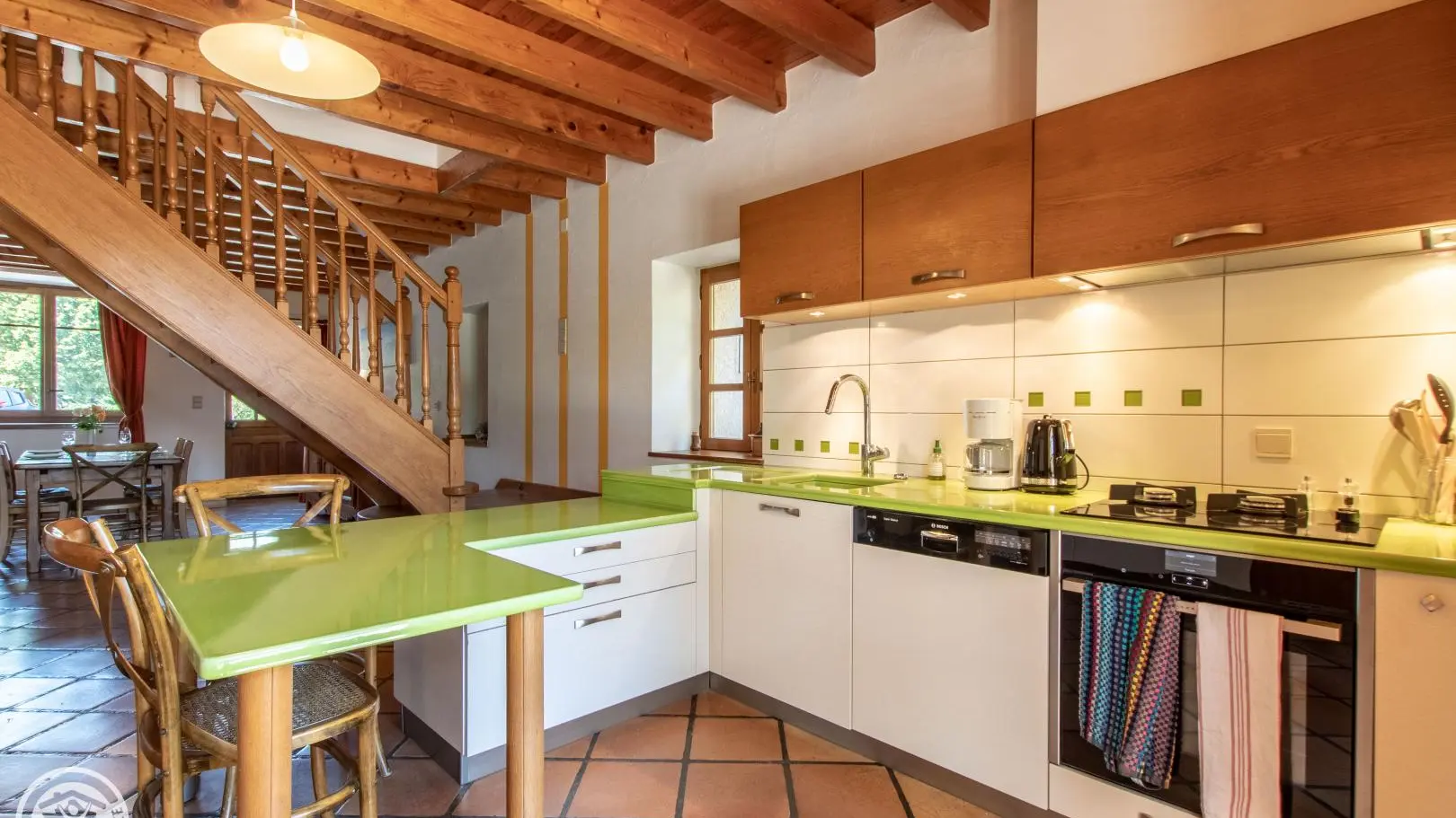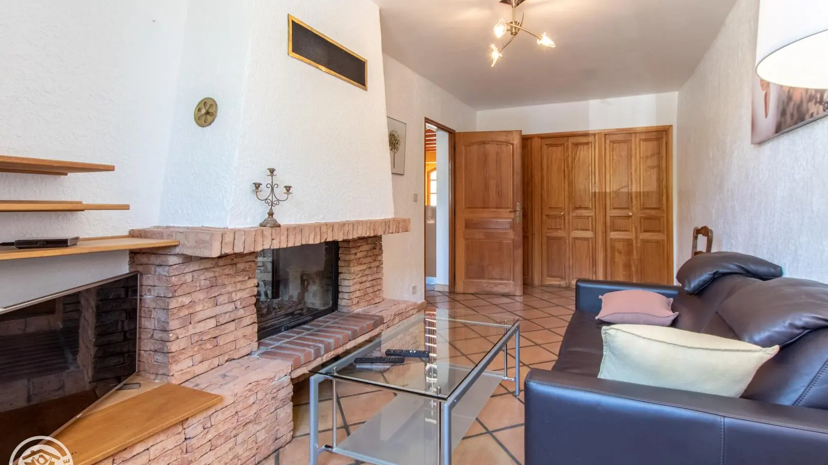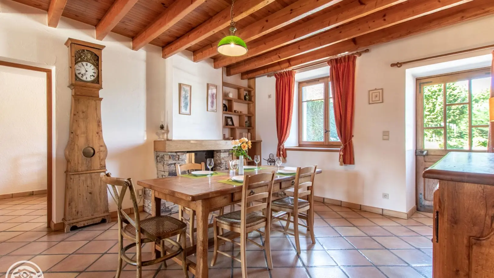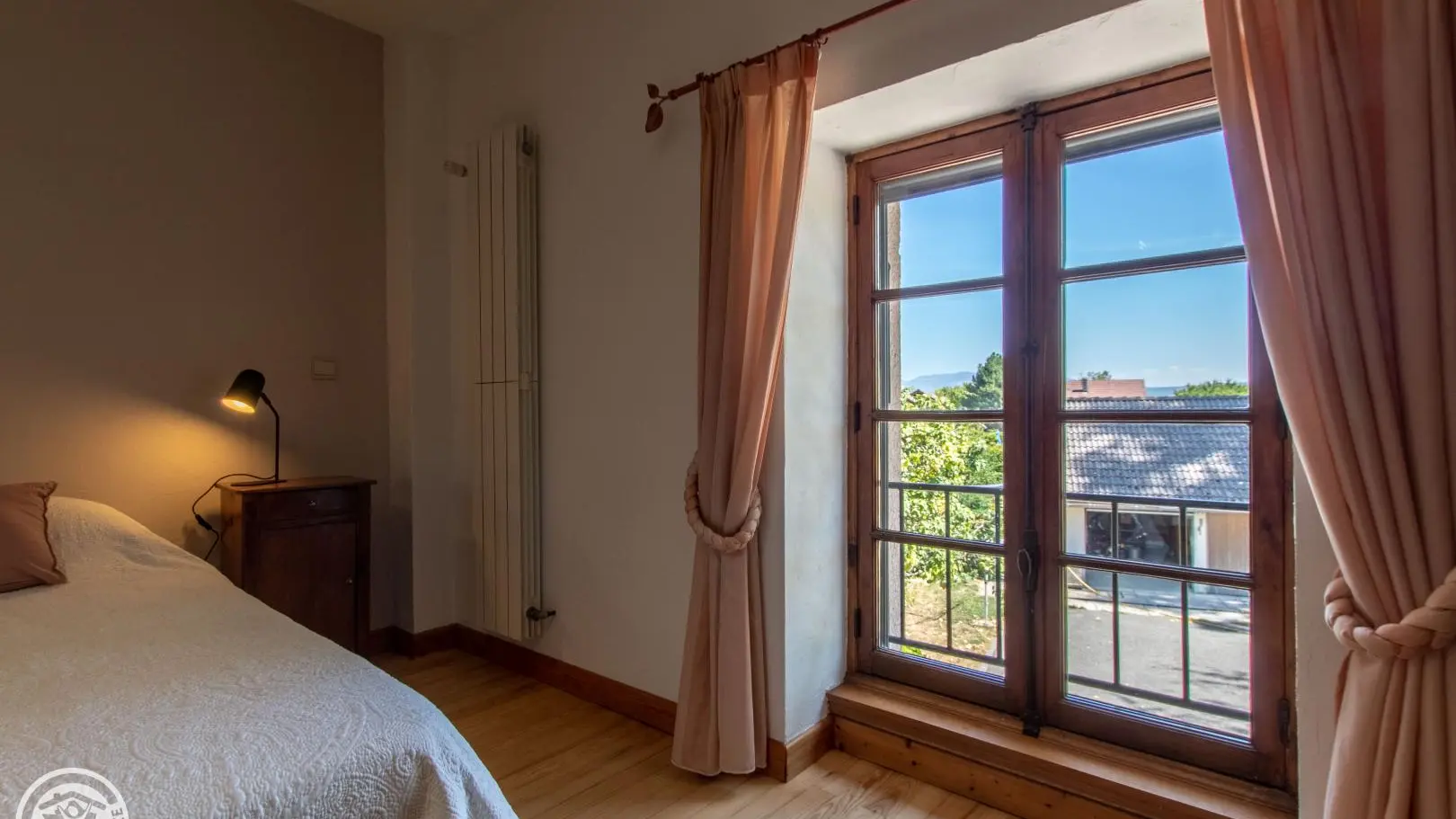 Dans une ancienne bâtisse du XIX, gîte de 130 m² mitoyen avec une autre location et le logement des propriétaires. Entrée indépendante. Au rez-de-chaussée/jardin, cuisine équipée ouverte sur le séjour avec espace repas et salon dans une pièce séparée (TV 80 cm, canapé). Cheminée centrale ouverte sur séjour et salon. Pièce traversante donnant accès à la terrasse. Espace buanderie et WC accessible depuis la cuisine (lavabo, lave-linge et accès extérieur).