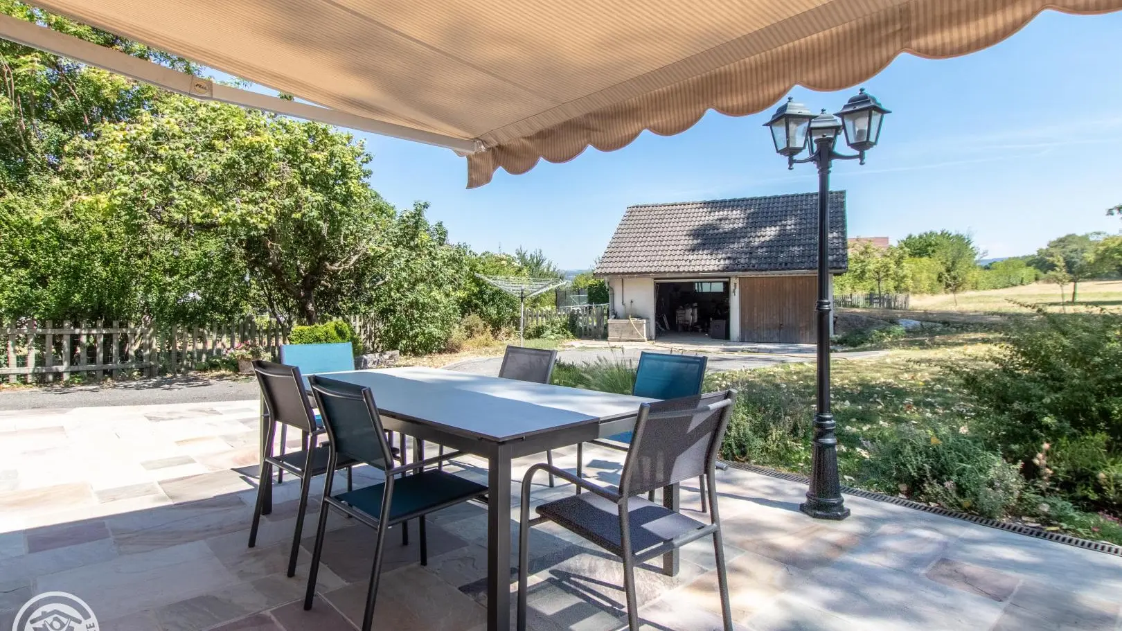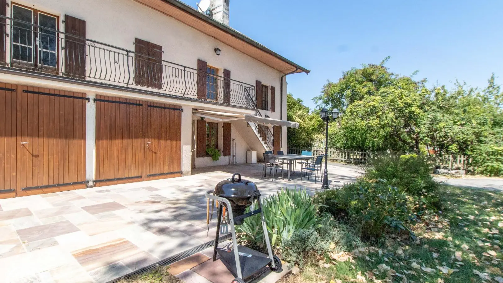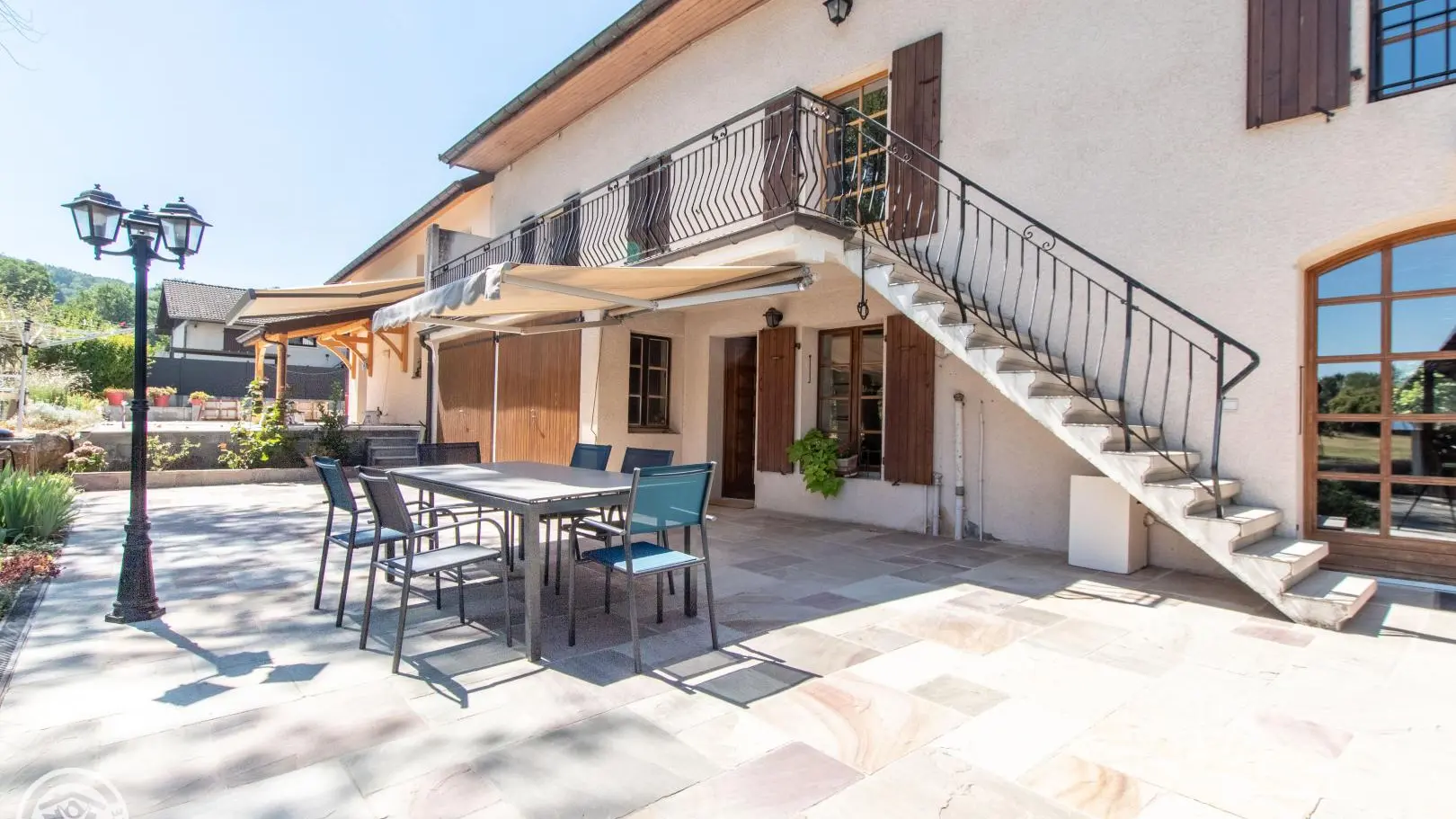Stationnement privatif proche de l'entrée. Vaste terrasse privative (grande table, store banne) et terrain paysagé (avec balançoire). Présence d'un escalier extérieur d'accès à l'étage non-utilisé.