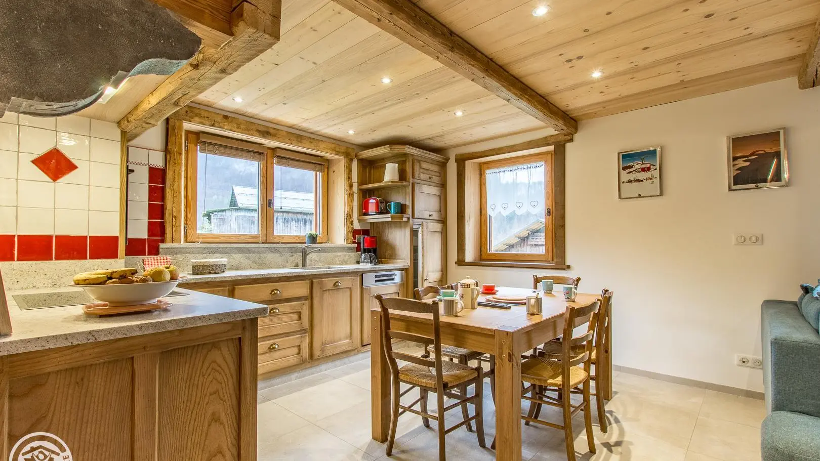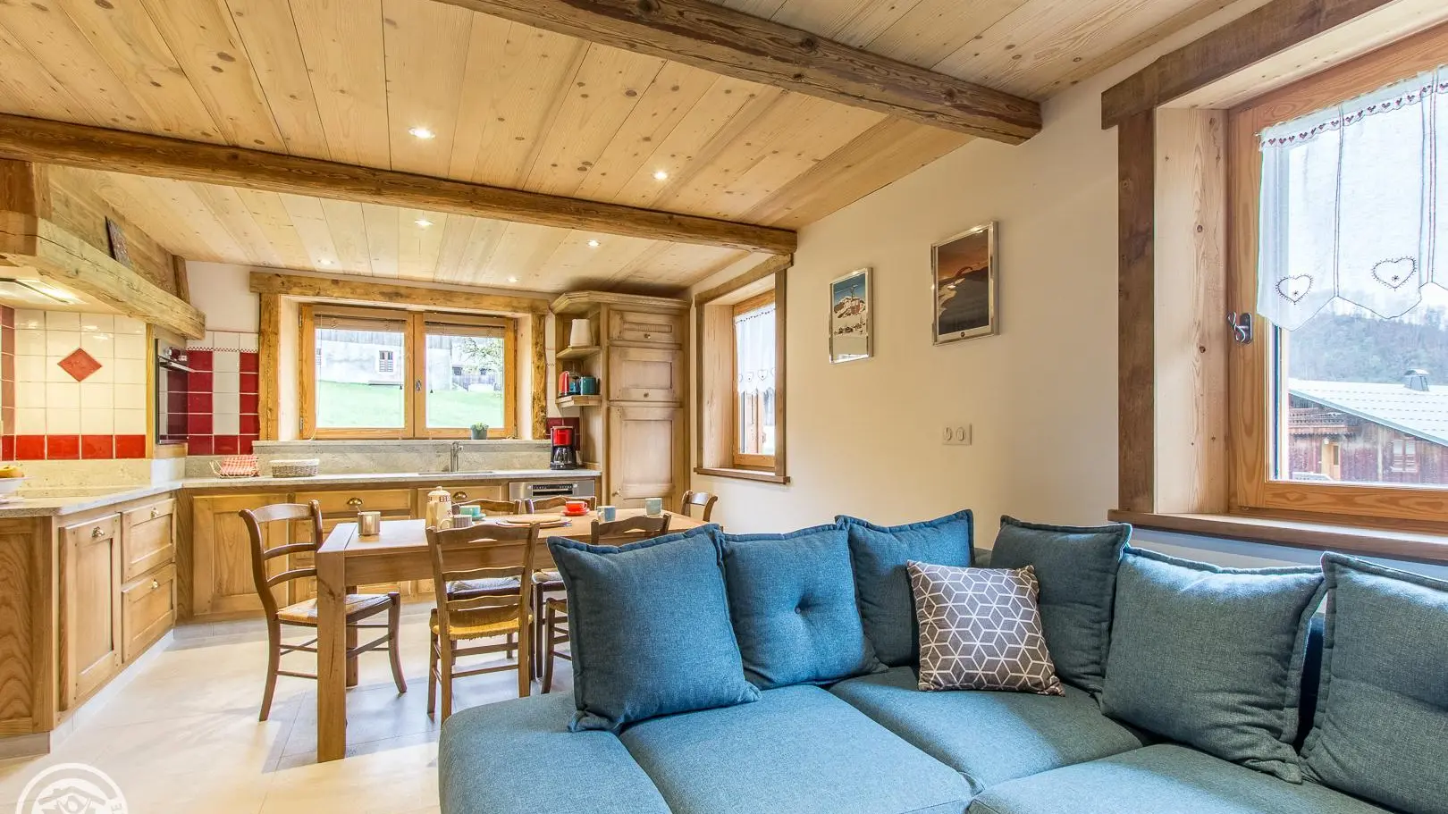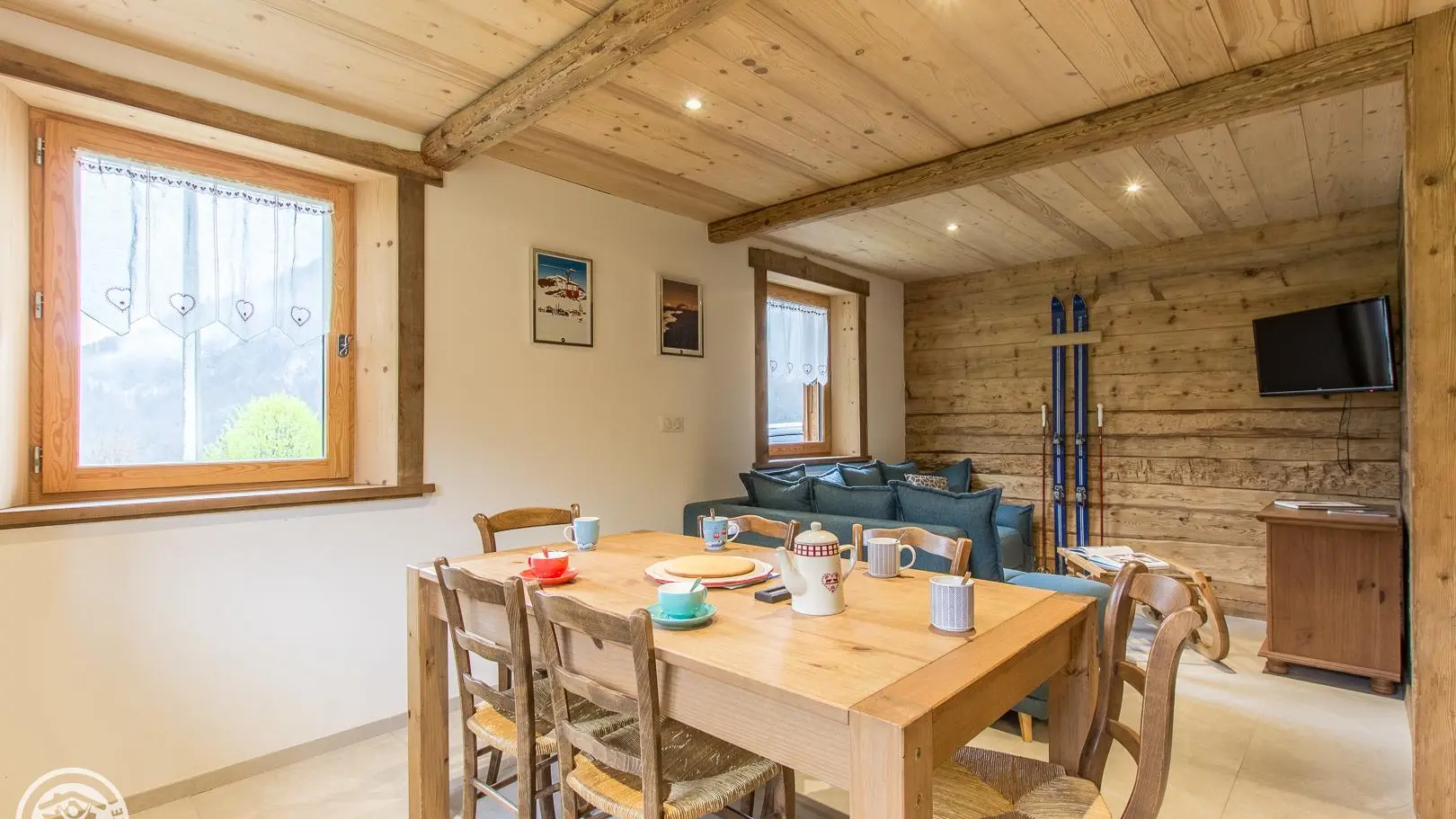 A proximité immédiate des remontées mécaniques de la station familiale de Sixt-Fer-A-Cheval (Grand-Massif) : gîte de 55m2 aménagé de plain-pied au rez-de-chaussée d'un magnifique chalet de montagne comprenant également le logement des propriétaires (à l'étage).