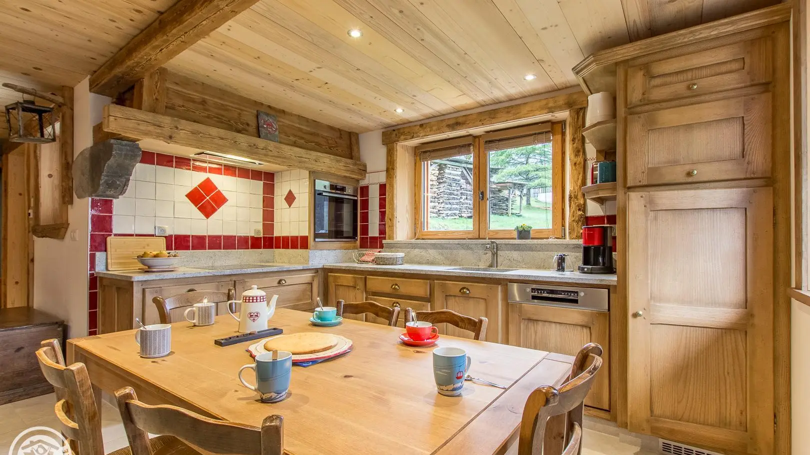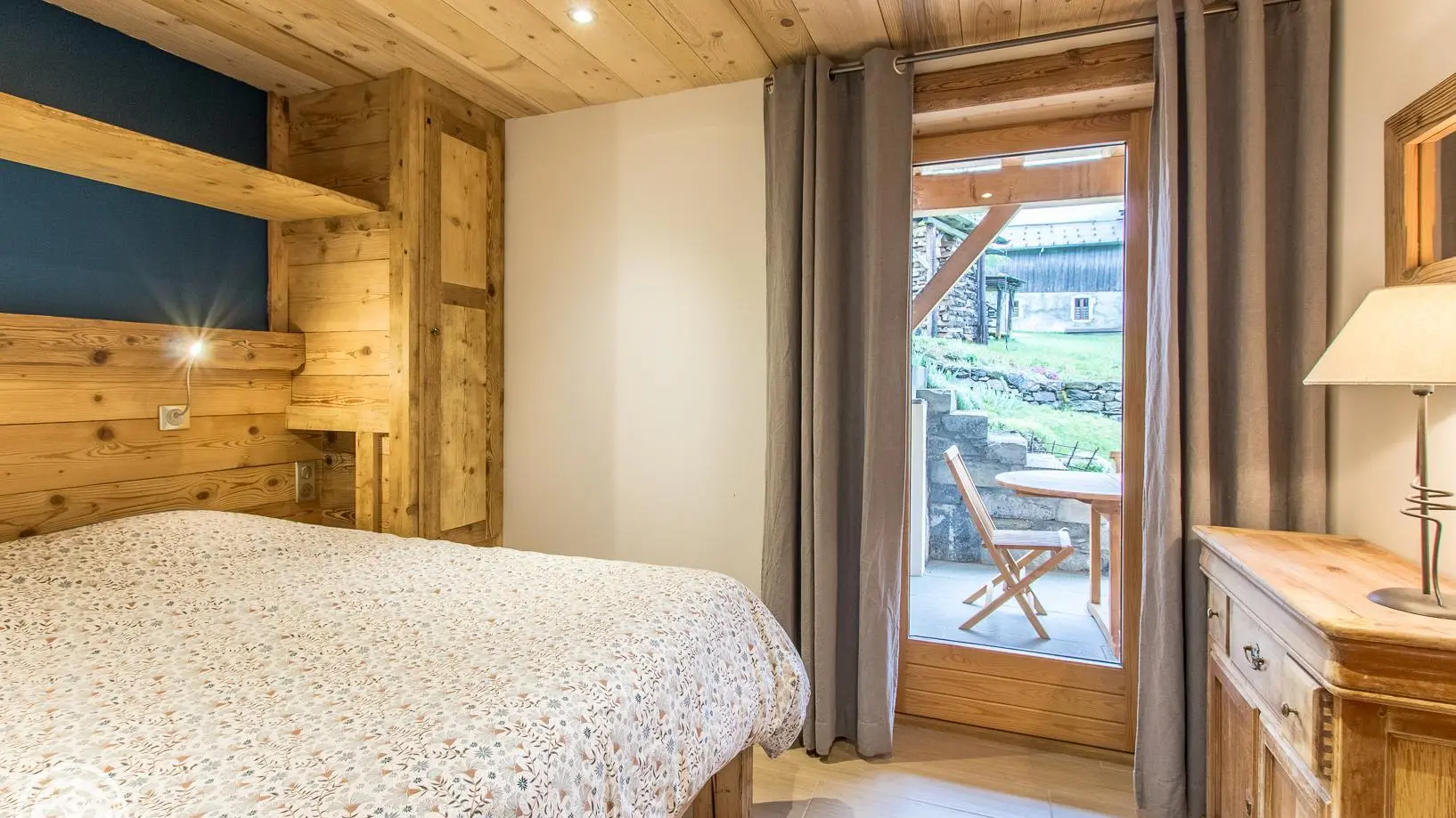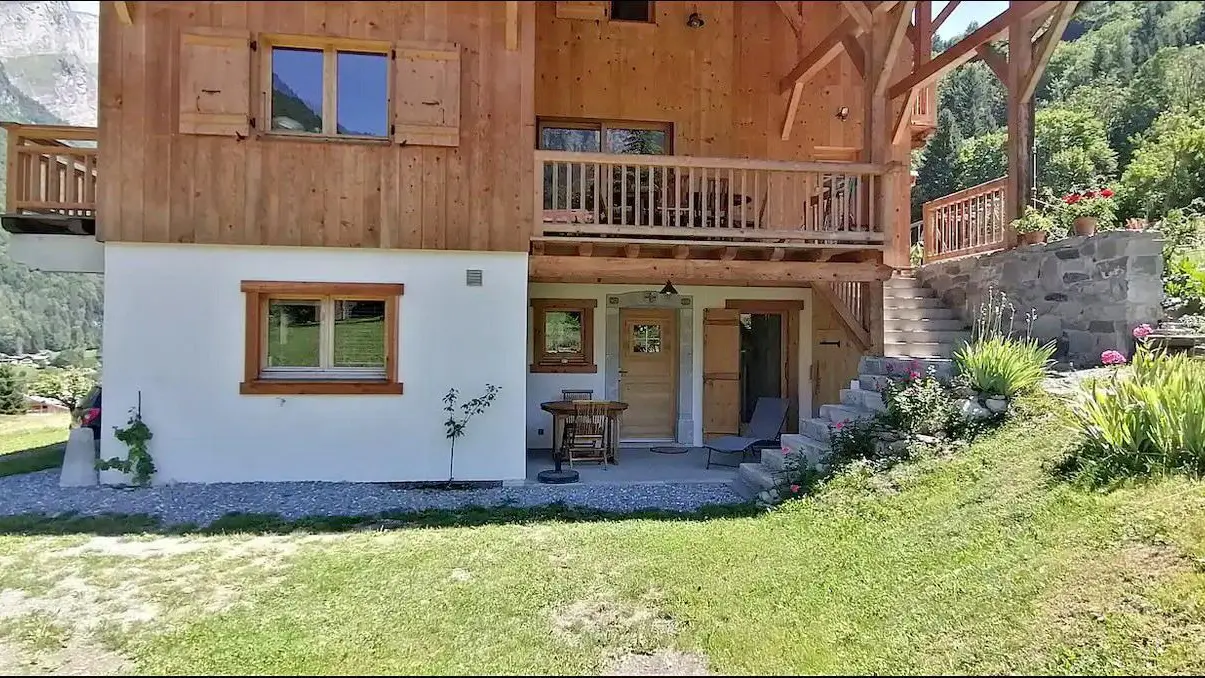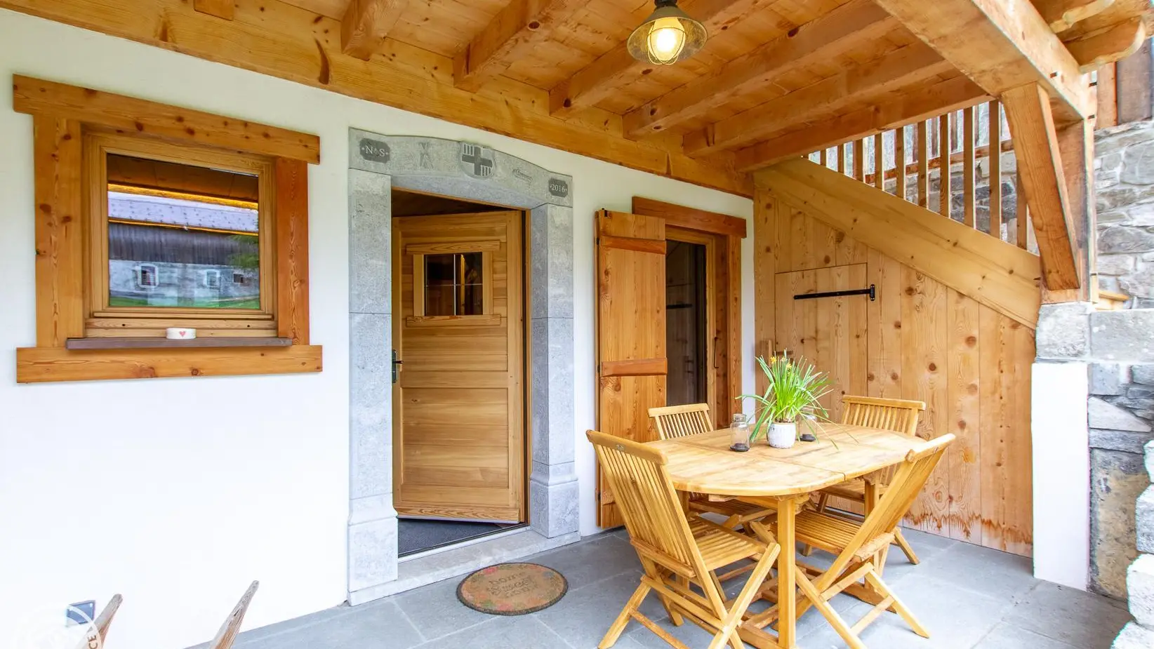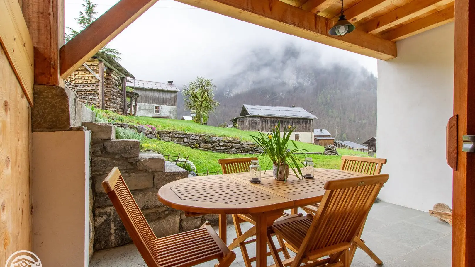 Jardin, terrasse privative couverte Sud-Ouest avec mobilier de jardin (table et chaises), transats et barbecue. Local à ski et vélos sur la terrasse (sécurisé). Stationnement dans la cour du chalet. Commerces de proximité à 900 mètres : supérette, boulangerie, bar, restaurant.