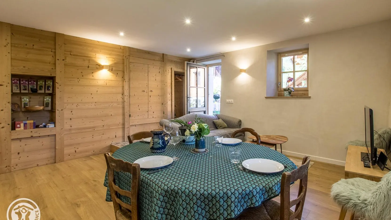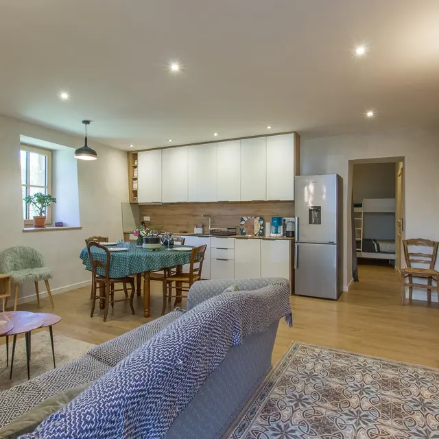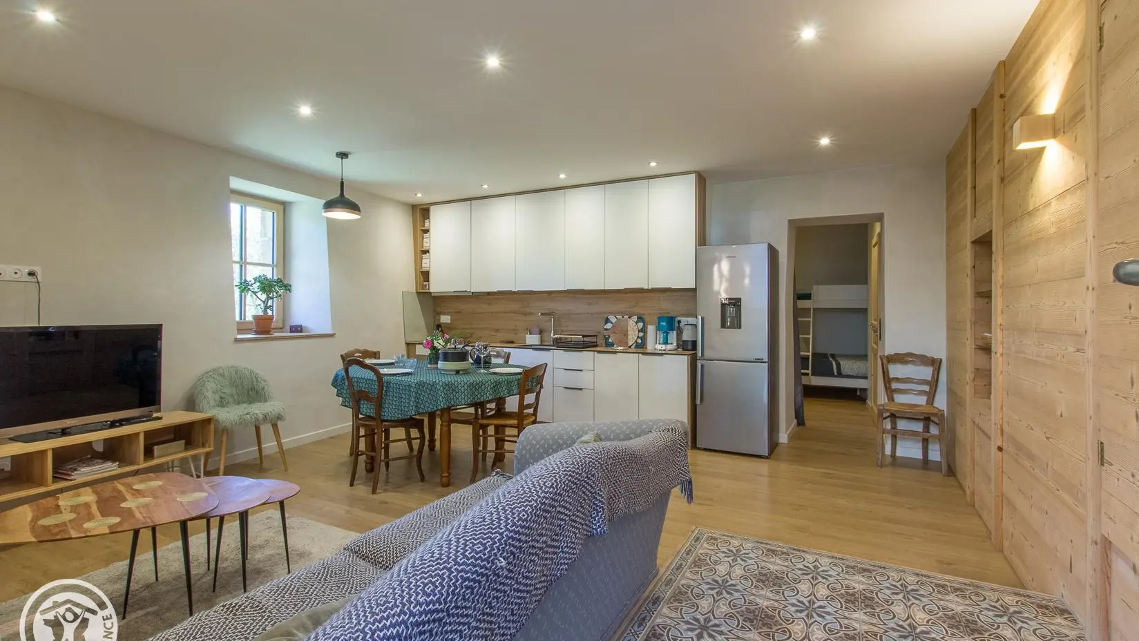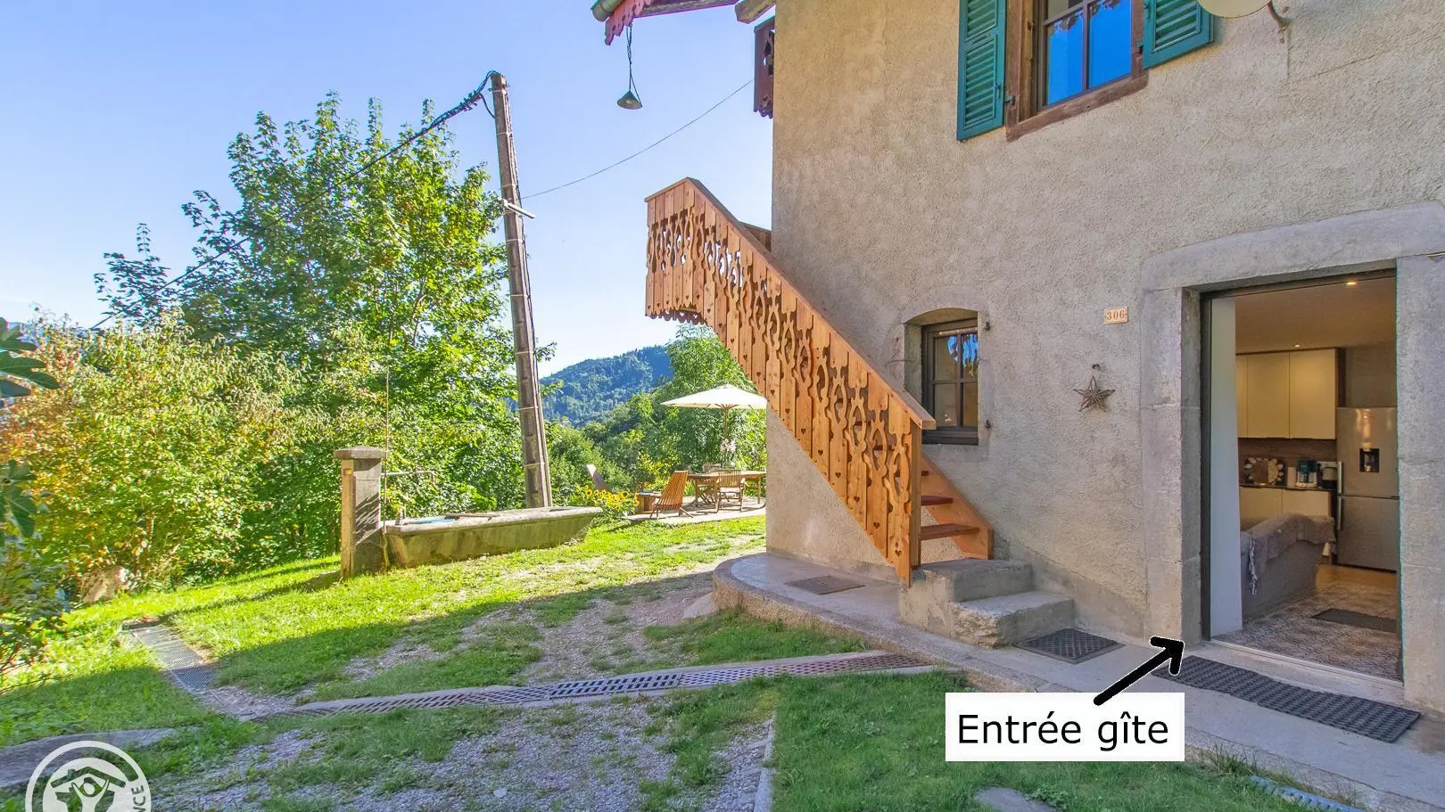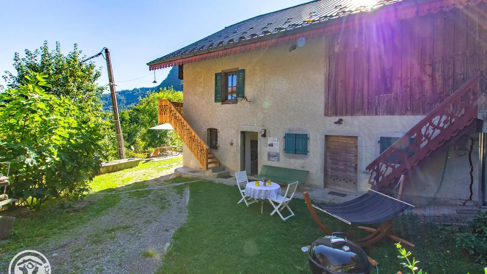 Gîte de 60m2 aménagé de plain-pied (1 marche), au rez-de-jardin d'une ancienne ferme Savoyarde rénovée comprenant également le logement des propriétaires ainsi qu'un autre petit gîte à l'étage.