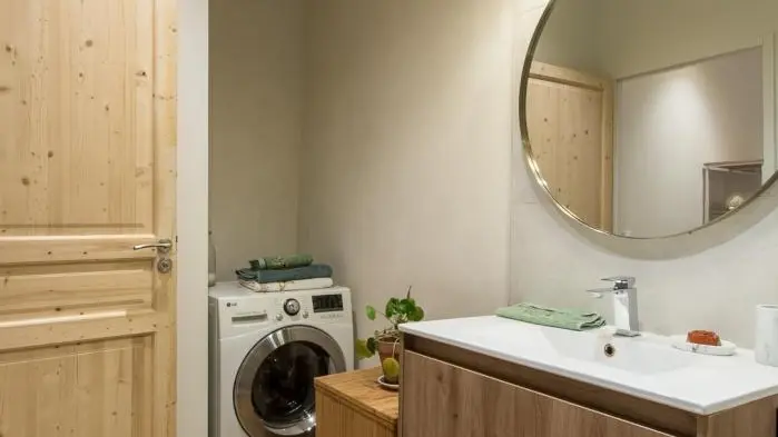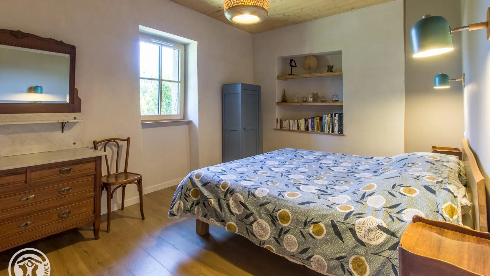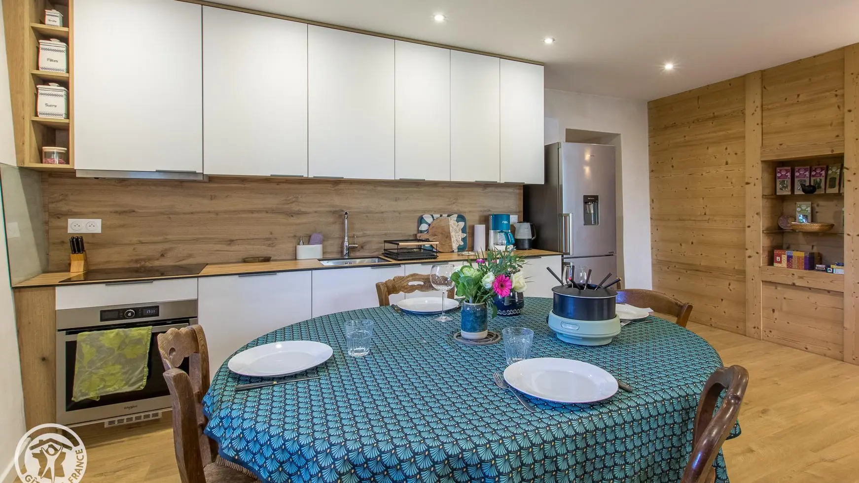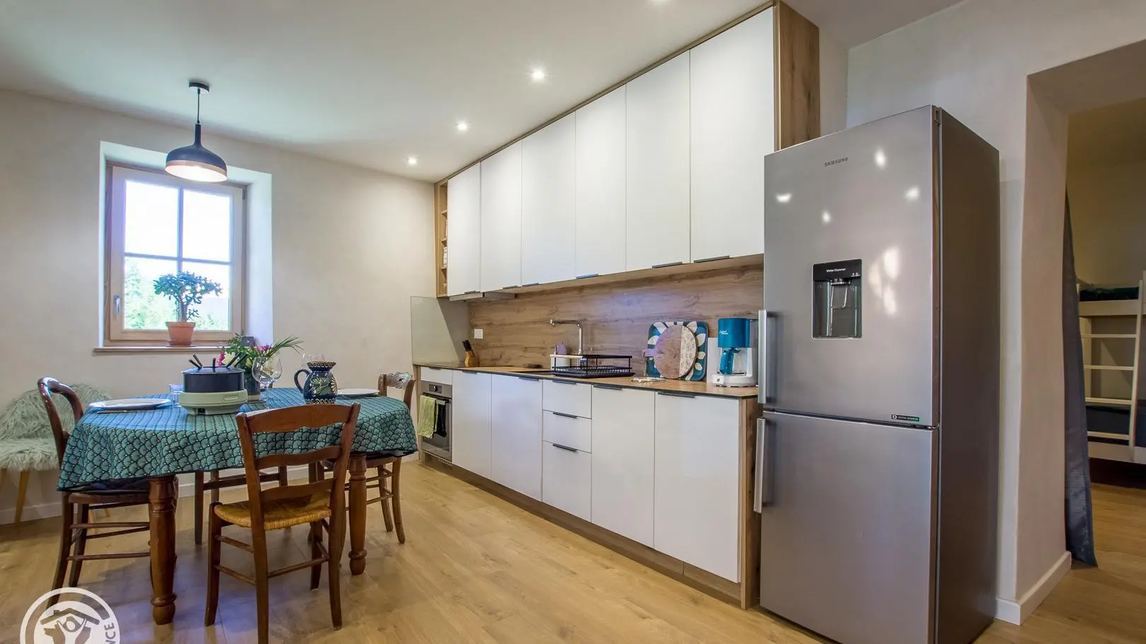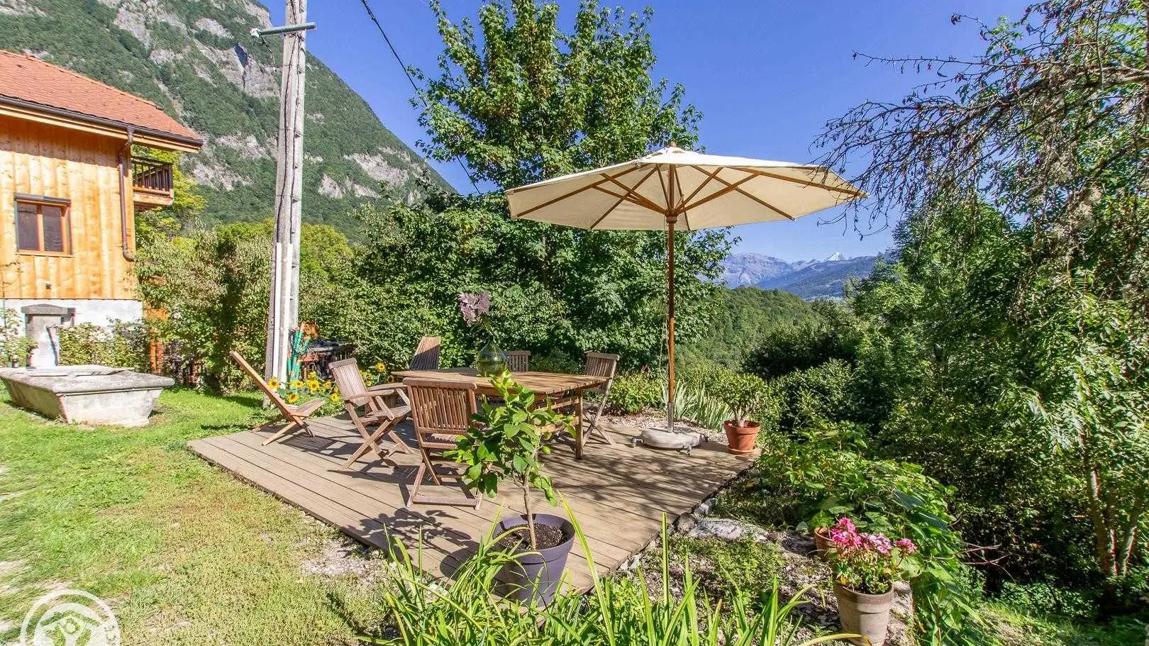 Gîte de 60m2 aménagé de plain-pied (1 marche), au rez-de-jardin d'une ancienne ferme Savoyarde rénovée comprenant également le logement des propriétaires ainsi qu'un autre petit gîte à l'étage.