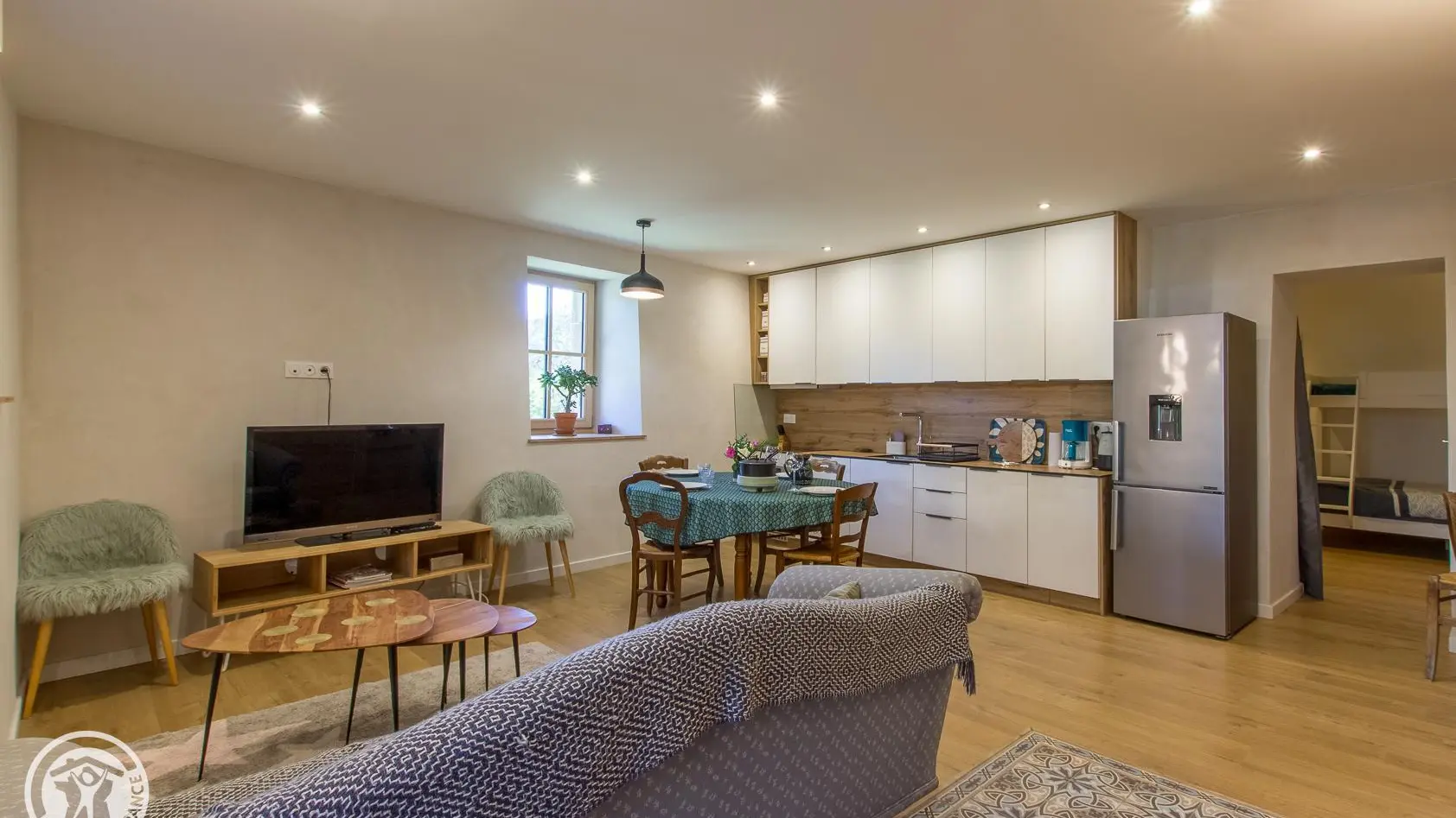 - Pièce de vie avec cuisine intégrée ouverte sur la partie séjour (espace repas, canapé, TV).