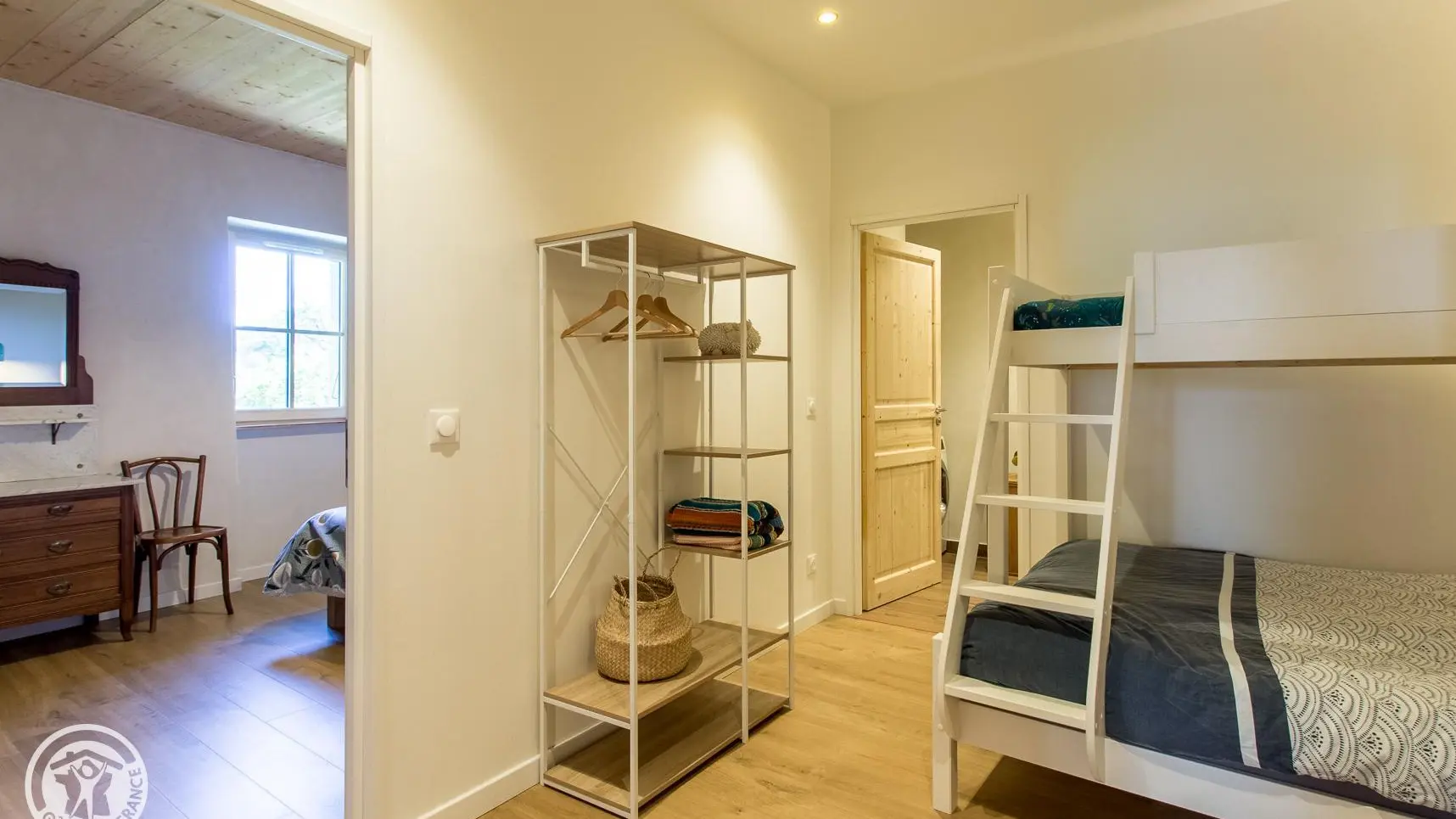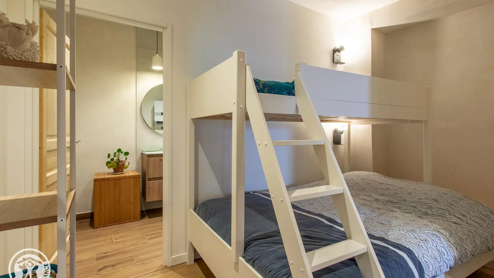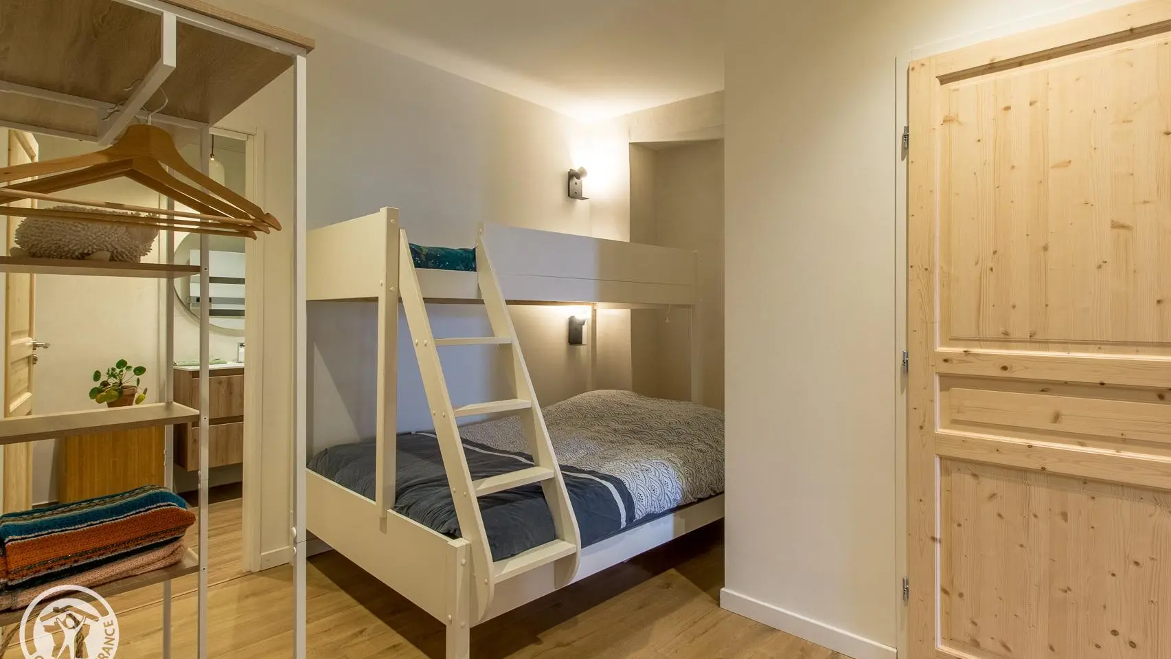 - Coin montagne/espace nuit avec 1 lit 140x200cm + 1 lit superposé 90x200 cm : cet espace est communiquant (de passage), avec la chambre et la salle d'eau et wc.