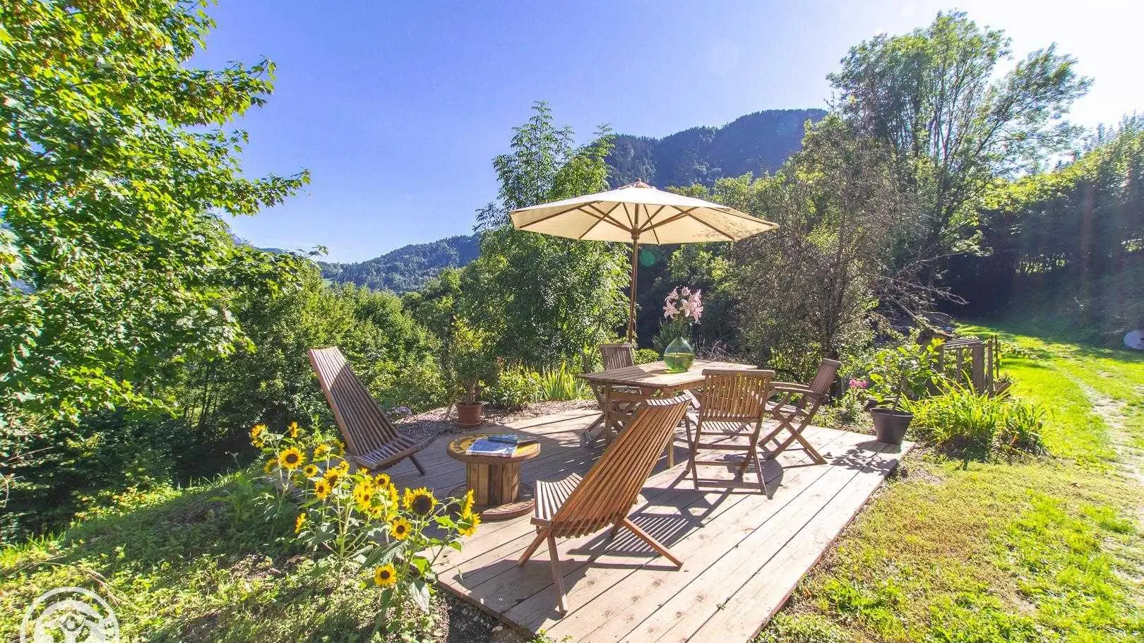Espace terrasse hérboré devant l'entrée du gîte (mobilier de jardin, barbecue) + terrasse bois avec table et chaises et parasol.
