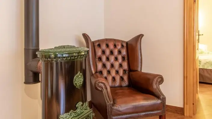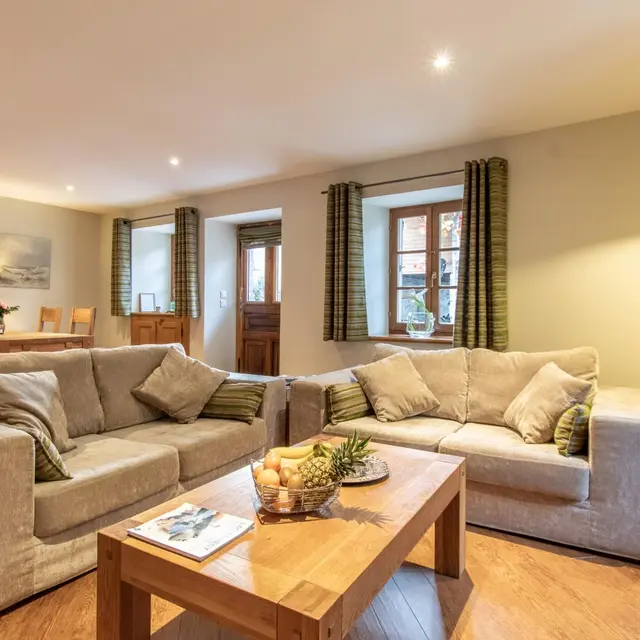 Gîte de 84 m² aménagé en rez-de-chaussée d'une ancienne ferme de pays, entrée indépendante par escalier (larges marches en pierre) avec petit balcon sous une vigne (exposition ouest, équipé table et chaises bistro). Entrée sur le séjour comprenant un poêle à bois vintage (décoratif) avec fauteuil cosy, coin repas et salon avec TV 50 pouces, équipement audio connecté, table basse et deux canapés. Chauffage sol. Large cuisine tout équipée avec de nombreux rangements.