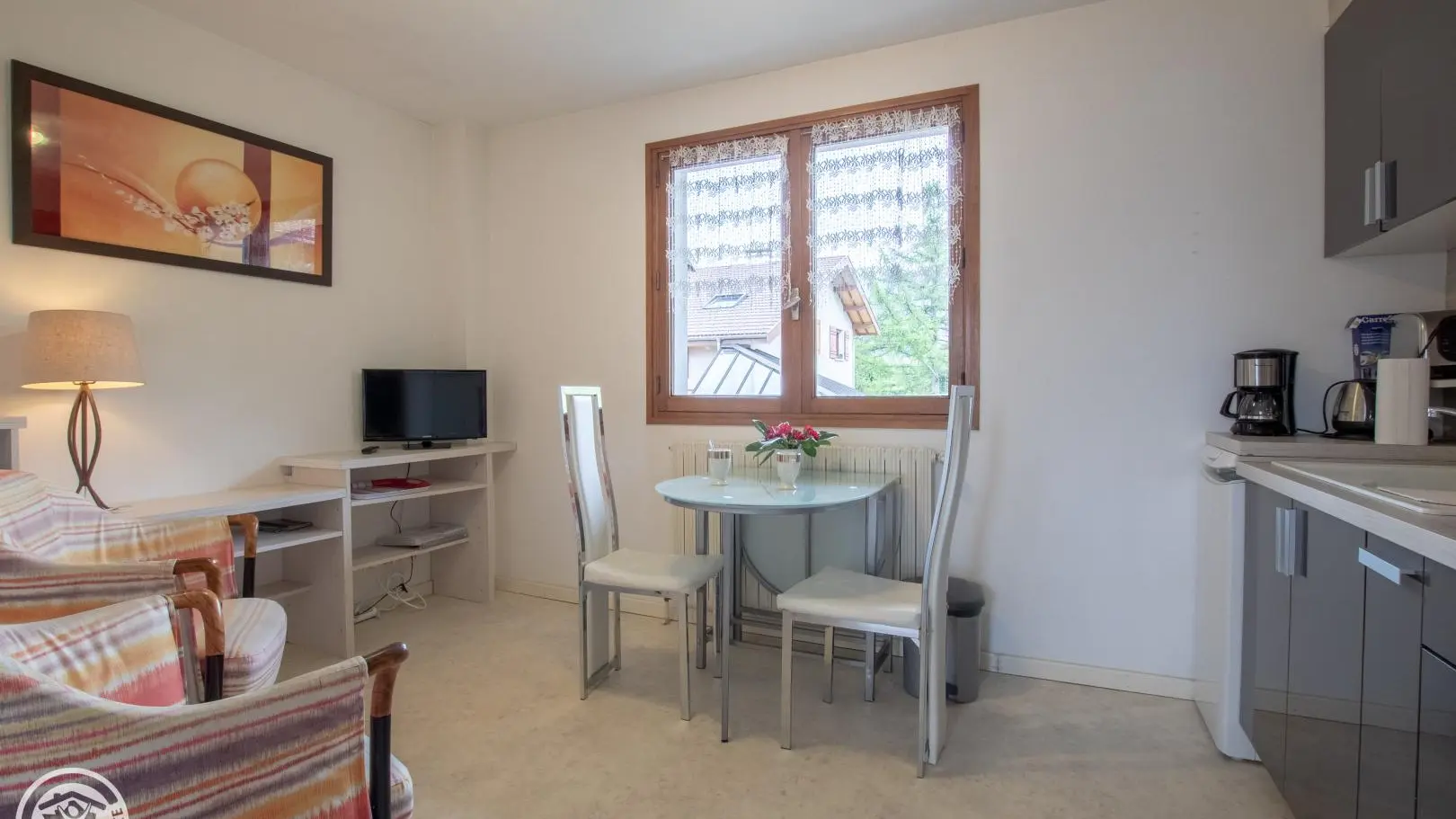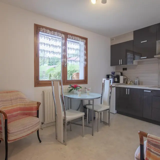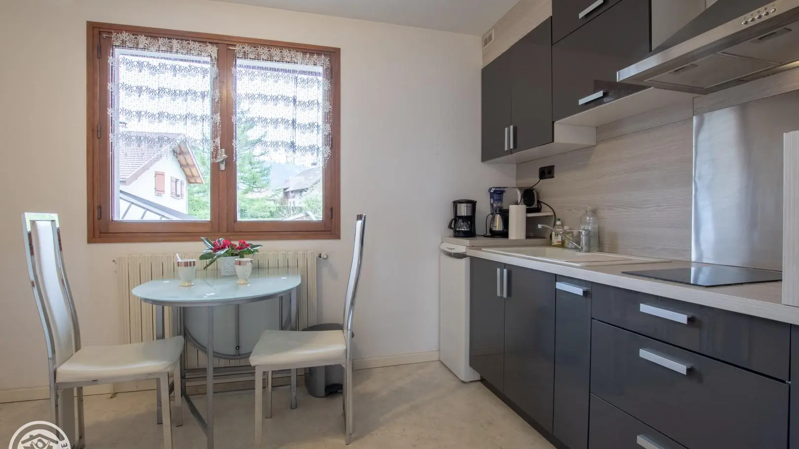 Hall d'entrée, cuisine avec coin détente/TV, chambre avec 1 lit 140cm, accès à la salle d'eau (douche, vasque, sèche-serviettes, WC). Chauffage central. Garage à vélos/motos commun. Parking commun devant la maison. Possibilité de location draps. Baignade, pêche au lac d'Annecy à 900m, ville d'Annecy à 7km, piste cyclable reliant Annecy à Albertville à 800m. Domaine skiable du Semnoz à 20km (ski de piste, fond, raquettes, balades). Nombreuses promenades et randonnées sur sentiers balisés et en forêt autour du gîte. Numéro d'enregistrement : 74267 000014 HQ