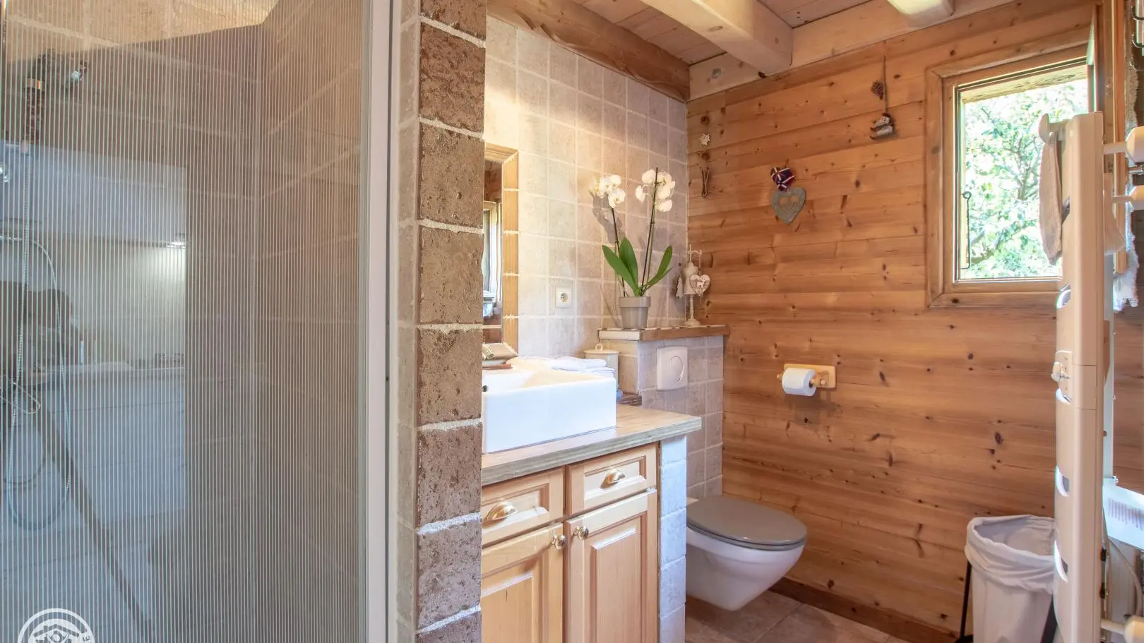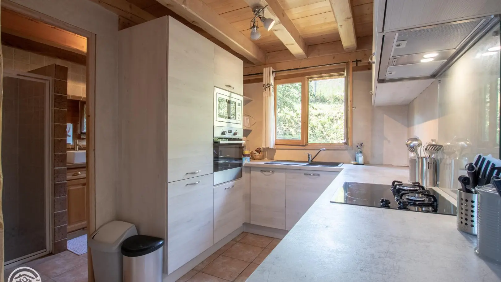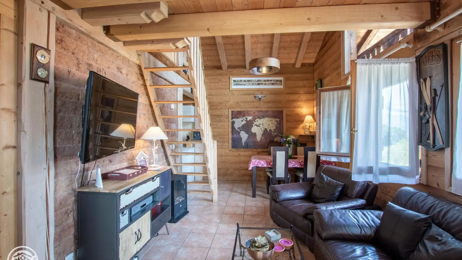 Le chalet est mitoyen avec un autre gîte 2 personnes (chacun dispose de son entrée indépendante). Accès par escaliers. Au 1er niveau : séjour, espace repas, cuisine intégrée, Chambre 1 (1 lit 140), salle d'eau avec wc. A l'étage : grande mezzanine très mansardée (1,75m au plus haut - .33 au plus bas) avec coin nuit (1 lit 140 + possibilité lit d'appoint), et coin détente (canapé, bibliothèque). Possibilité de location des draps (lits faits à votre arrivée). Lave-linge et sèche-linge sur demande.