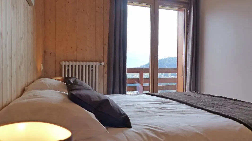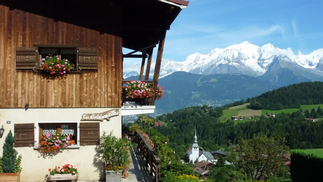 Avec vue panoramique sur la chaîne du Mont Blanc,chalet dominant le village, au calme, et comprenant 3 gîtes+logement des propriétaires. 1er gîte (58 m2): 1er étage: cuisine, séjour (1 lit 1 pers + banquette clic clac 2 pers, TV) chambre (1 lit 2 pers....
