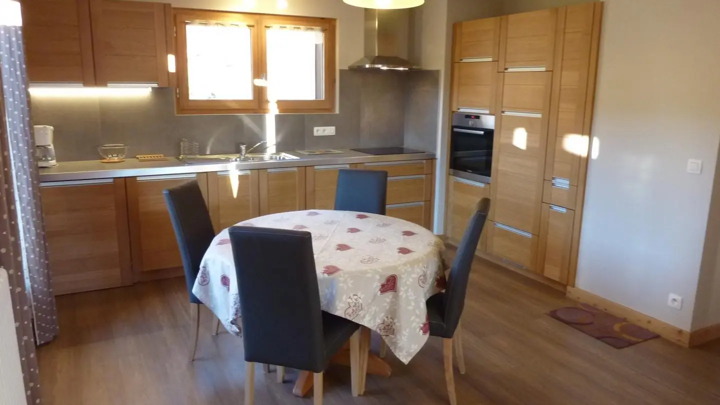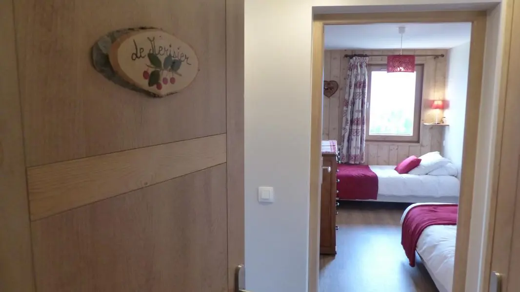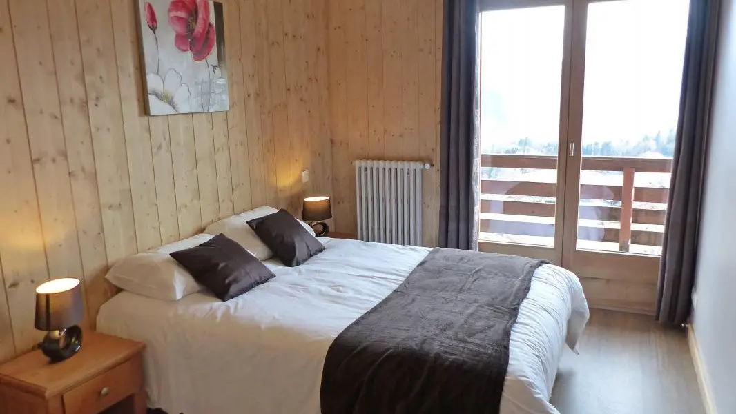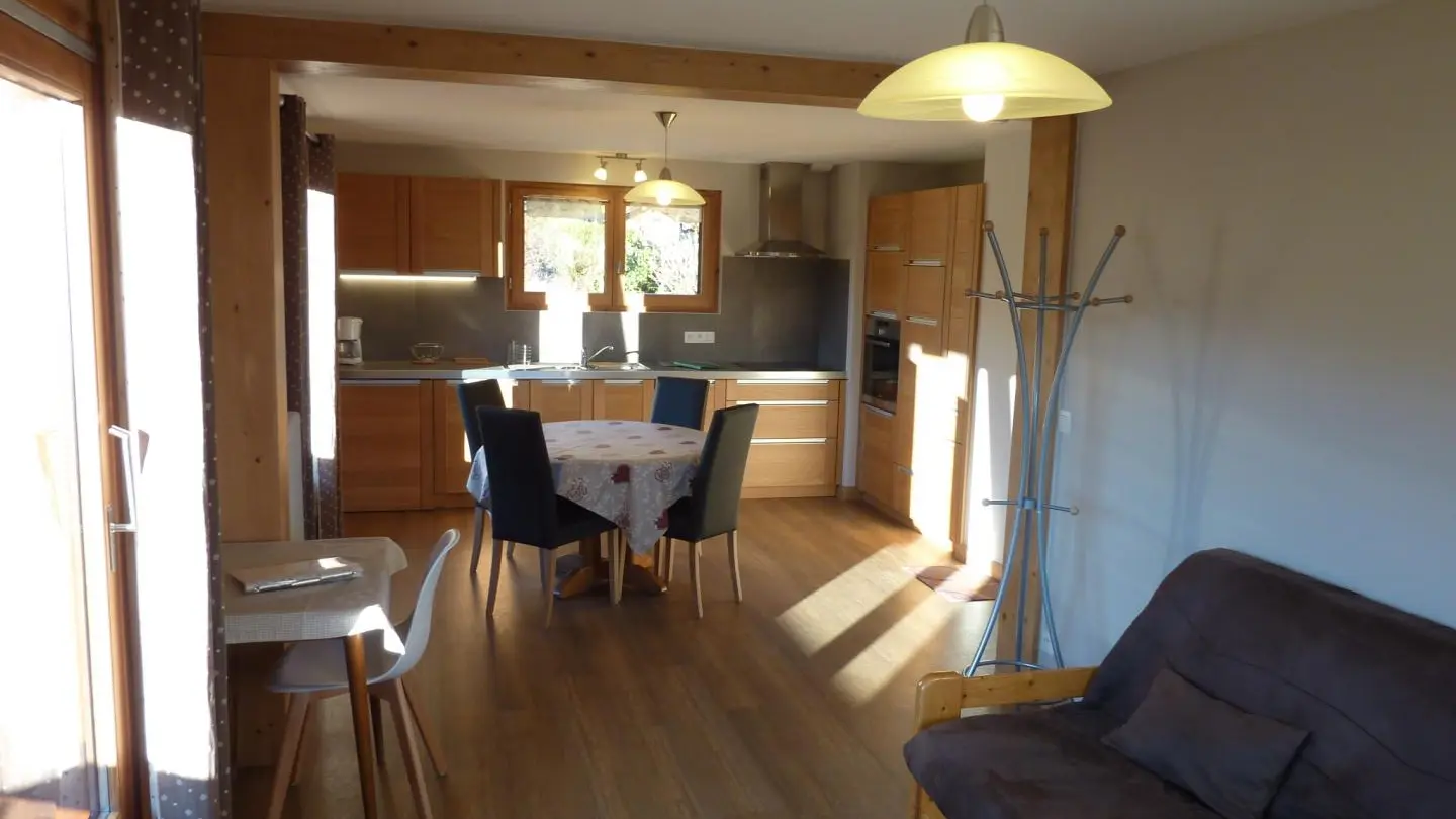 Avec vue panoramique sur la chaîne du Mont-Blanc, chalet dominant le village, au calme, comprenant 3 gîtes et logement des propriétaires. Gîte de 58m2 aménagé au 1er étage: cuisine intégrée ouverte sur séjour (Tv, canapé), chambre 1 (1 lit 140x190), chambre 2 (2 lits 90x190). Salle d'eau (douche), wc indépendant. internet Wifi. Chauffage central. Balcon Sud et Est face au Mont-Blanc. En commun: table forestière avec barbecue. Possibilité de louer les draps. Parking privé.. Station de Cordon à 2km, et navette gratuite à 200m en hiver. Station de Combloux à 5km, Megève à 10km.